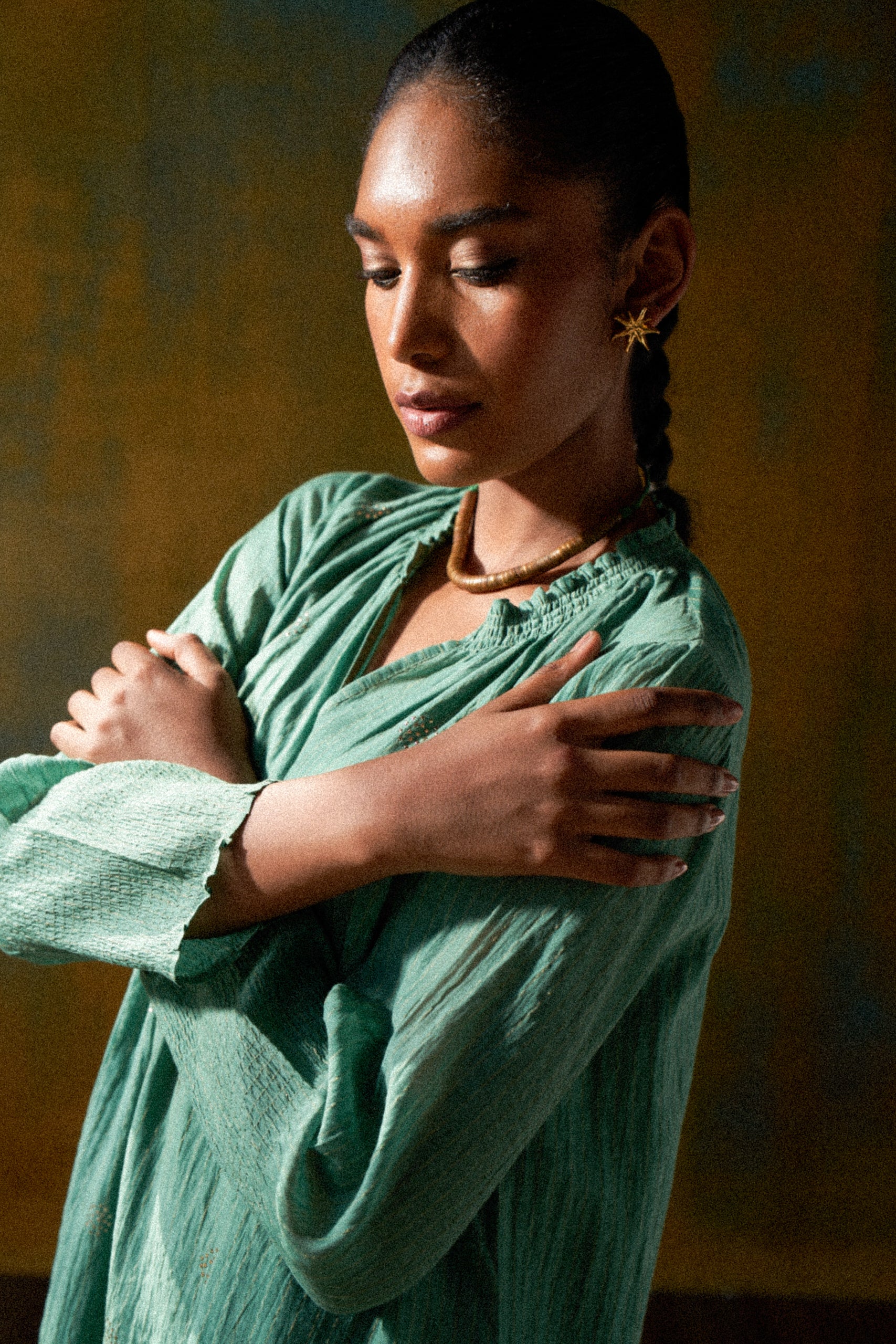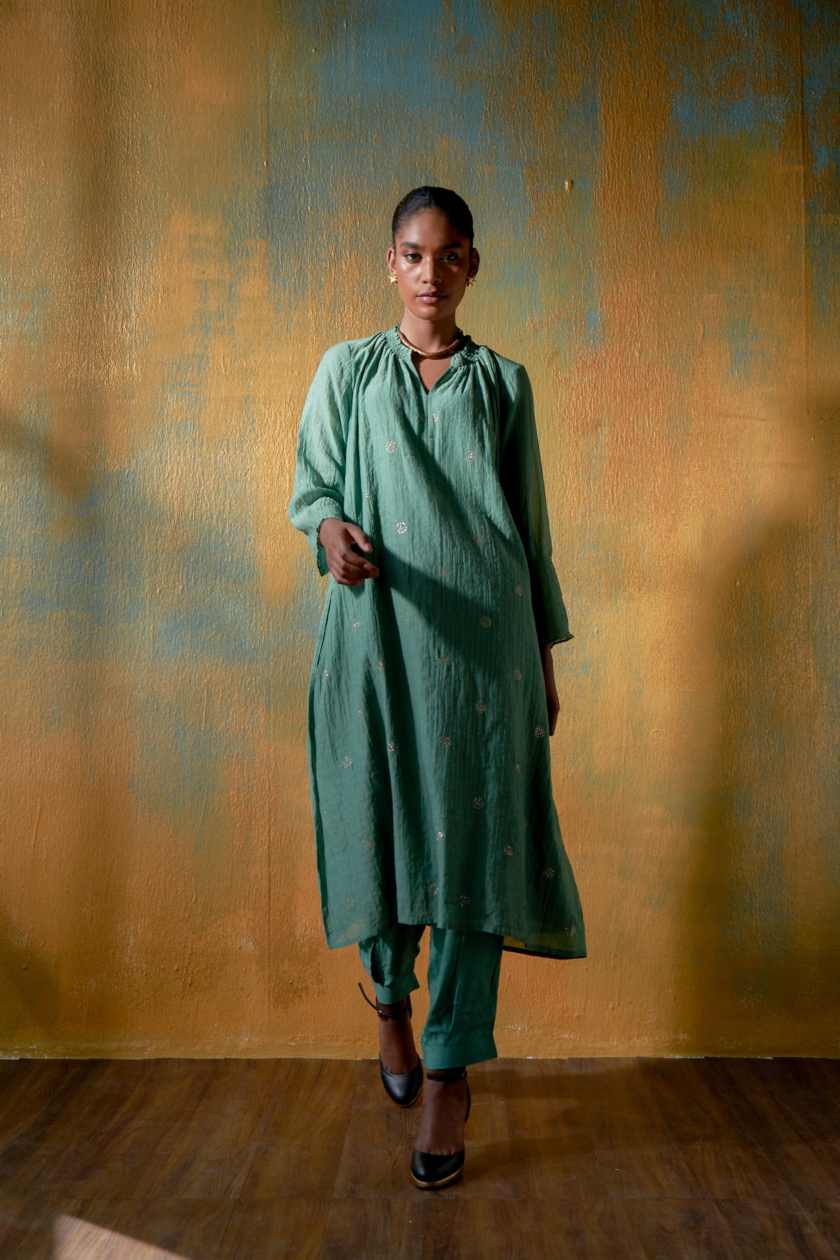 Indulge yourself with the gorgeous Bel embroidered Kurta & pant set. Boasting a gathered smocked neckline and textured sleeves, this piece is beautifully adorned with Kaamdani embroidered buttis allover and adds an elegant touch. The diaphanous chanderi is soft and lightweight, making it the perfect choice for any occasion. Experience effortless style and sophistication with this exquisite kurta.