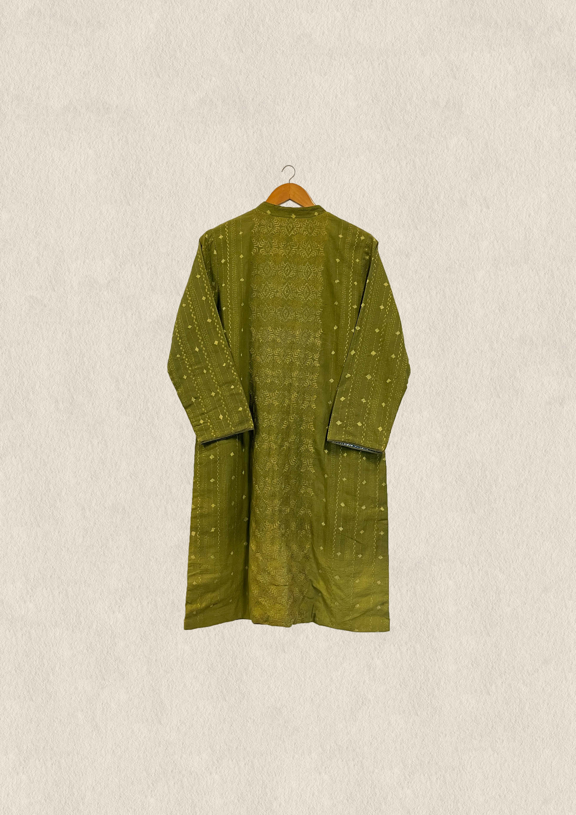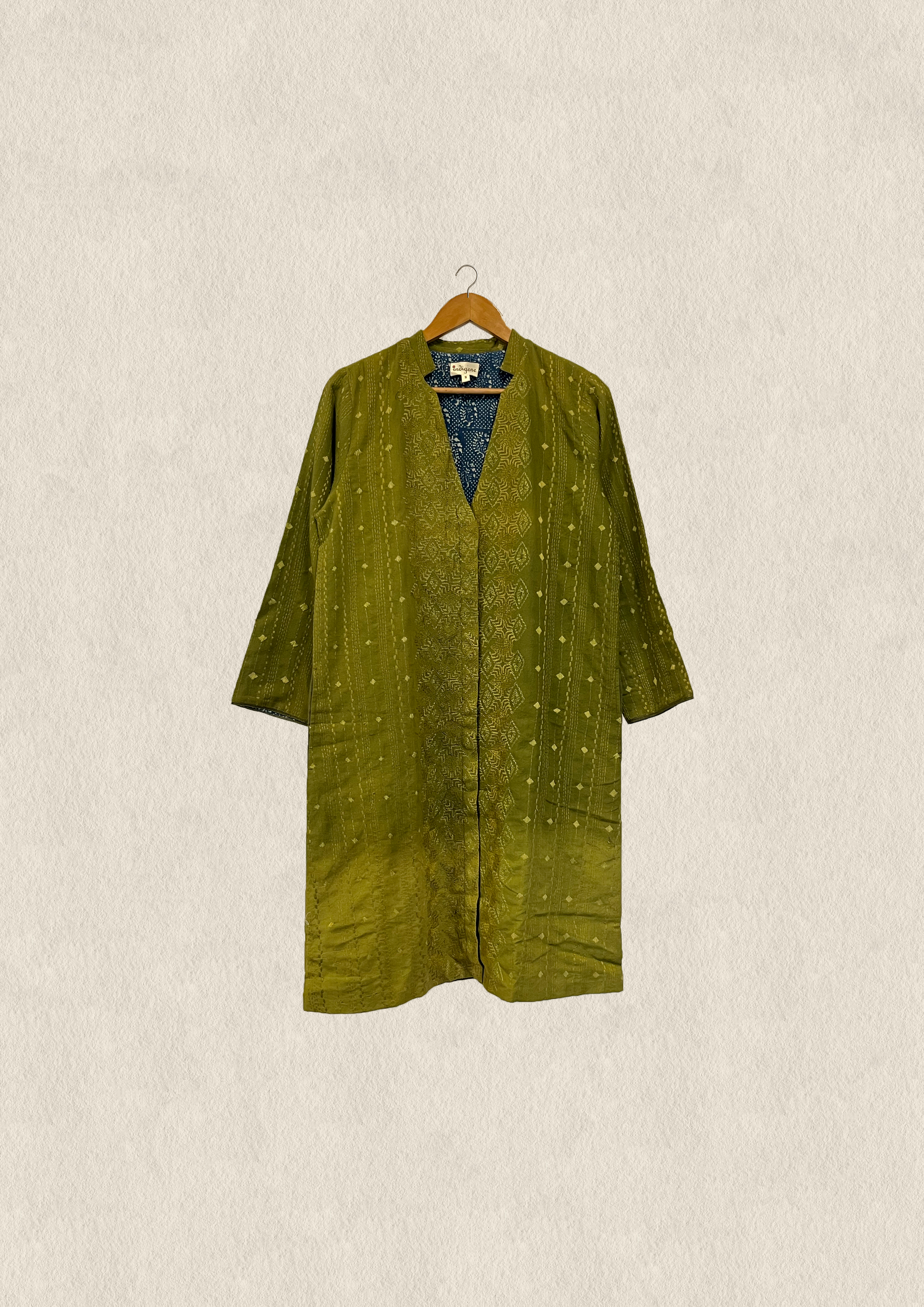 This long dip dyed button down Jacket with intricate hand embroidery, serves as a multipurpose garment. The hand embroidered sujni detail makes it an elegant piece of textile to have. Team it up with a pair of trousers, a dress or go experimental with a combination of layers. Exquisitely embroidered and lined with hand printed ajrakh.