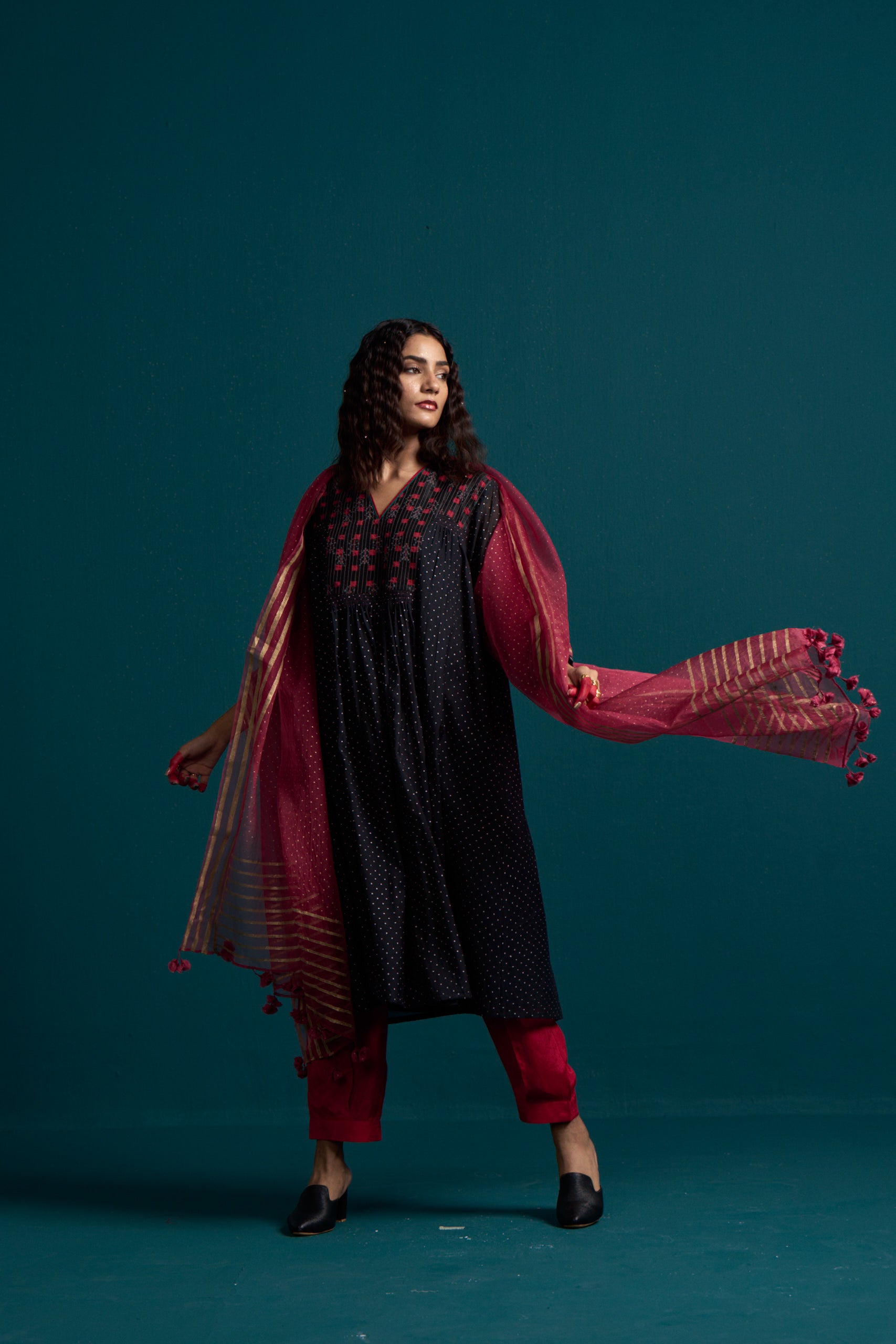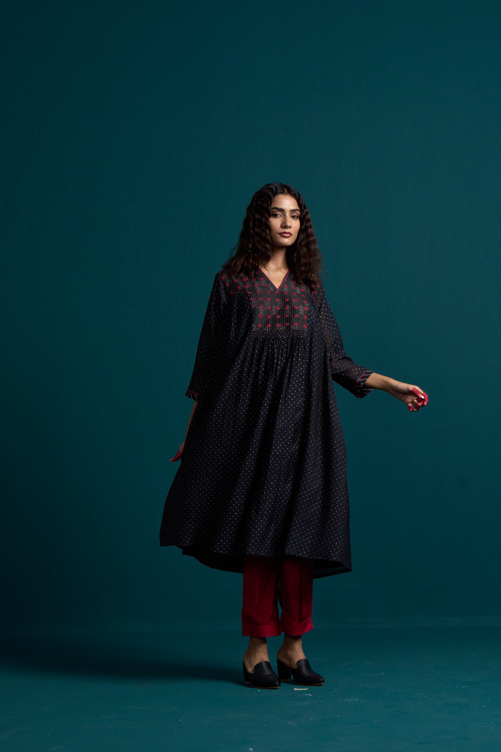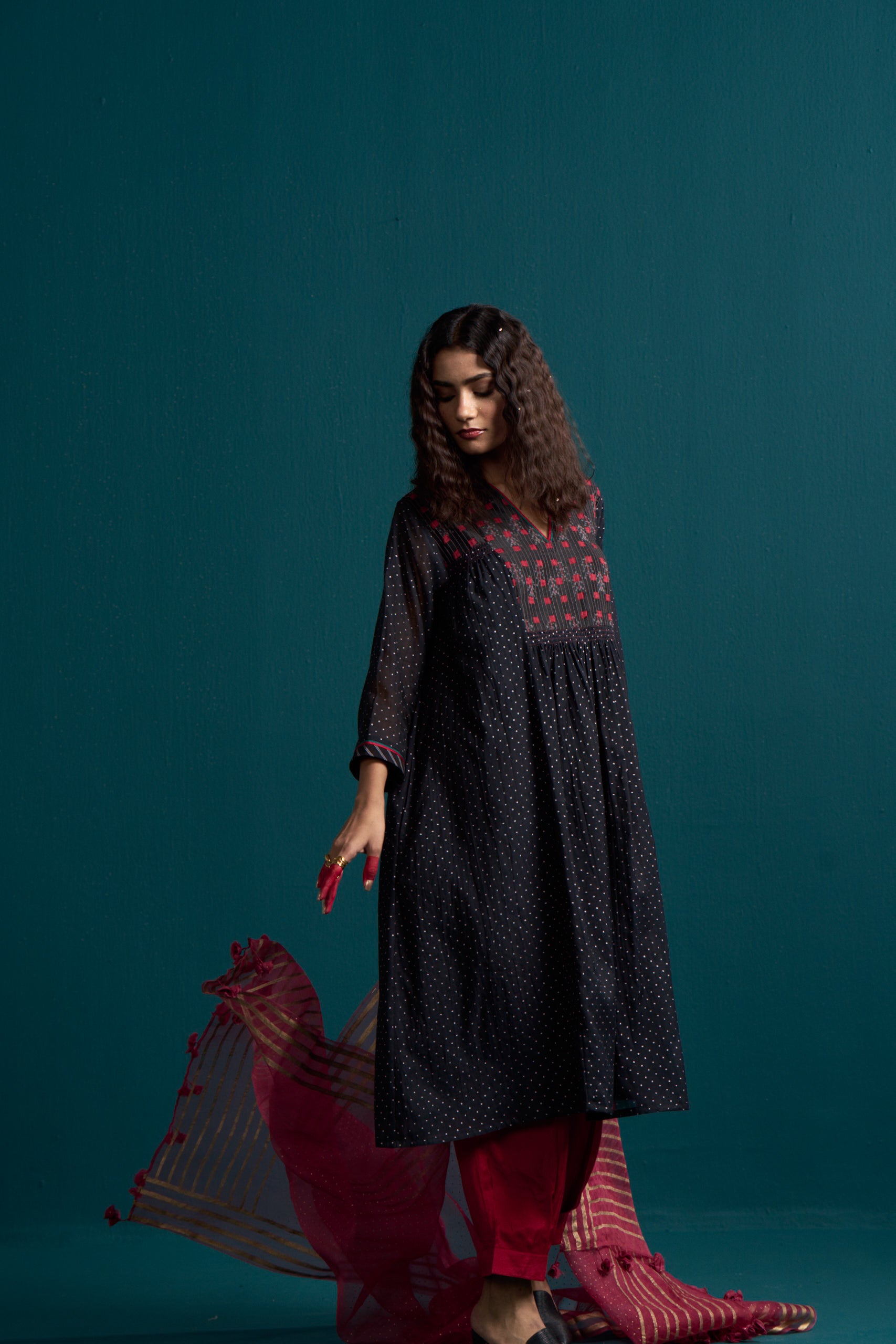 Make a statement with our luxurious Shahrang Hand printed cutwork kurta. The intricate detailed stitching and elegant long length exude sophistication. Crafted from a blend of silk cotton and chanderi, this kurta is perfect for a special night out. Its black color reminiscent of a starry night sky adds a touch of mystery and allure.