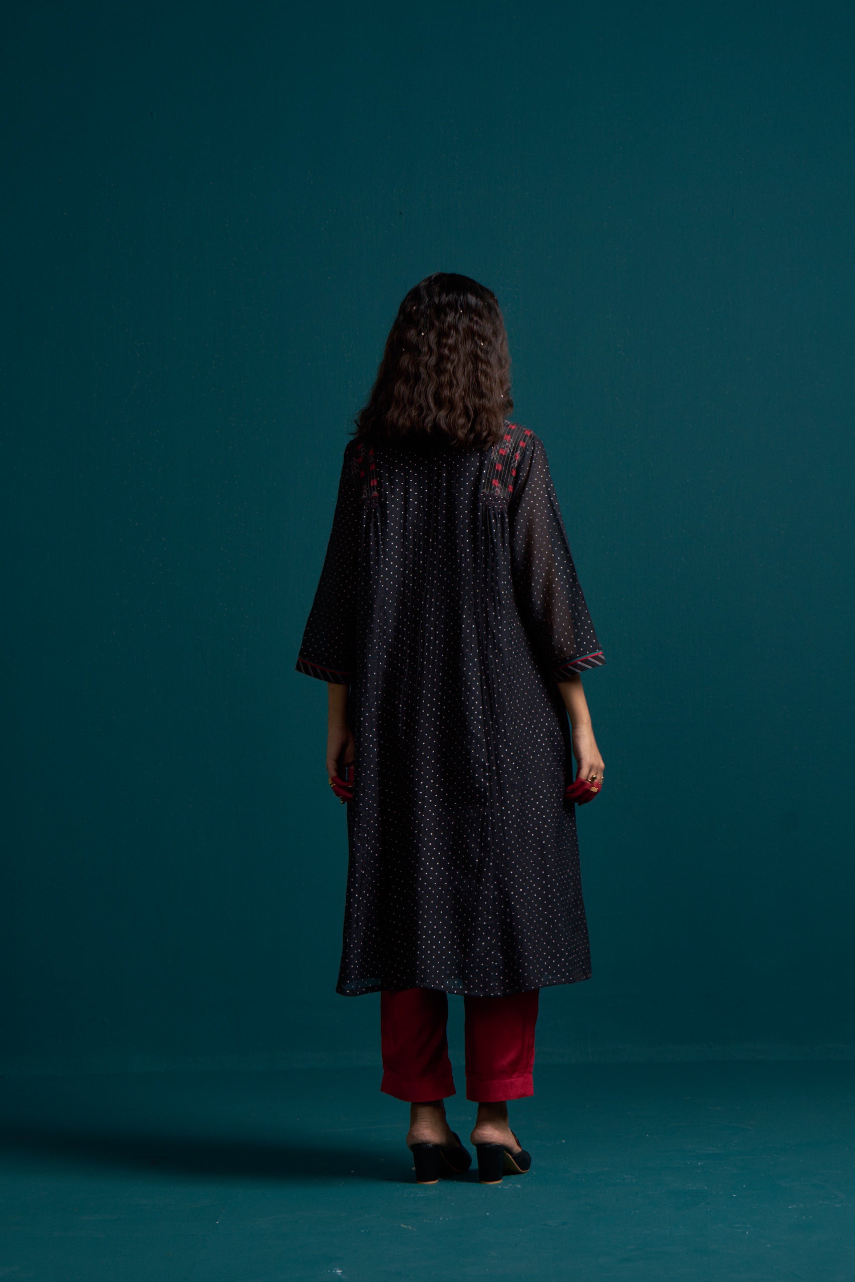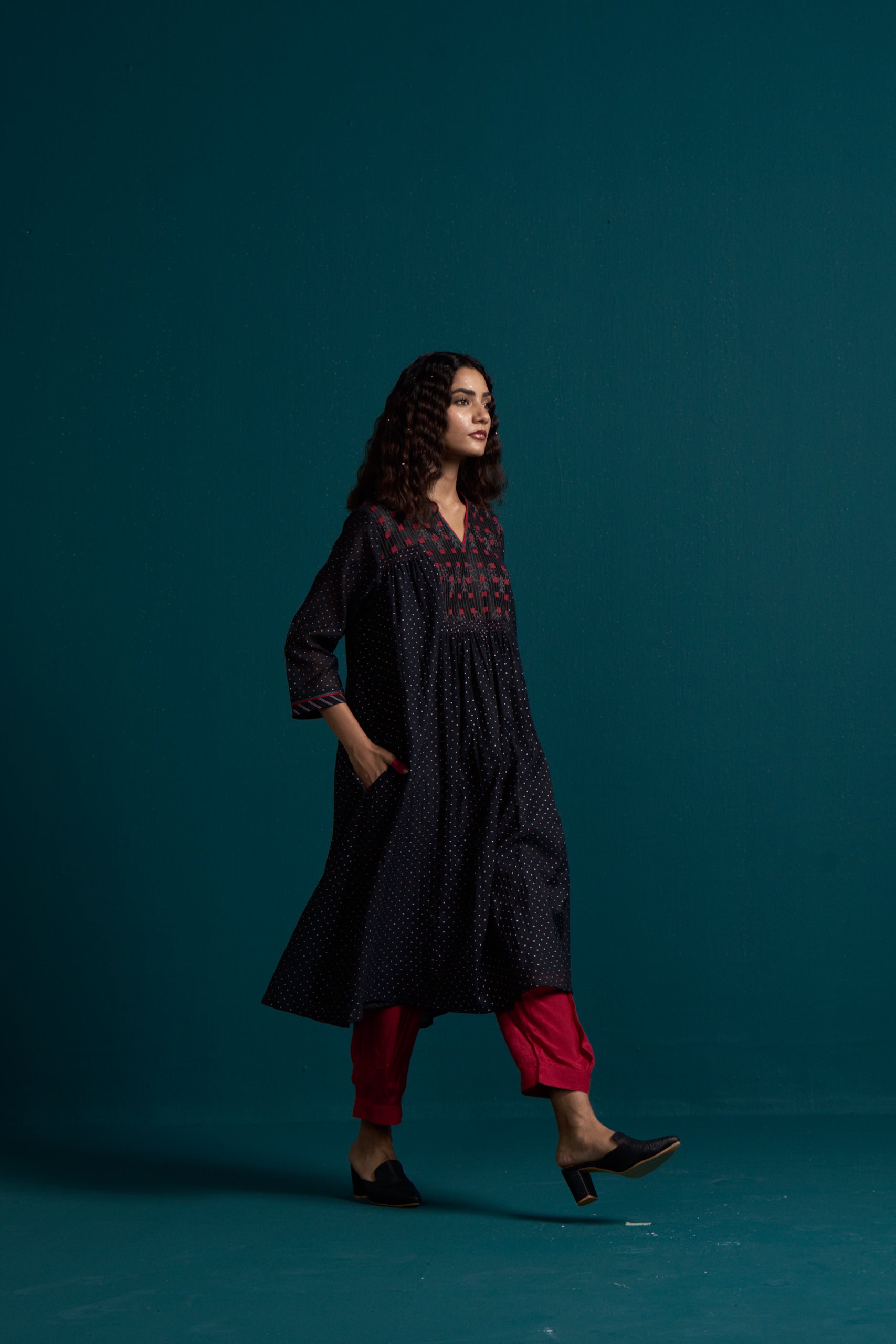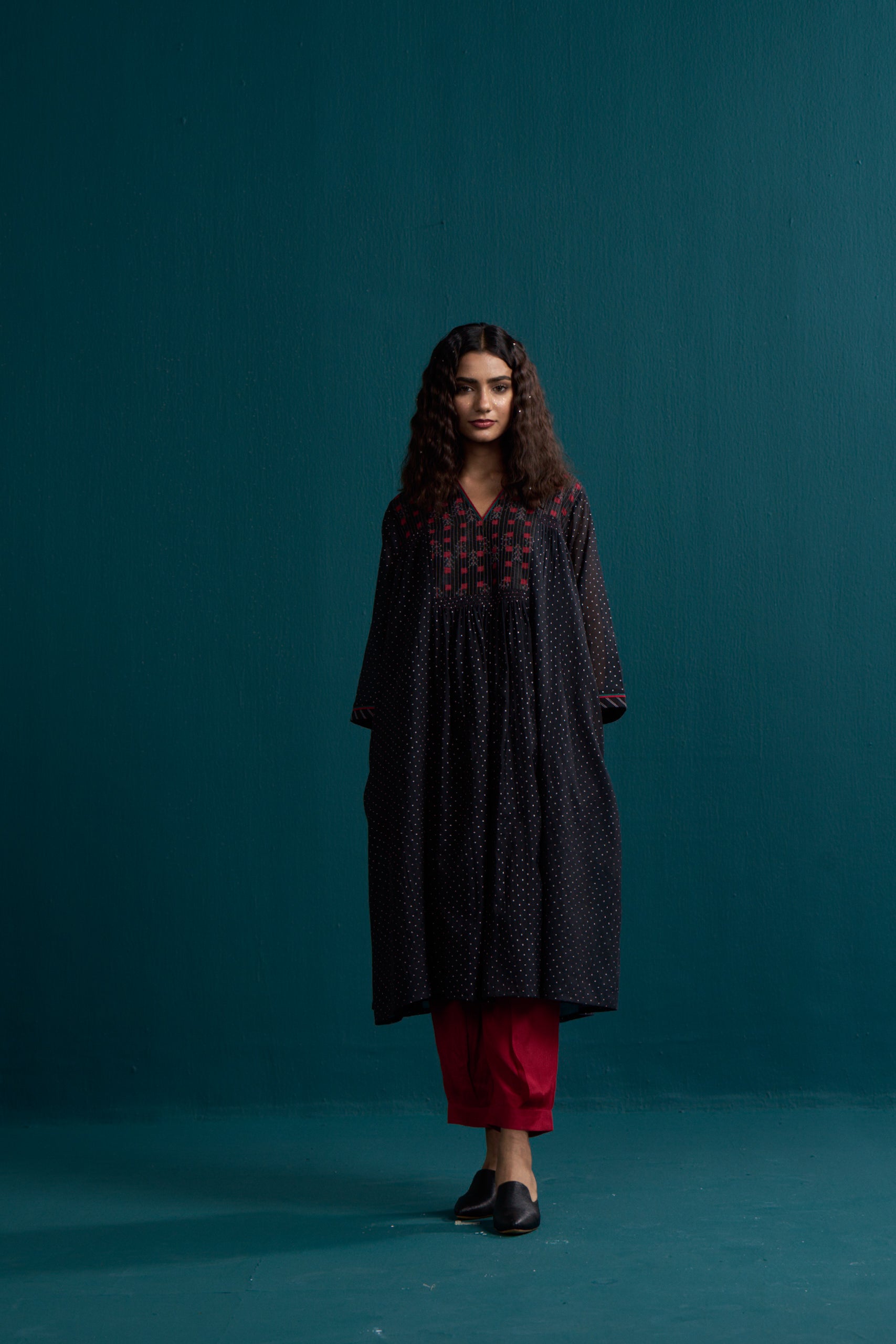 Make a statement with our luxurious Shahrang Hand printed cutwork kurta. The intricate detailed stitching and elegant long length exude sophistication. Crafted from a blend of silk cotton and chanderi, this kurta is perfect for a special night out. Its black color reminiscent of a starry night sky adds a touch of mystery and allure.