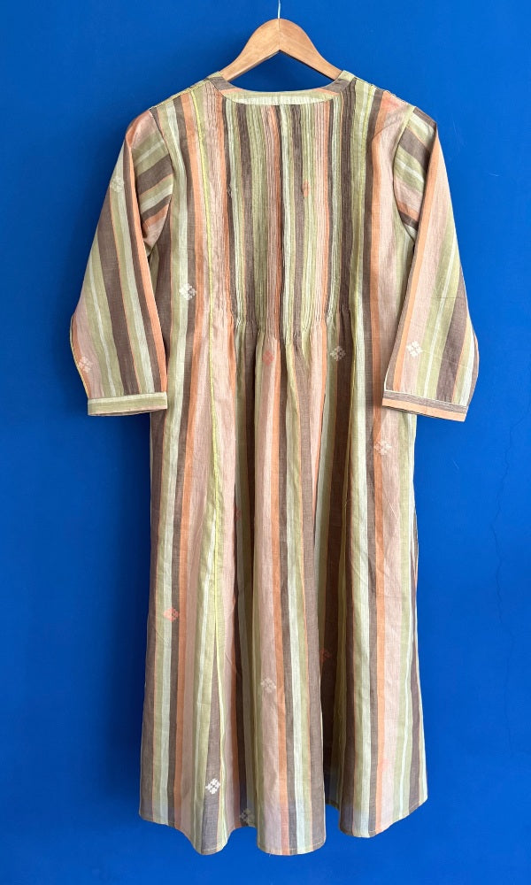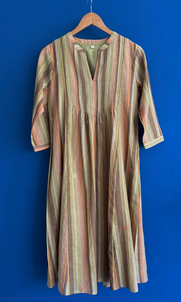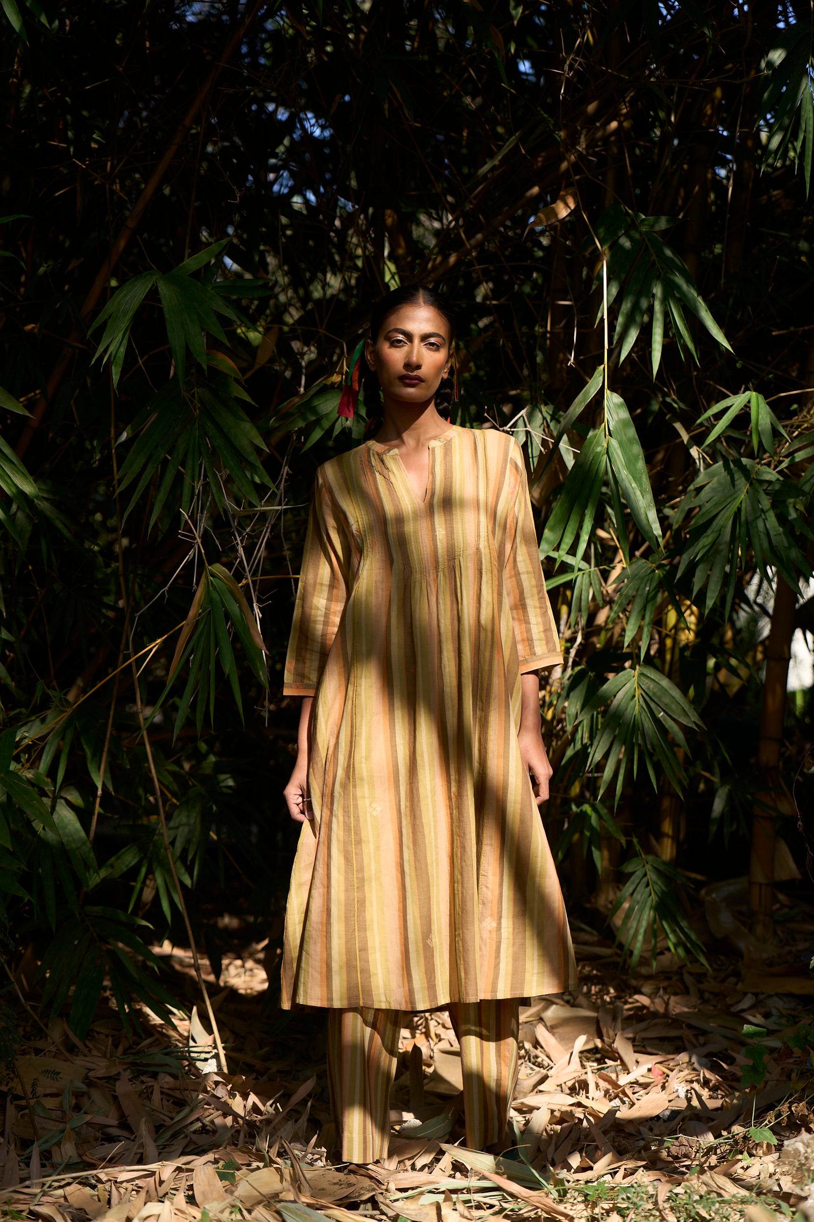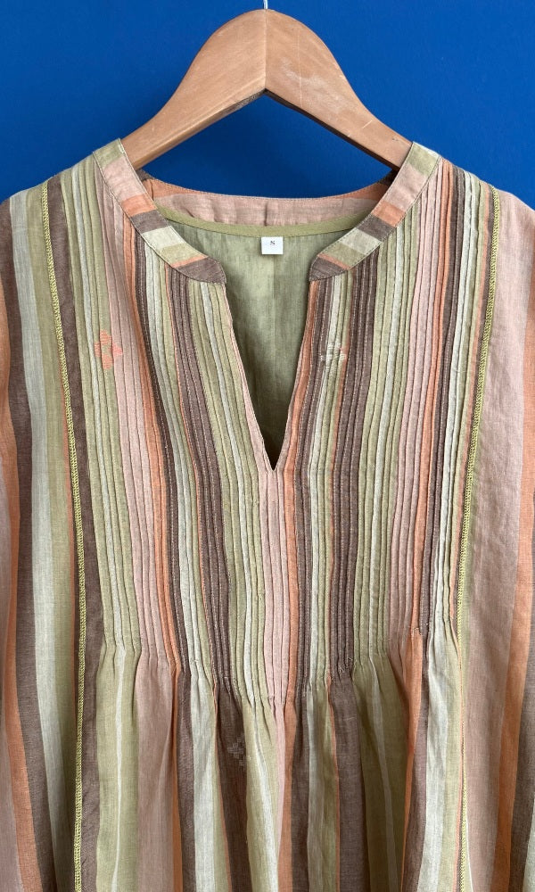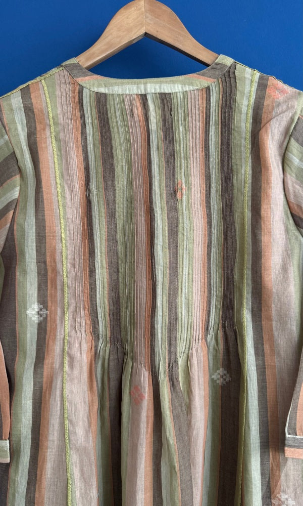 Indulge in the everyday luxury of this handmade textile and comfort of this impeccabaly crafted Sophia pintuck kurta & pant set. Made from delicate hand woven stripe jamdani, this set boasts elegant pintucks and relaxed wide sleeves. Complete the look with our handwoven medium weight jamdani straight pants. Elevate your wardrobe with this sophisticated and exclusive coord set.
