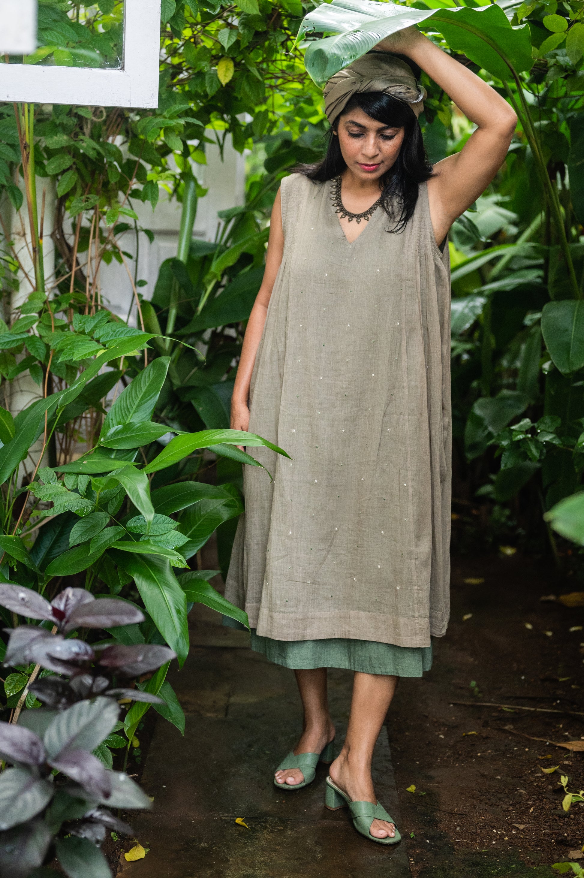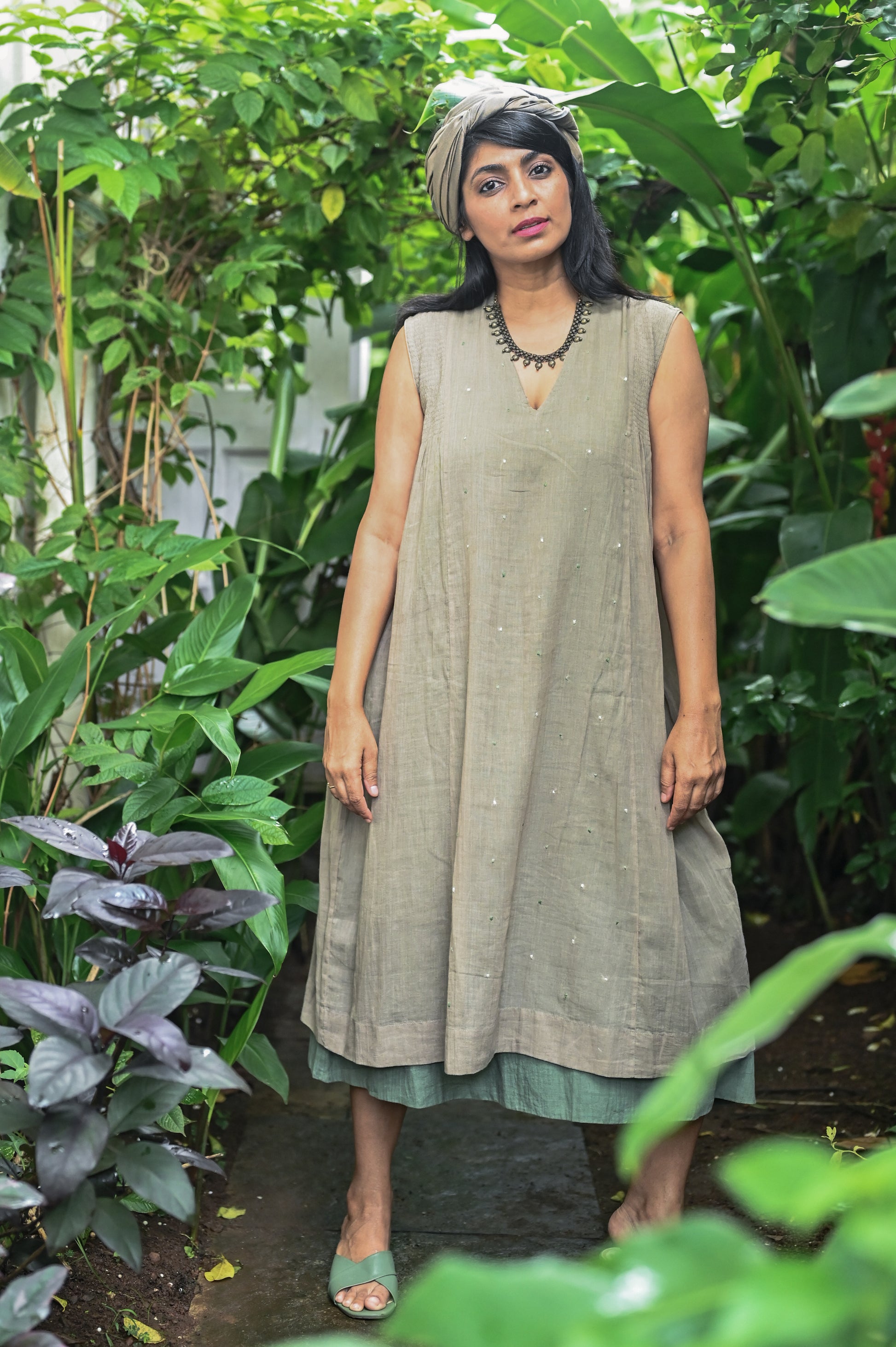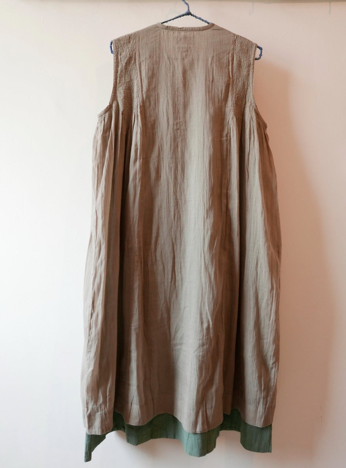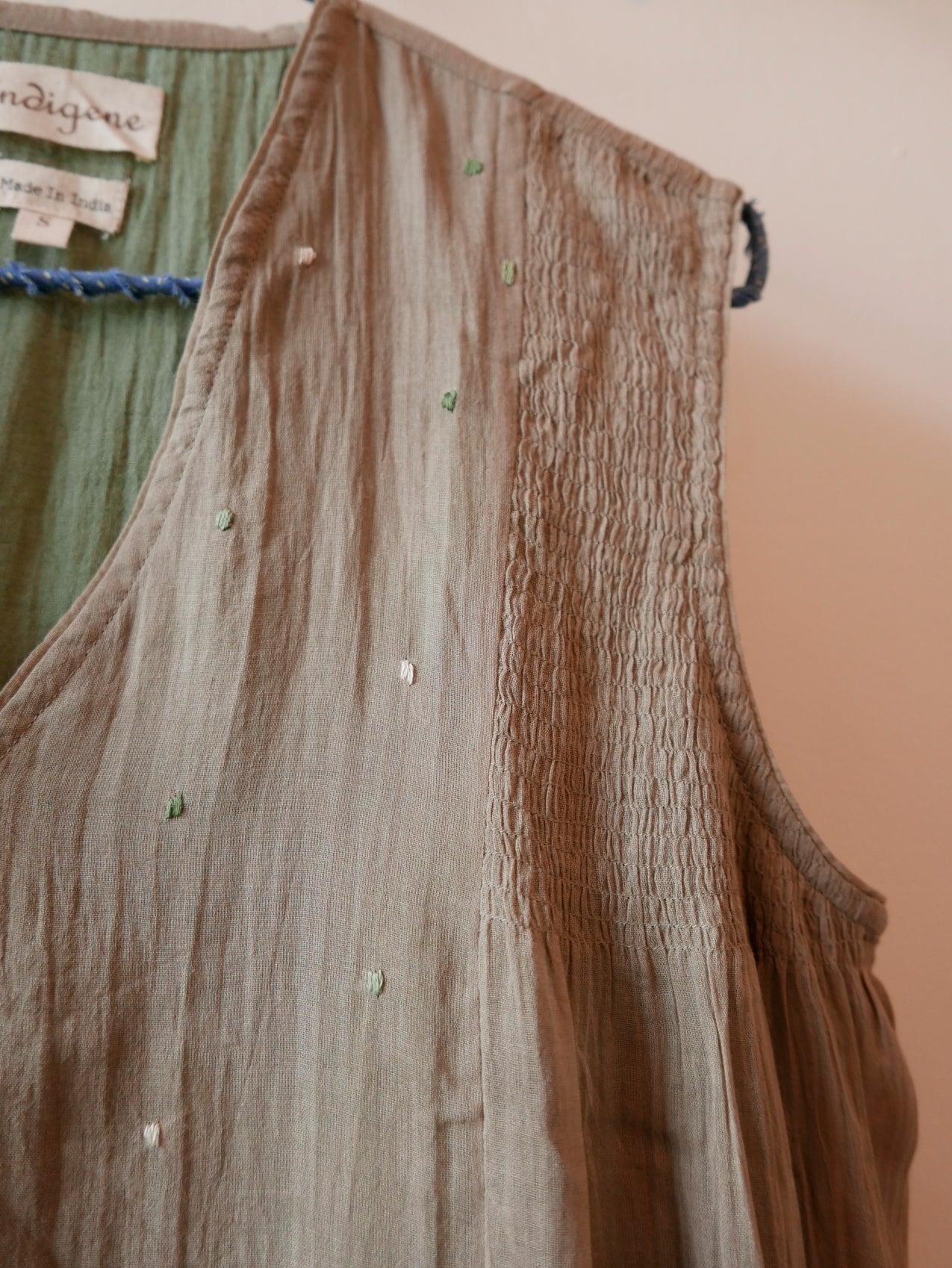 ARCUS- our sleeveless dress in two layers of fine cotton mulmul, with smocking detail around the shoulders is the perfect garment with sprinkled hand embroidered details all over, teamed with pants or just by itself, something you could lounge in all day as the heat waves arrive. Relax, breath easy.