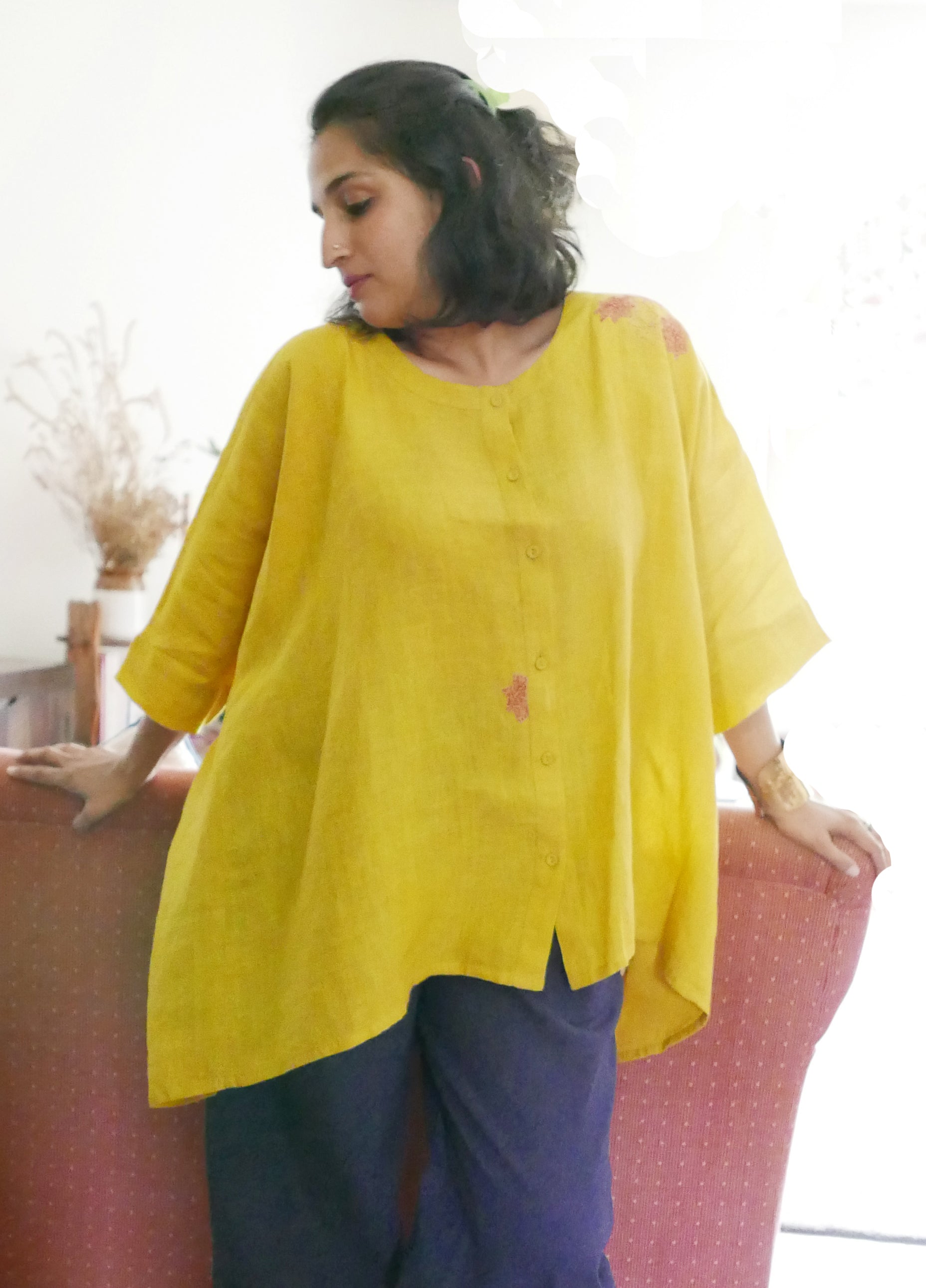 Our Bara 100% handwoven linen kimono top offers lightweight comfort and breathability. Its a one-size fit garment designed for all-day wear, perfect for weekend dressing. Hand-embroidered button details give the top an added traditional touch. Enjoy the ease and style of this gorgeous top!