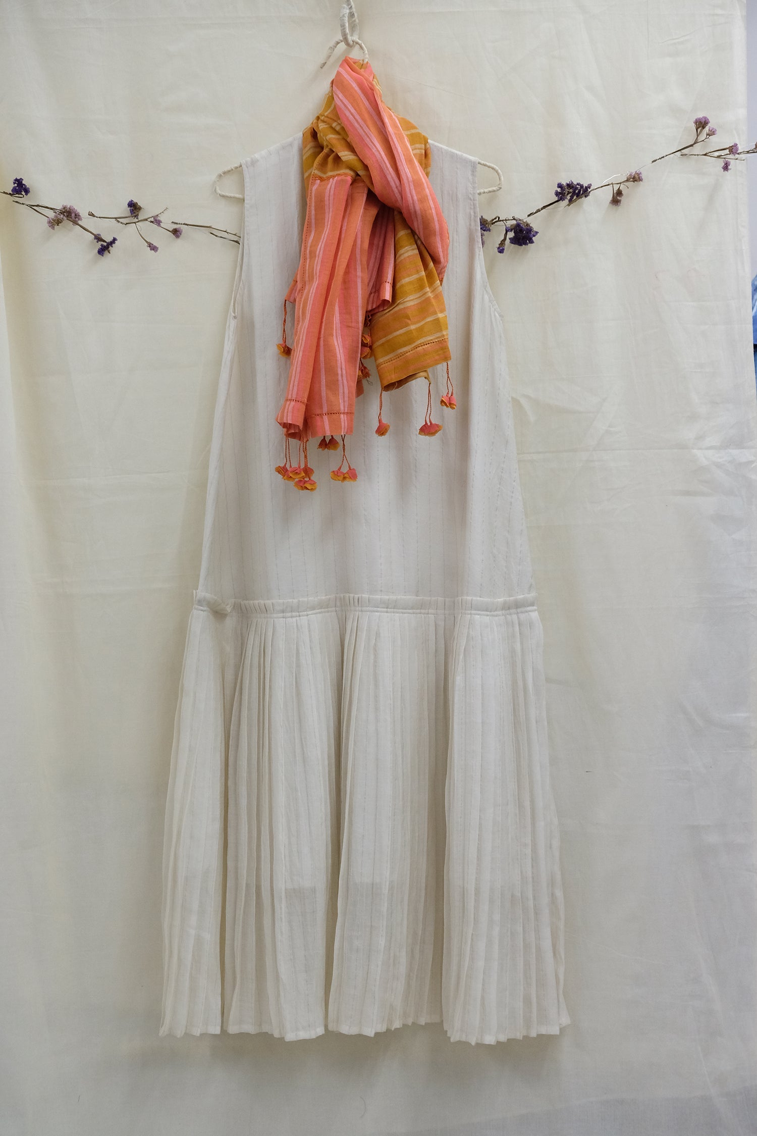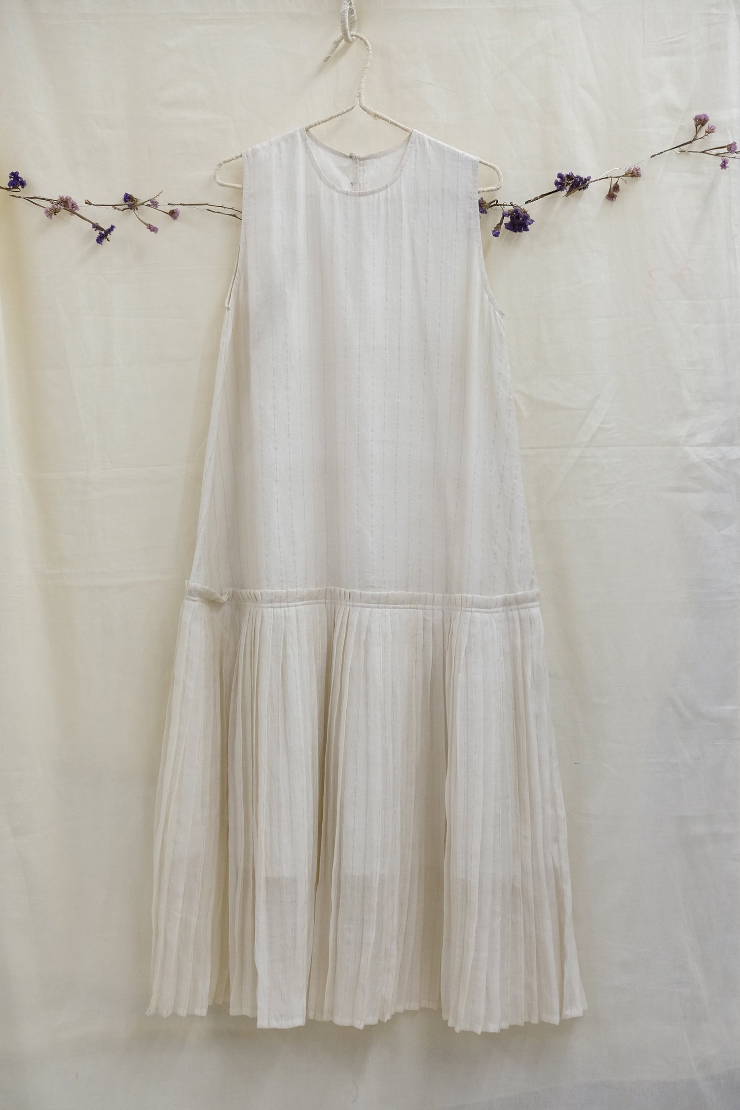 Look chic in our Beth pleated hem, low waist sleeveless dress in soft chanderi. This dress makes for a perfect canvas to be set off with your favourite piece of jewelry, scarf or a jacket. Layer it with Gothe Eri silk jacket and get set for the perfect soiree.