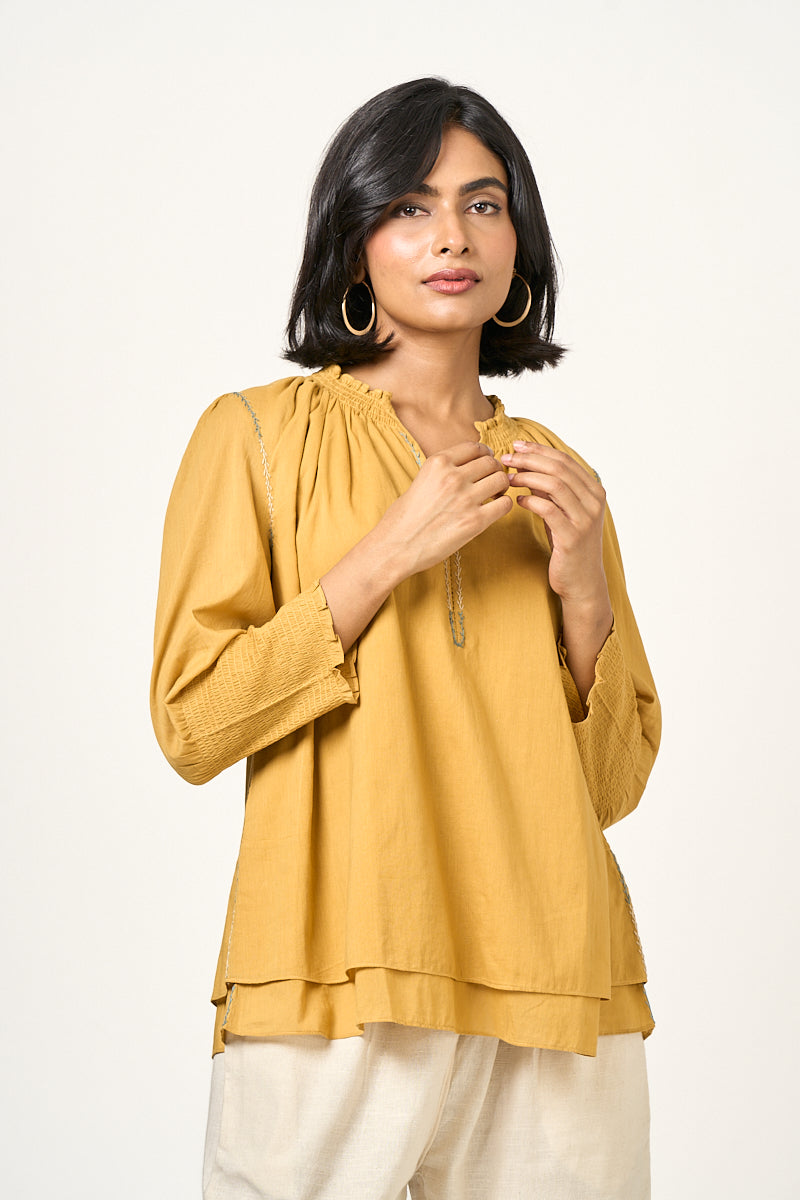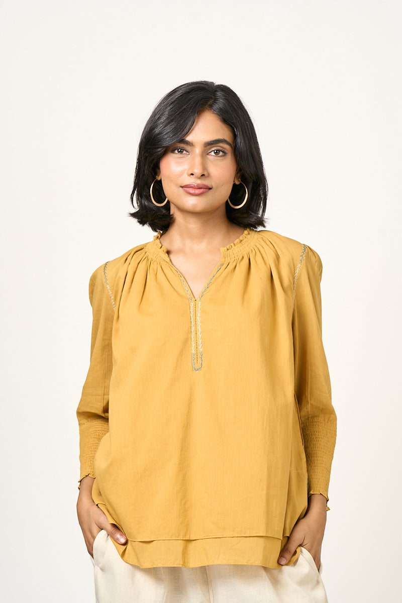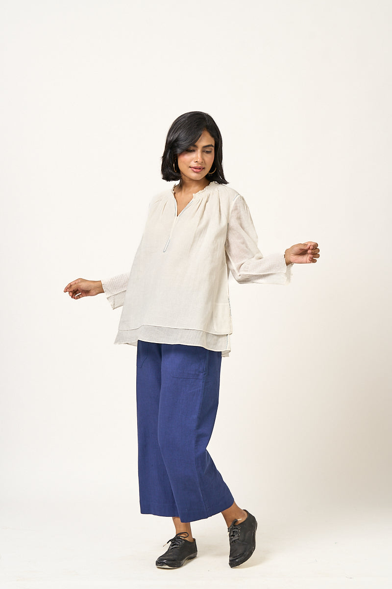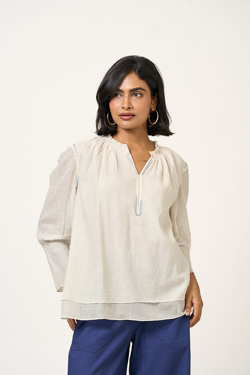Our natural mulmul Bianca top with a delicate ruffle neck and smocking detail is a classic summer top, easily teams up with a pair of jeans, linen pants or skirts. Perfect as you go strolling by the sea, or just sipping coffee and relaxing.