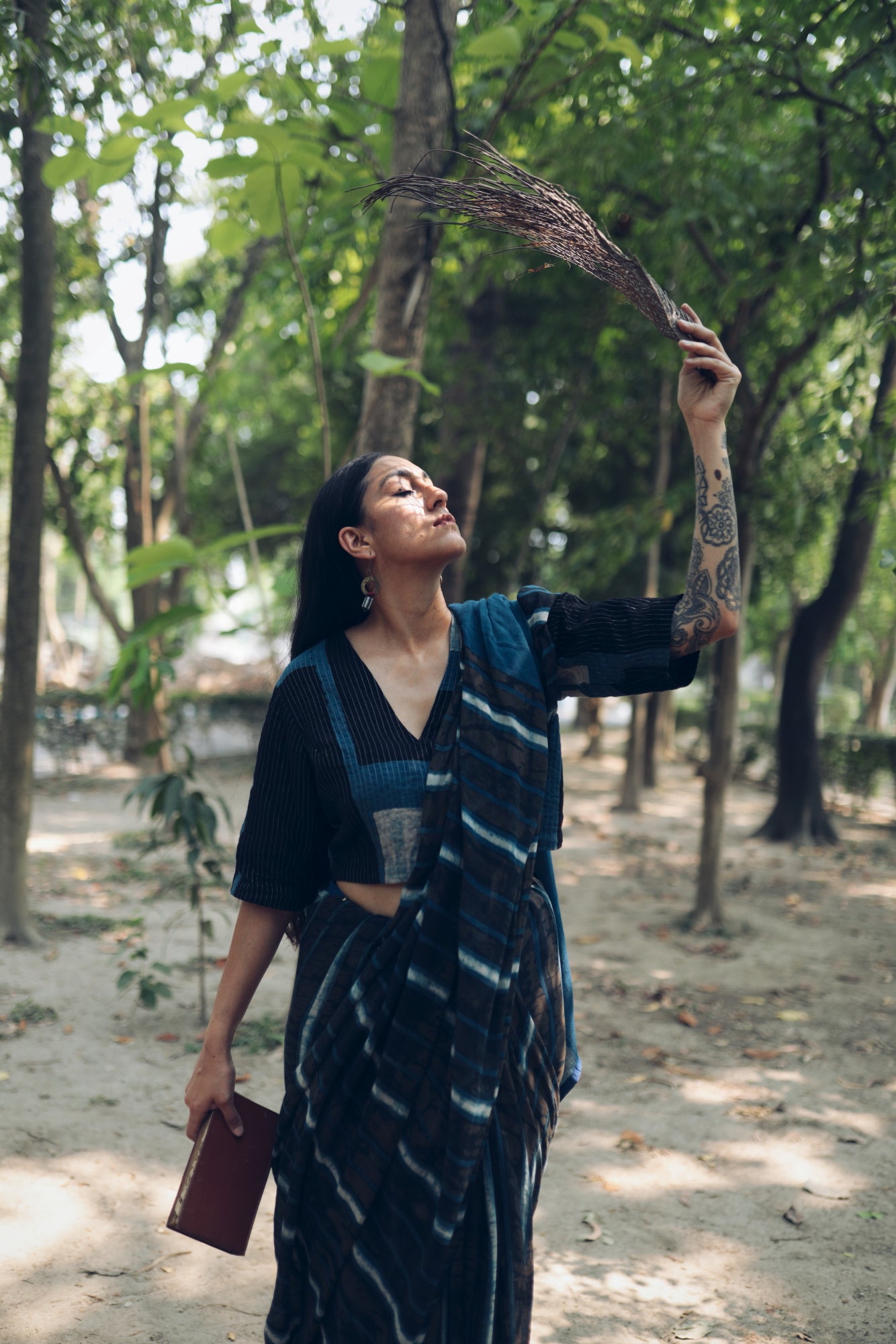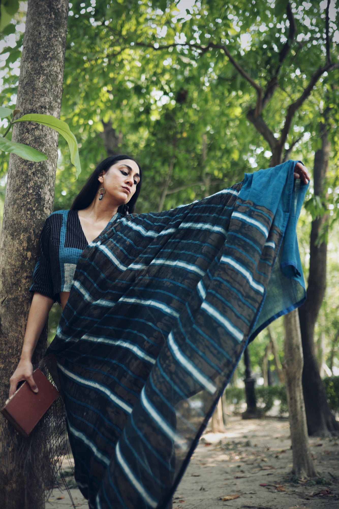 Black & Blue Stripes Mulmul Ajrakh Sari