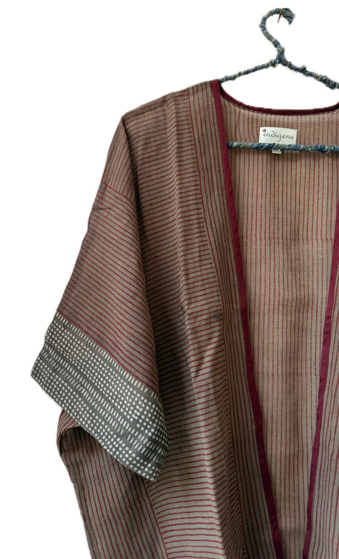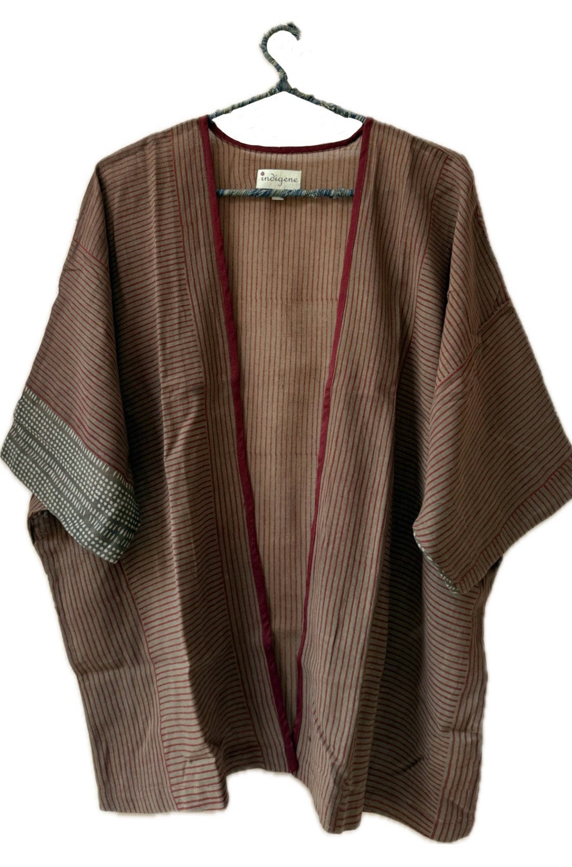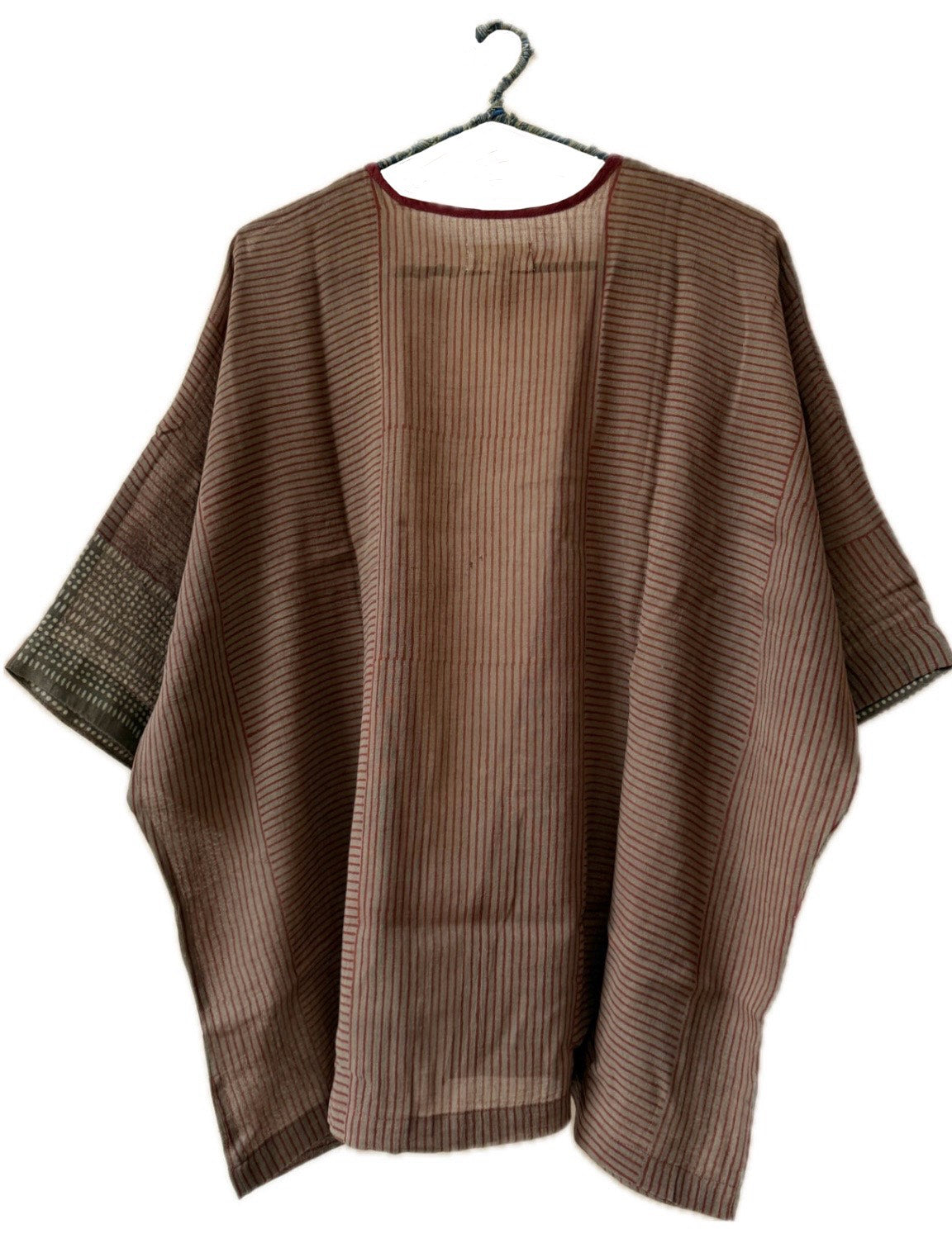 The Brick stripe relaxed overlay in handwoven cotton and hand painted ajrakh technique is unique to the core. Delicate and diaphanous, your perfect add on with tops, tees or a dress, through the summer season.
