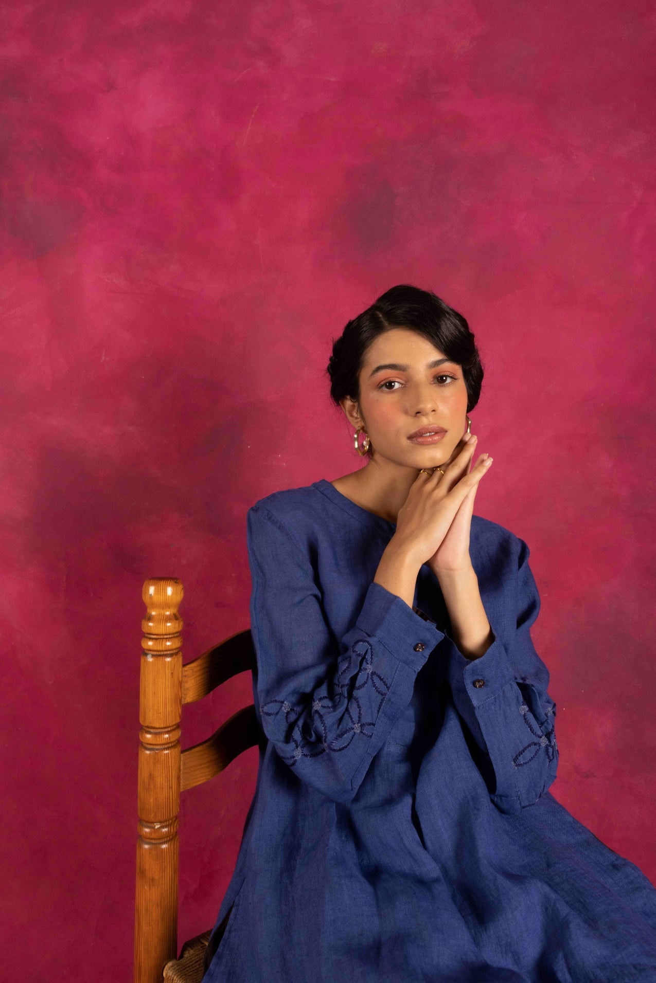Classic and comfortable, the Harmony linen tunic with hand embroidered sleeves, buttoned cuff, pleat and pocket details makes for a wardrobe must have. Classic and elegant easy to team up with. Best coordinated with our zest baggy pants in hand printed ajrakh.