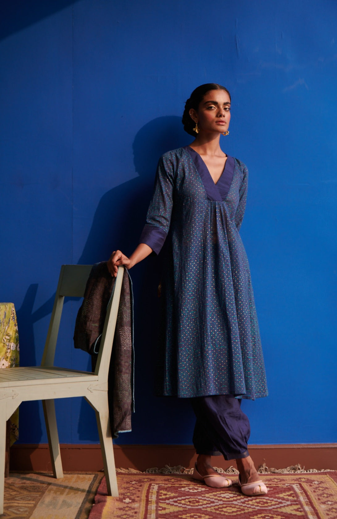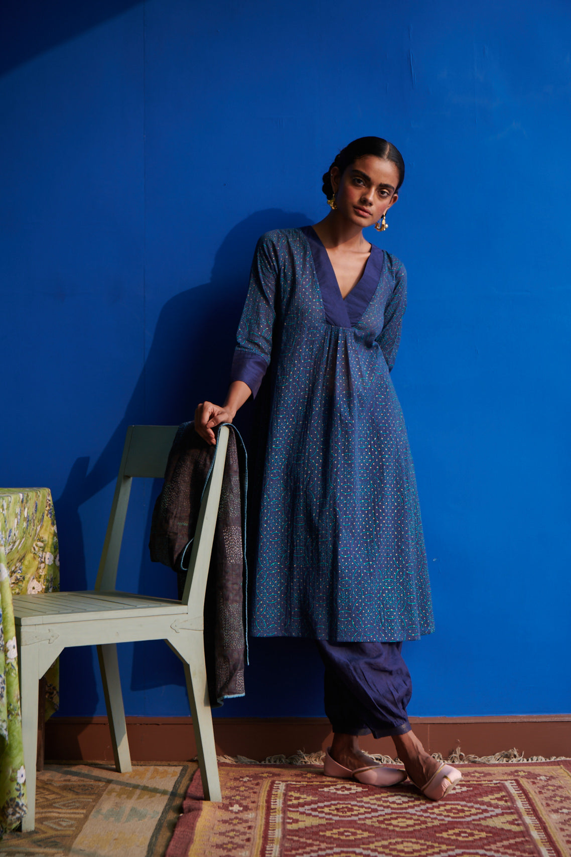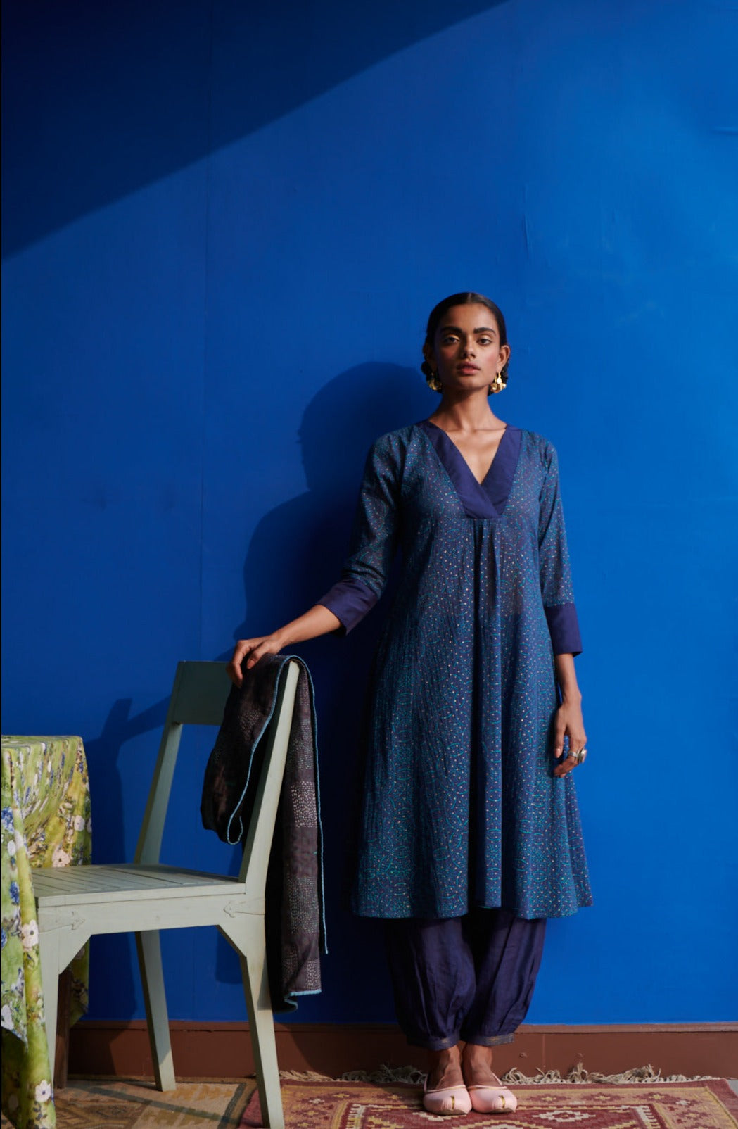 The Bella V neck band kurta in fine mulmul and chanderi, with beautiful gold hand block print and fine stitching details is diaphanous and light. The bold V band and the slight gathers add to the modern take on a traditional outfit. Feel luxe, light and almost weightless in this hand crafted garment made with love and care.