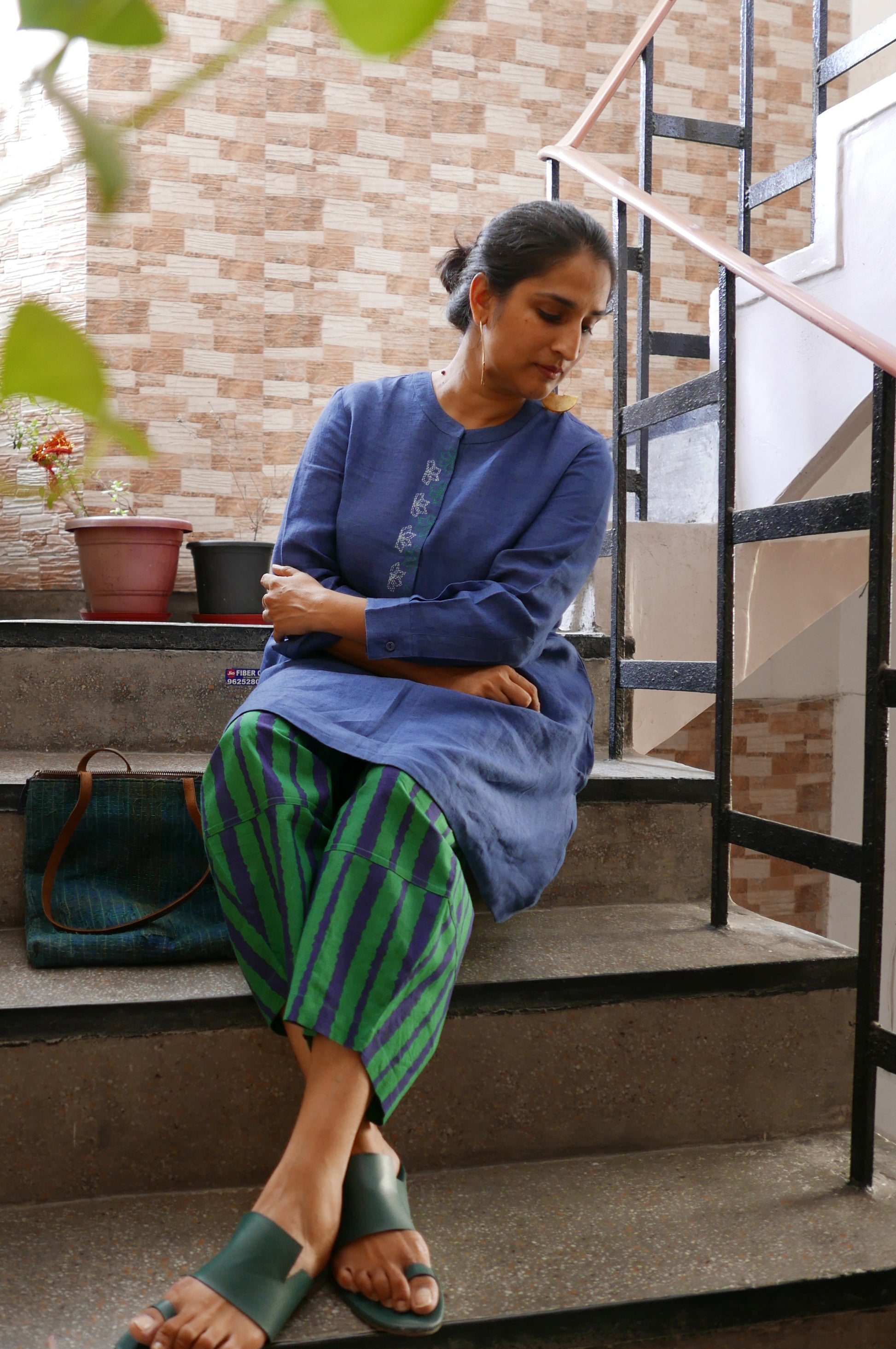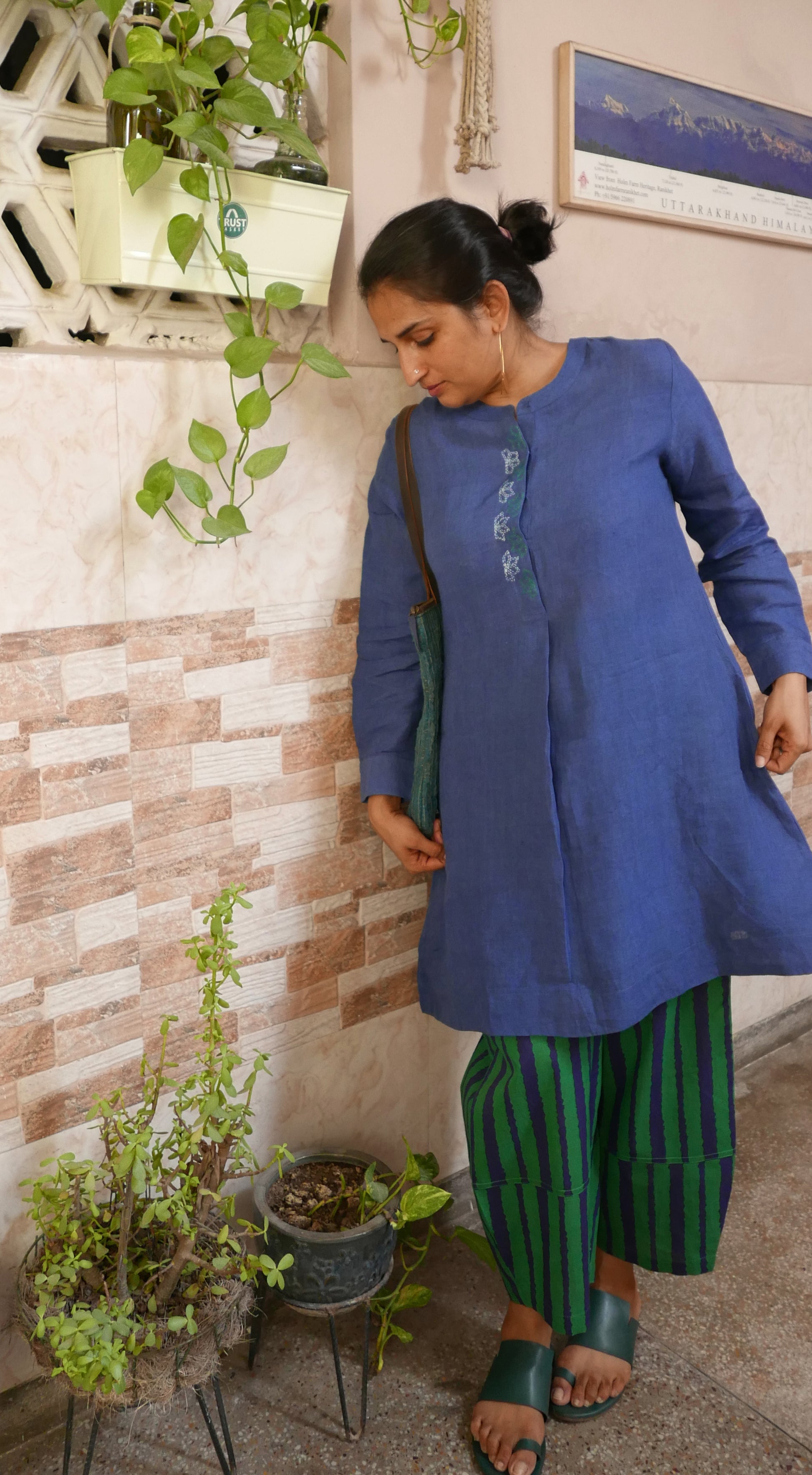 Classic and comfortable, the Hasu linen tunic with hand embroidered placekt details, buttoned cuff, pleat and pocket details makes for a wardrobe must have. Classic and elegant easy to team up with. Best coordinated with our relaxed fit printed pants.