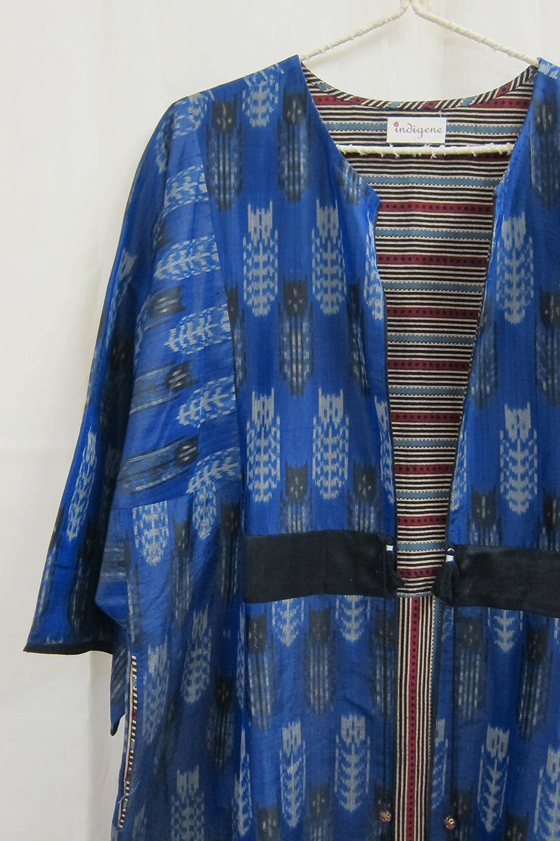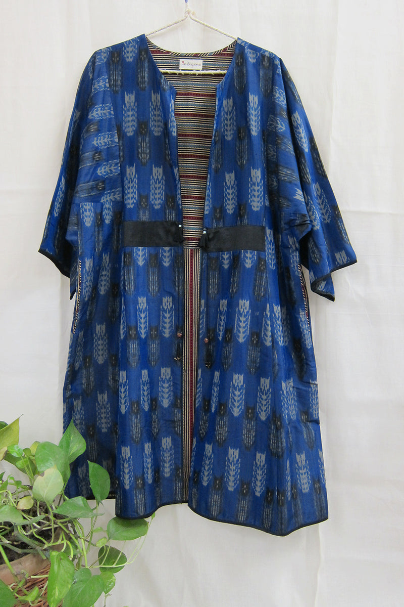 Our silk ikat Dhara kimono is handwoven woven in 100% mulberry silk by master weavers of this craft. Taking inspiration from the Chapans and Khilats of Central Asia, these are lined with hand block printed fabrics and decorated with handmade tassels.
