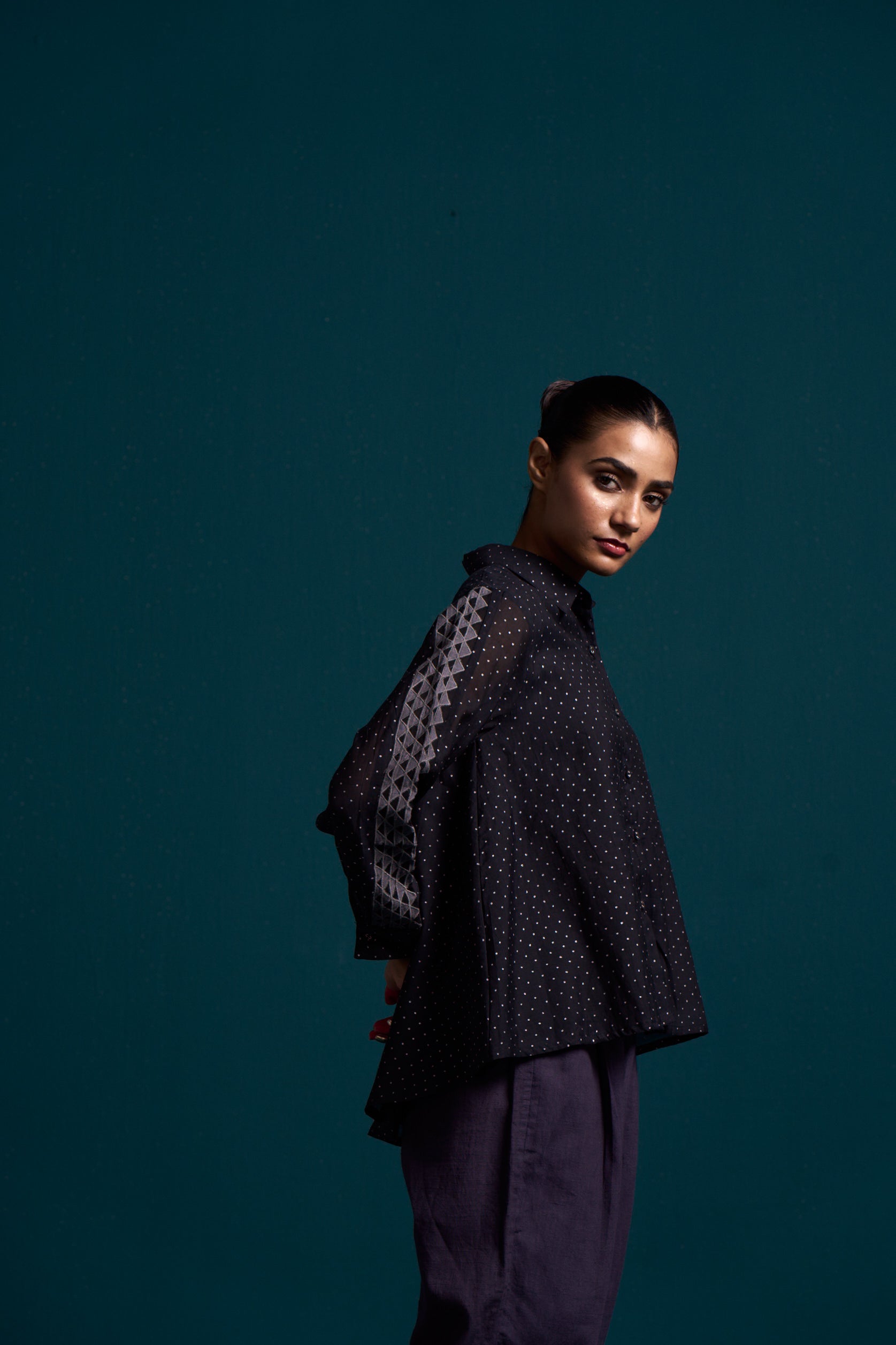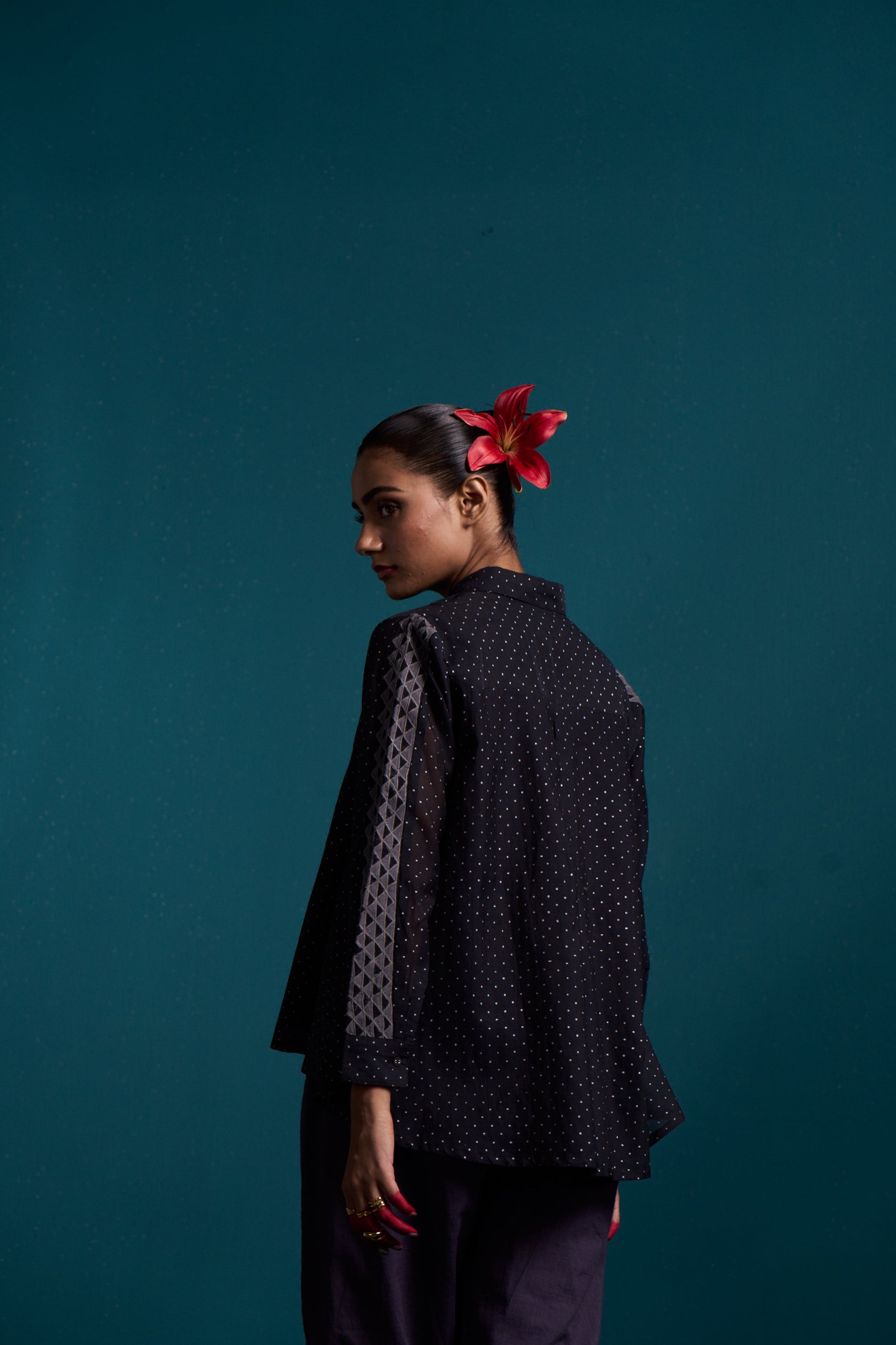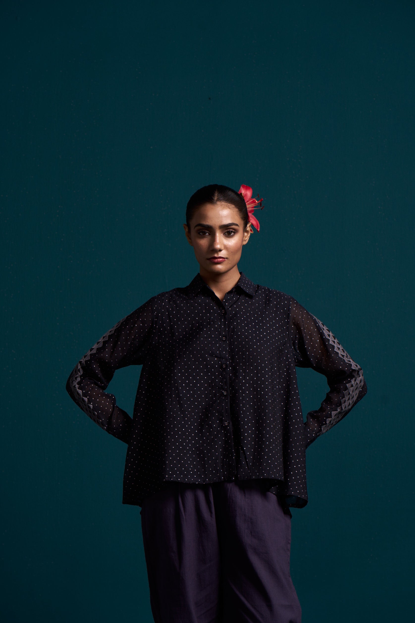 Introducing our Cosmic flared applique shirt, crafted from the finest silk cotton. The high low design adds a touch of flair, while the elegant hand block print adds a unique touch. Make a statement in this luxurious button down shirt.