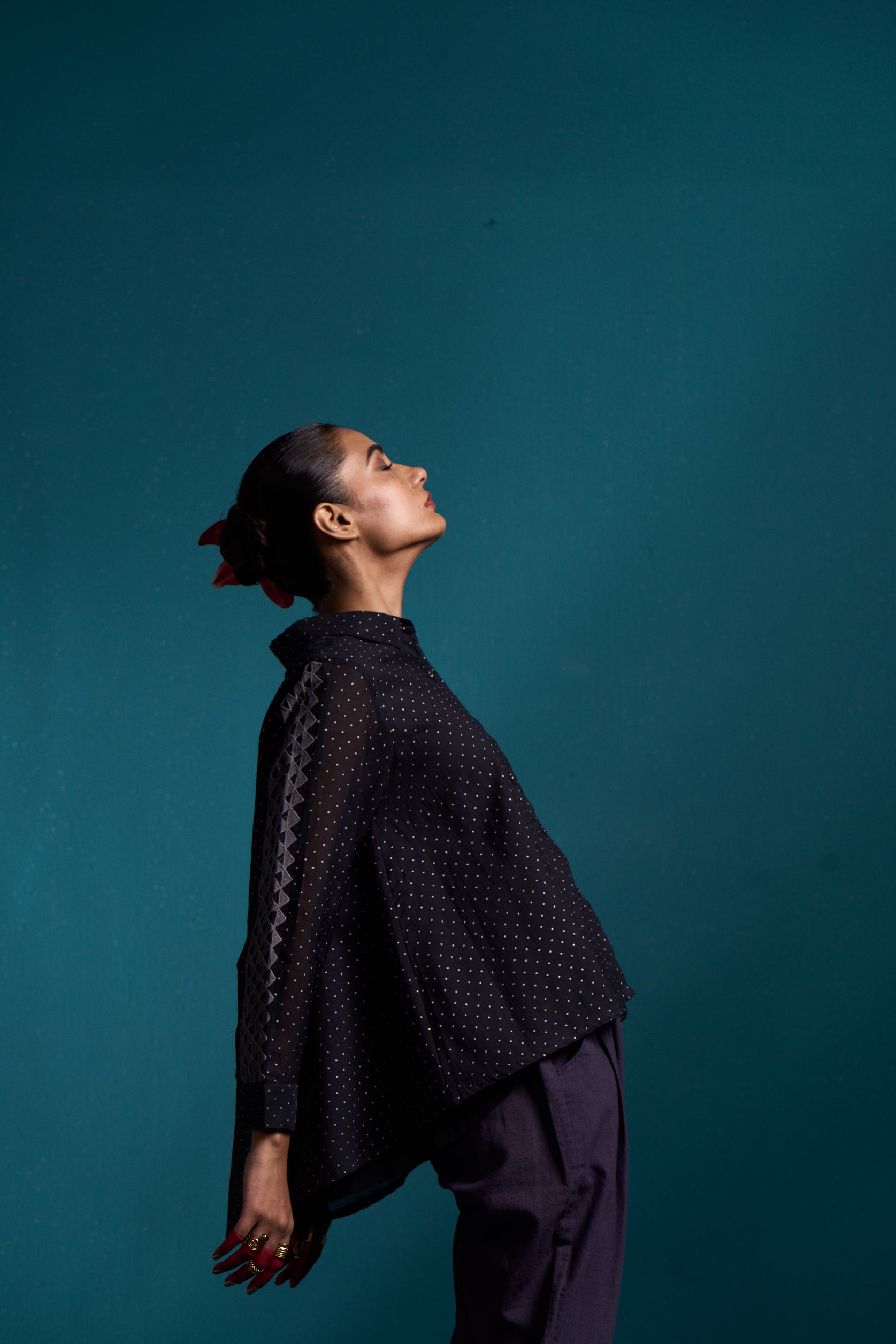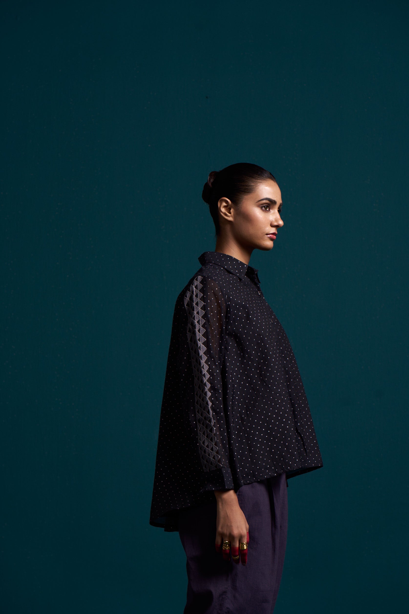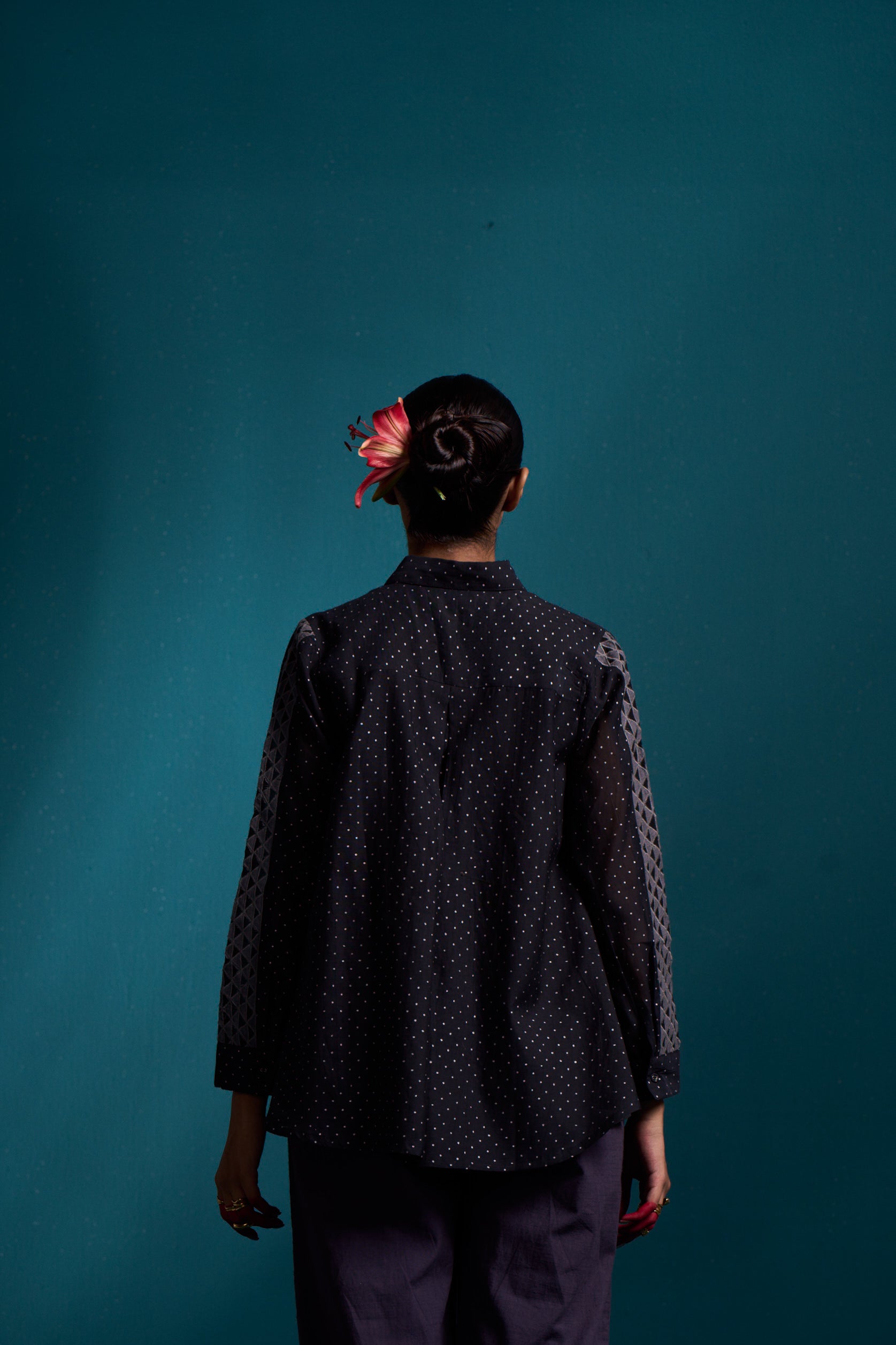 Introducing our Cosmic flared applique shirt, crafted from the finest silk cotton. The high low design adds a touch of flair, while the elegant hand block print adds a unique touch. Make a statement in this luxurious button down shirt.