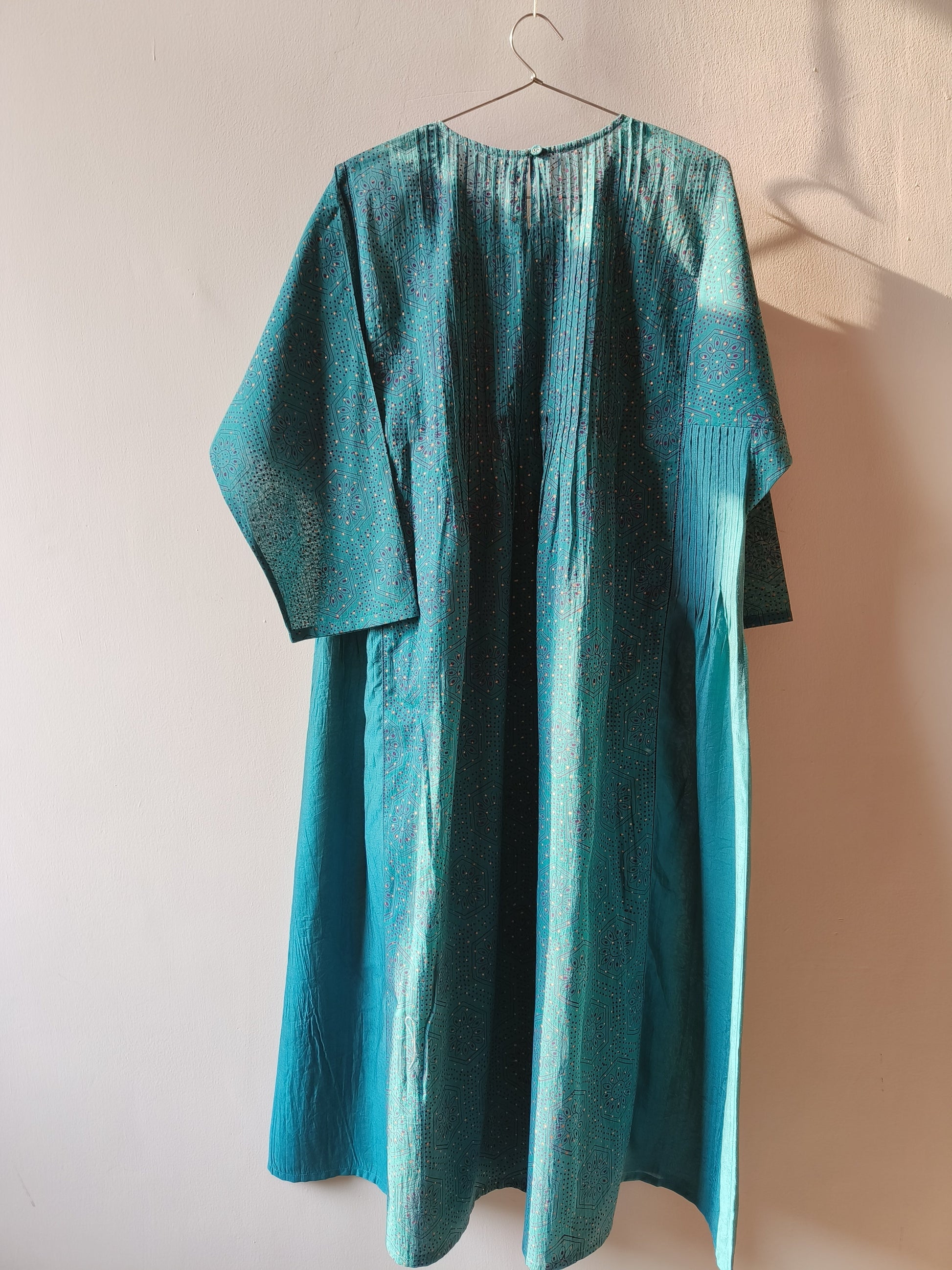 The Dona kalidar kurta in soft mulmul and chanderi, available in a subtle teal, has fine stitching details and is diaphanous and light. Feel luxe, light and almost weightless in this hand crafted garment made with love and care.