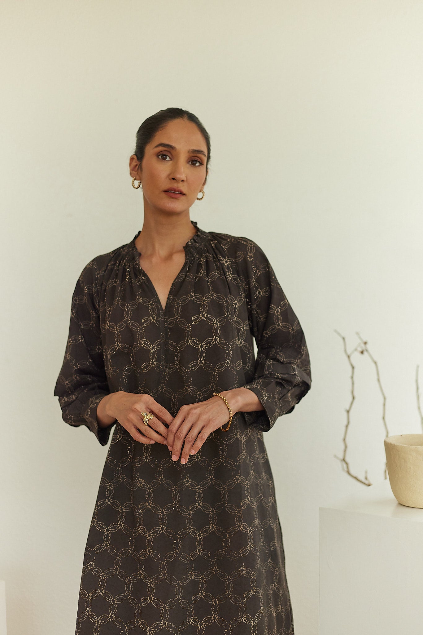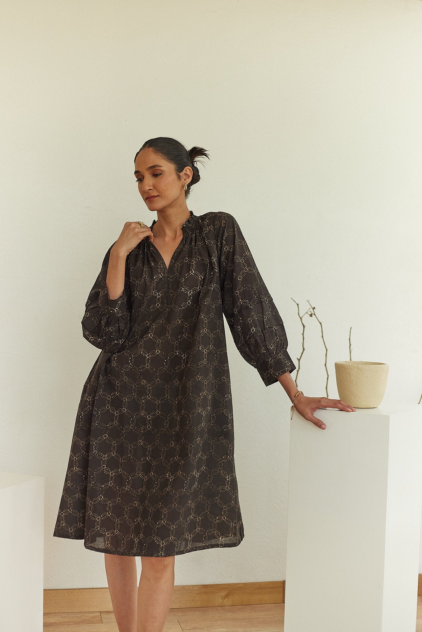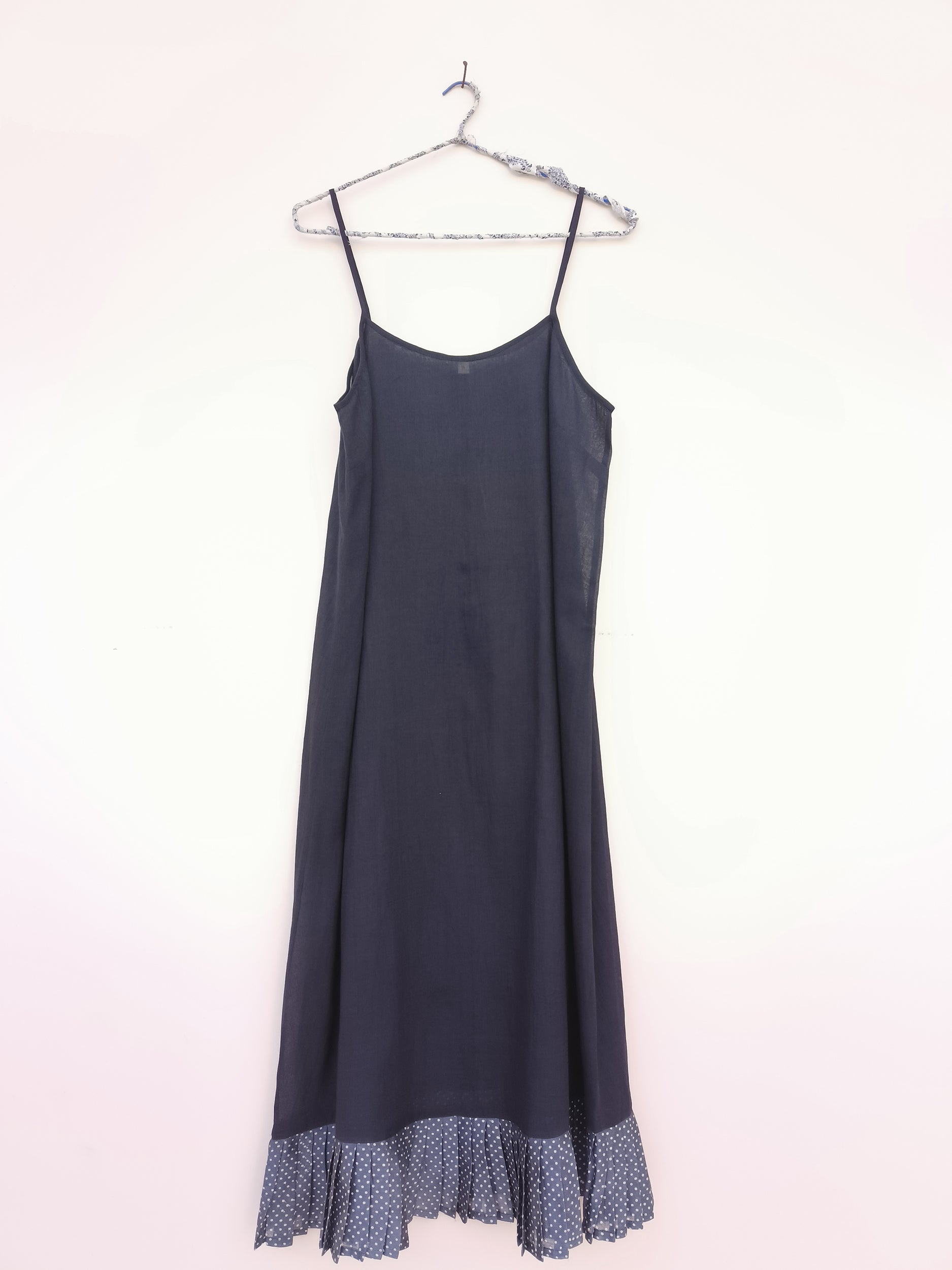 Bring in a bit of the old world charm with this pleated hem, layered dress. Printed mulmul is comfortable and all season when layered. A separate sling slip gives you the versatility to wear both together or separately. Exaggerated sleeves add to the boho vibe.