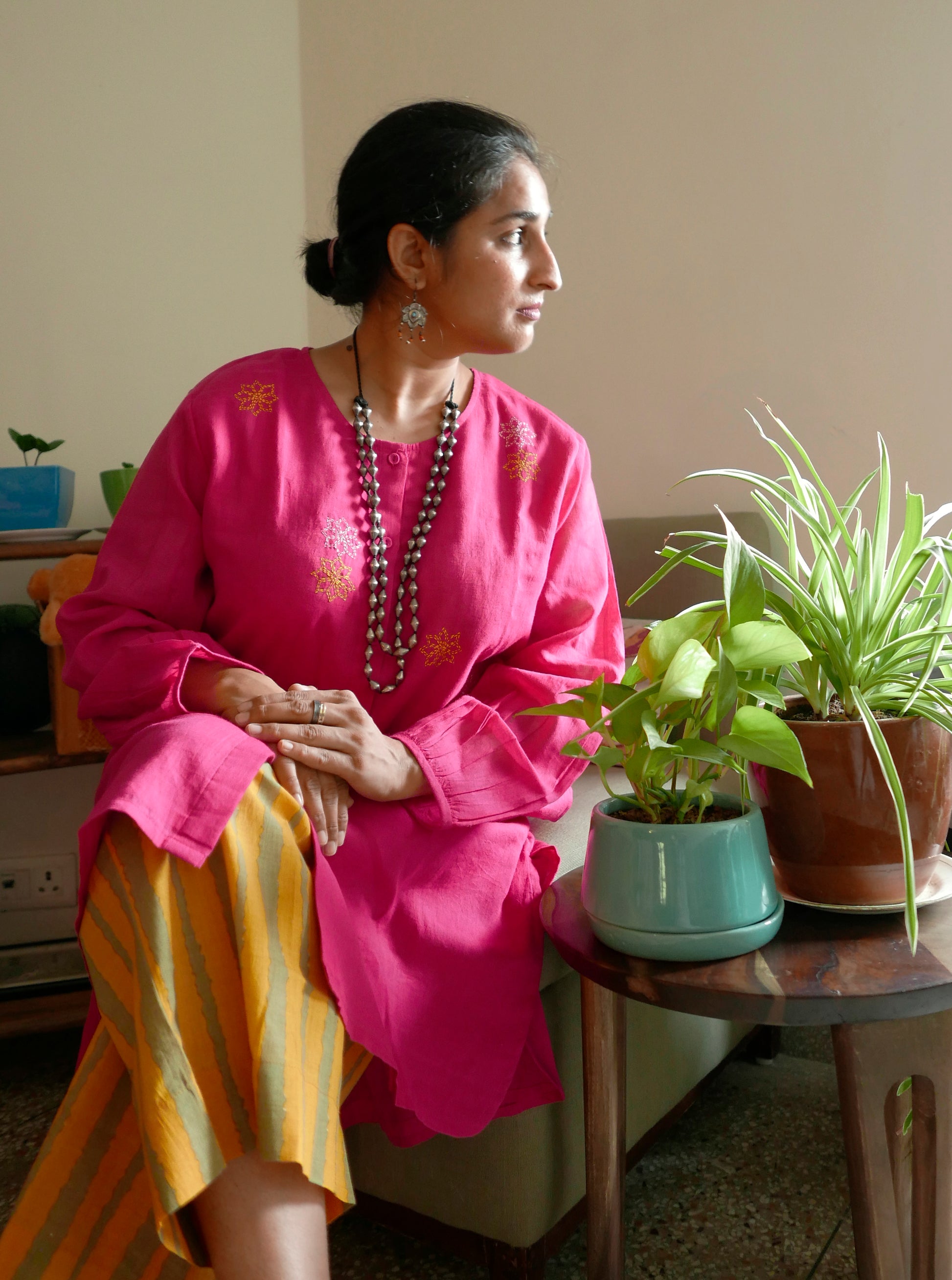 The Fuji Placket kurta is a timeless wardrobe staple made with soft cotton mulmul (lined). Featuring a hi-low hemline, it offers effortless all-day wearability. A button down placket featuring fabric buttons, and hand embroidered details add a special touch. The hand printed soft cotton pants add a twist of contrast and allows you to make a statement without saying a word.