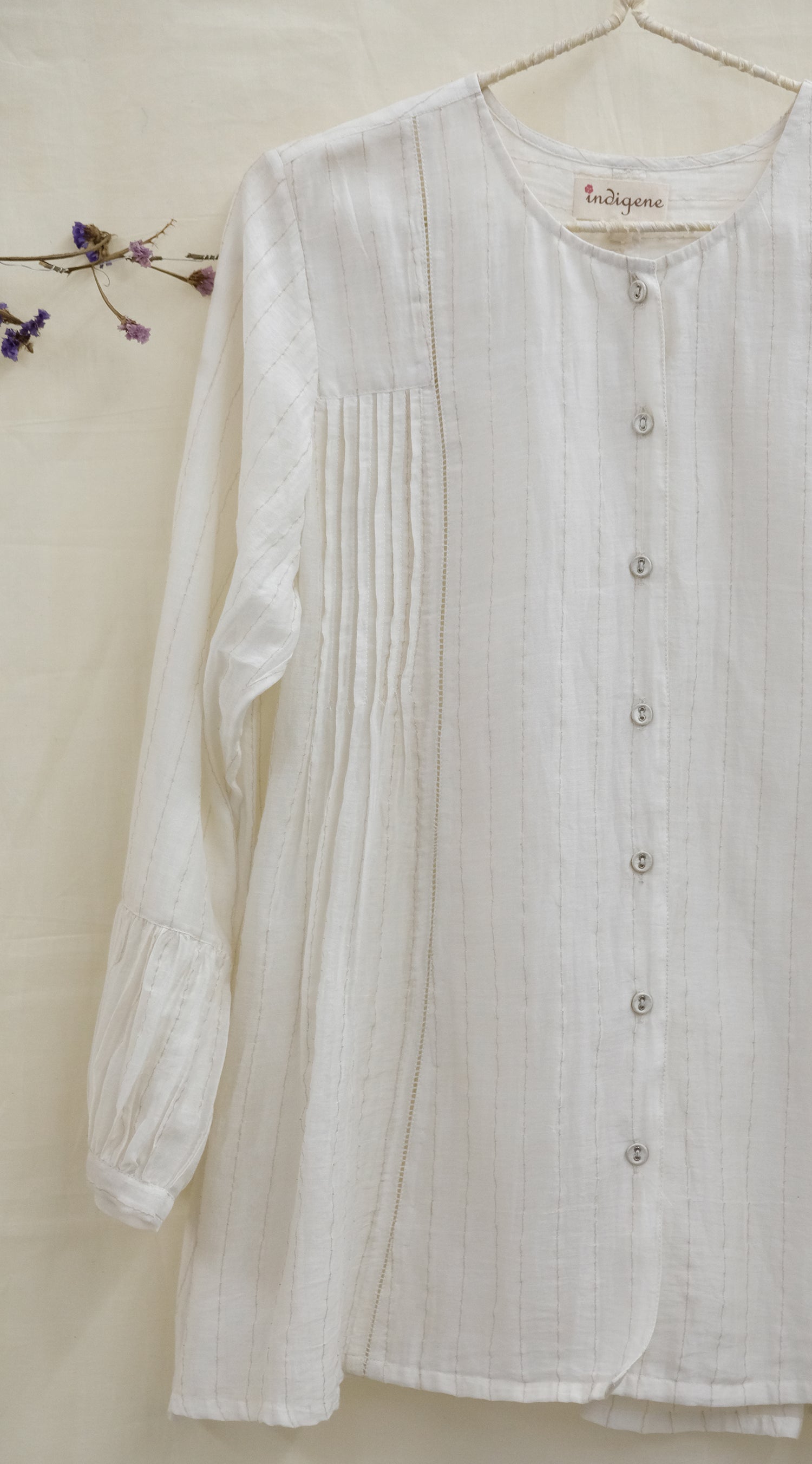 This chanderi shirt in pristine white and diaphanous Chanderi is a must have. Ideal to wear to work or for an all day outing, this easy to combine shirt goes well with anything you team it up with. The garment is featured here with pleat details, fagoting and front panel lining.