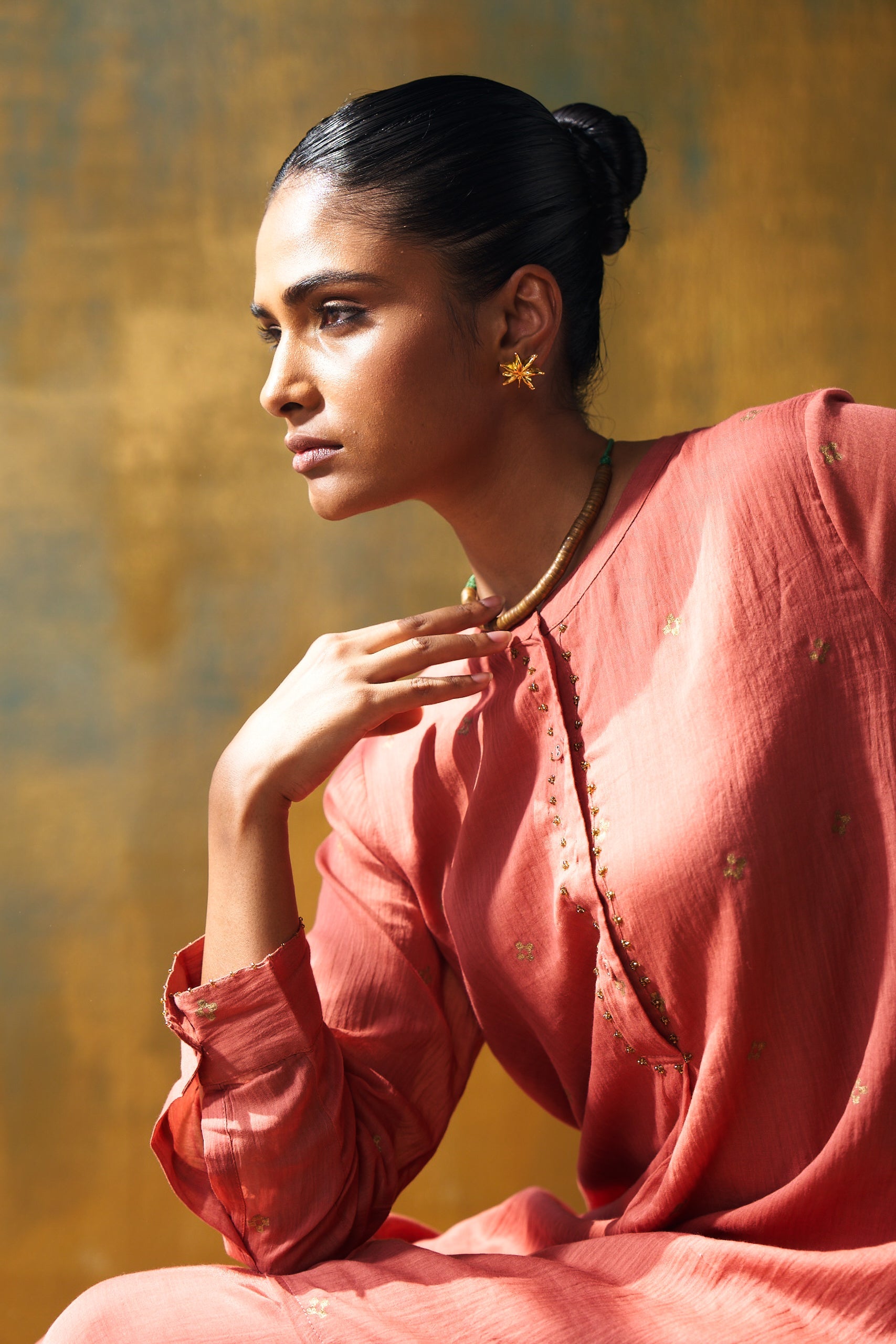 Make a style statement with our Gulab gold printed tunic. Its chic, clean design and subtle hints of gold make it the perfect evening wear for a special occasion, teamed with our gathered hem pants, to add to the fusion. The luxuriously soft mulmul fabric and timeless silhouette will ensure you look timeless, the delicate bead work on the neck and sleeves is elegant, and adds sophistication.