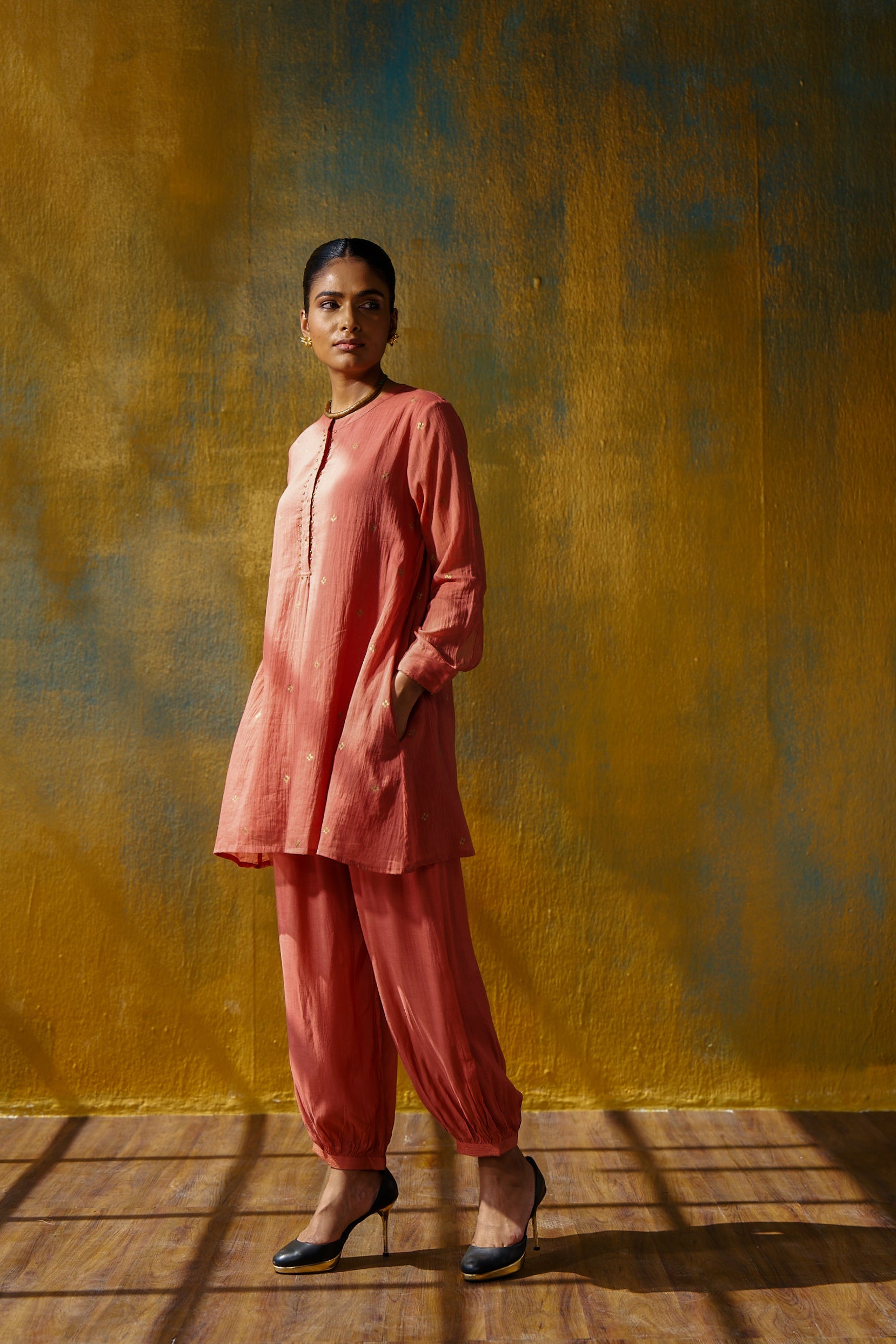 Gulab Gold Printed Placket Tunic & Gathered hem Pant Coord set