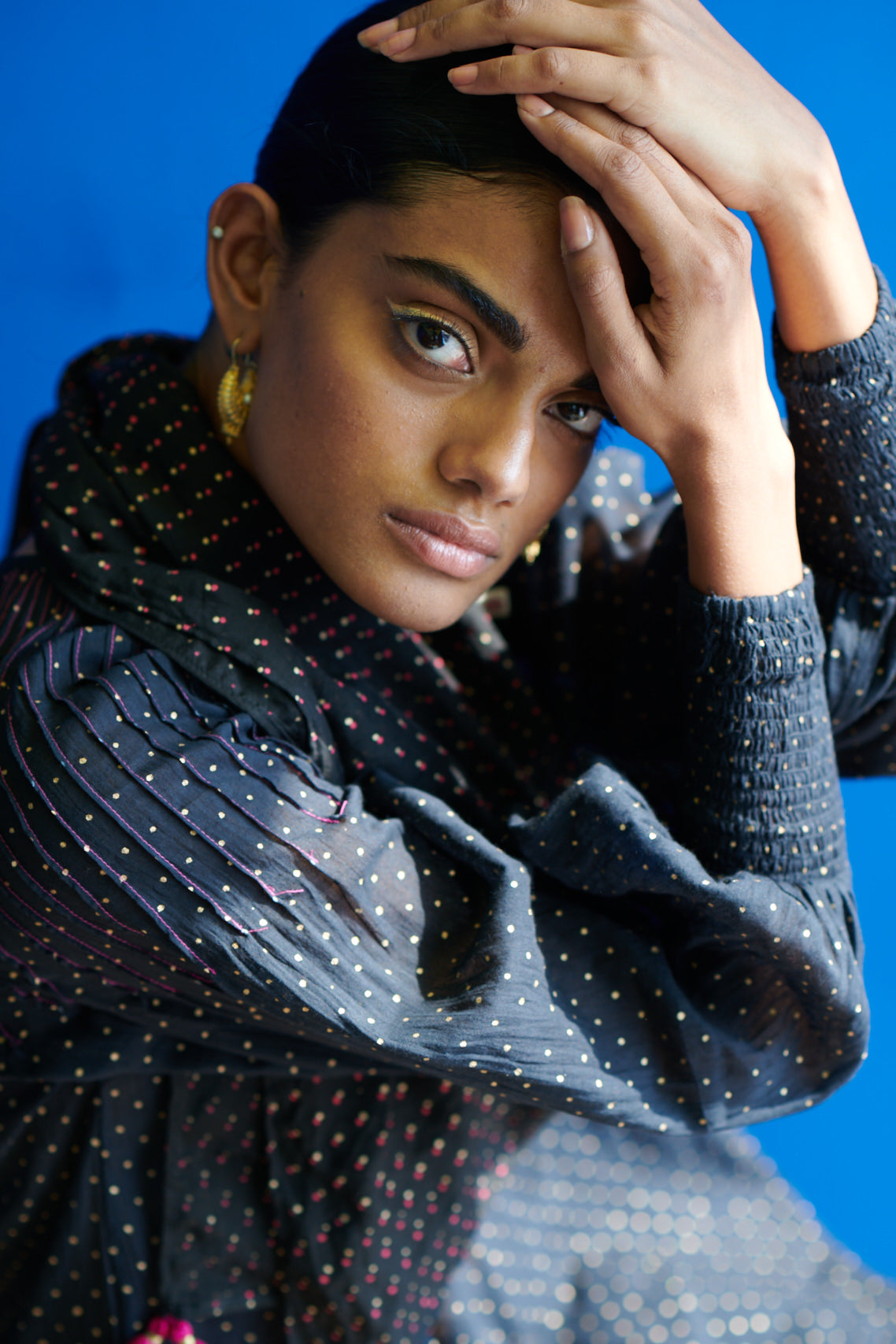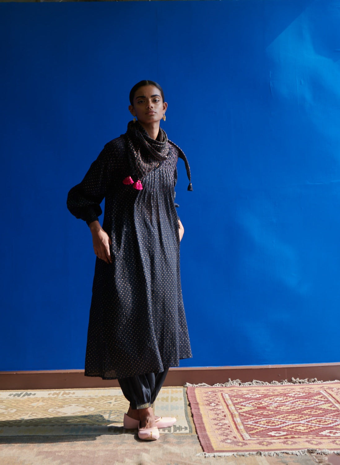 The Isthmus kurta in fine mulmul with beautiful gold hand block print and fine stitching details is diaphanous and light. The radiating pin-tuck details and smocked sleeve edges adds to the style quotient and rephrases the modern kurta. Feel luxe, light and almost weightless in this hand crafted garment made with love and care.