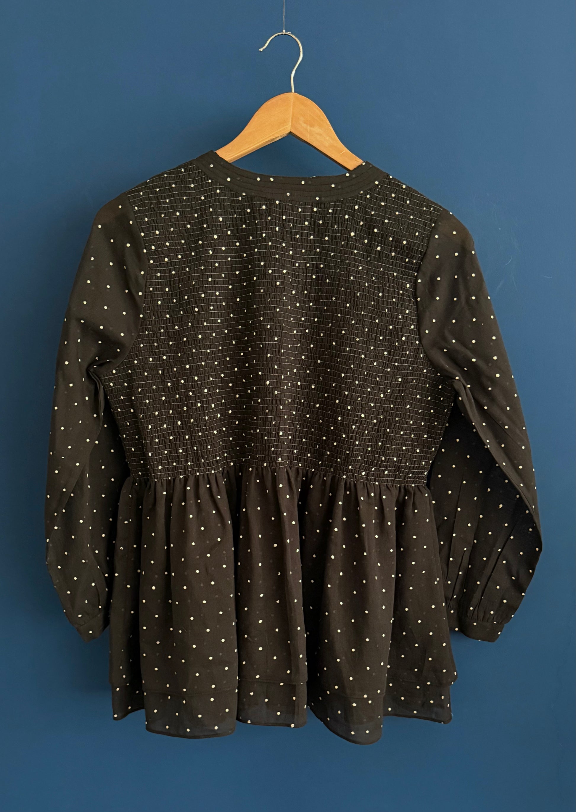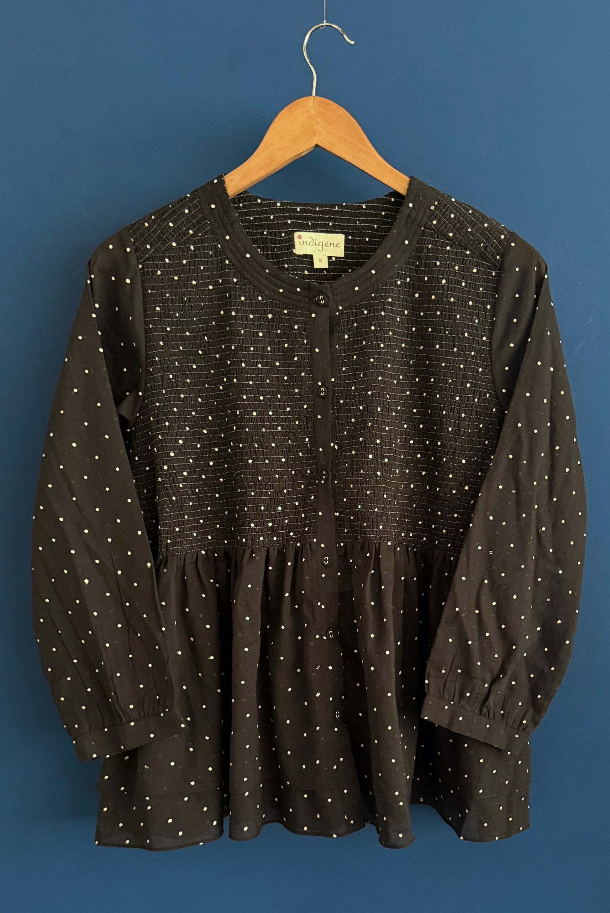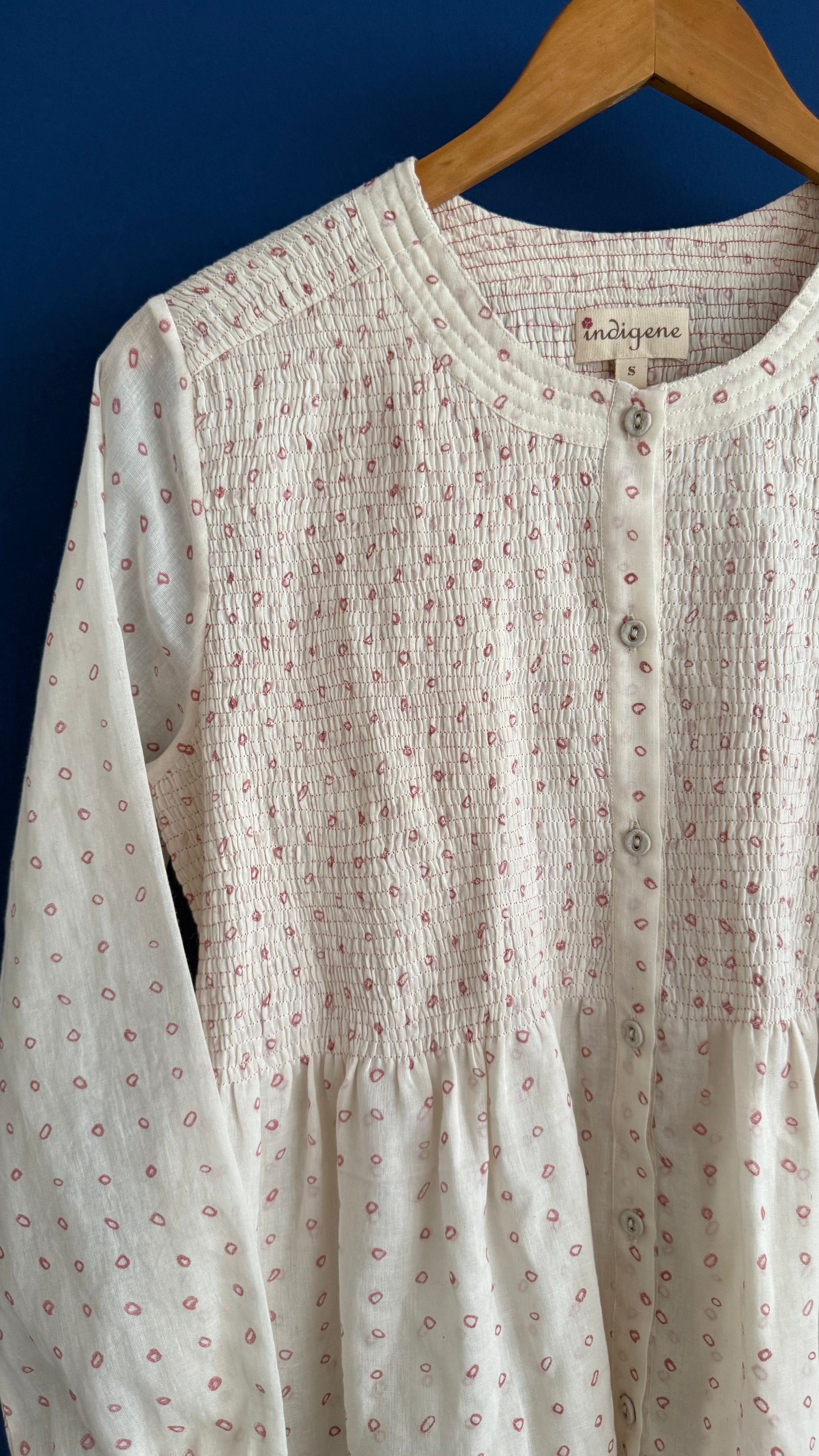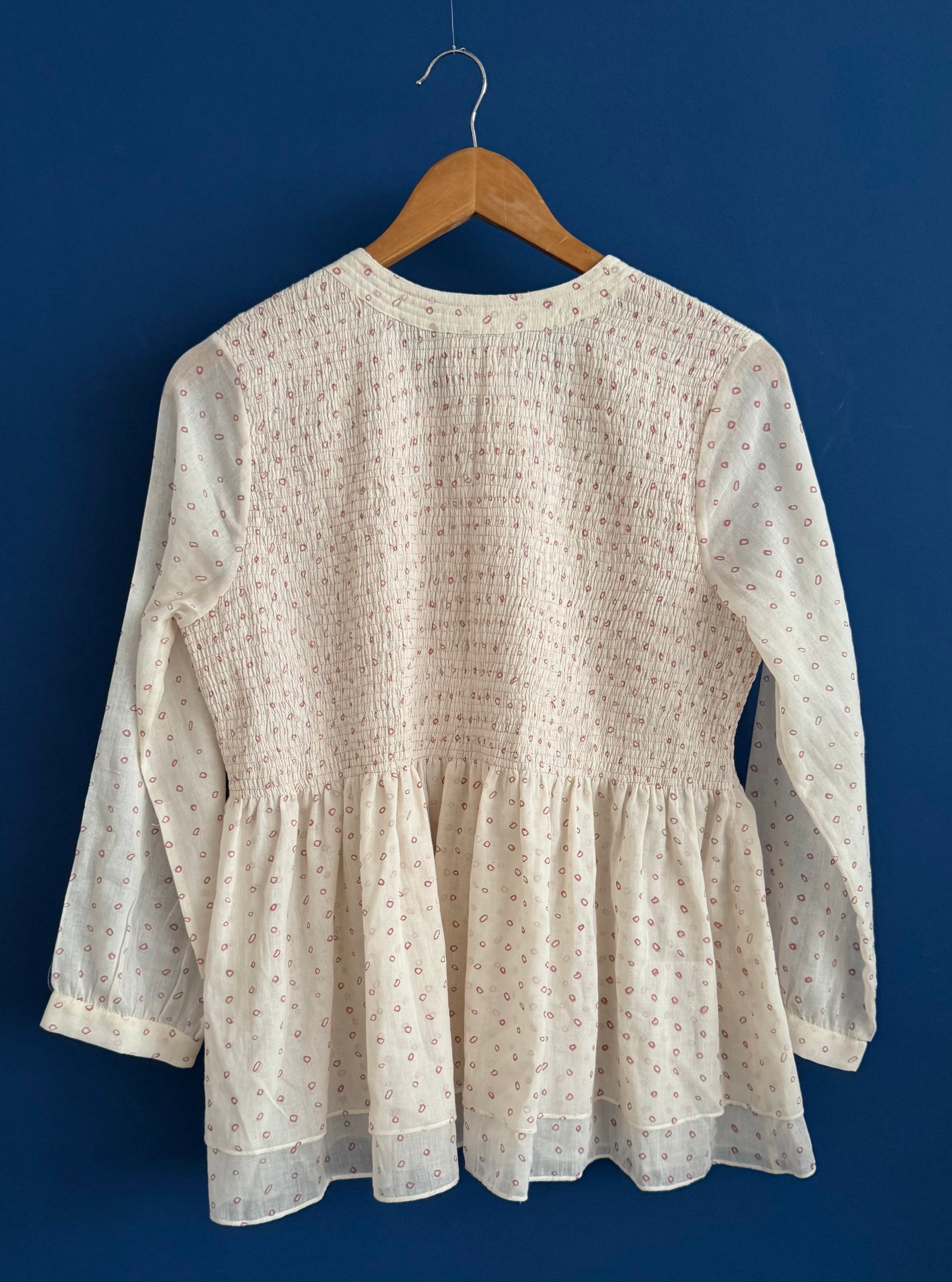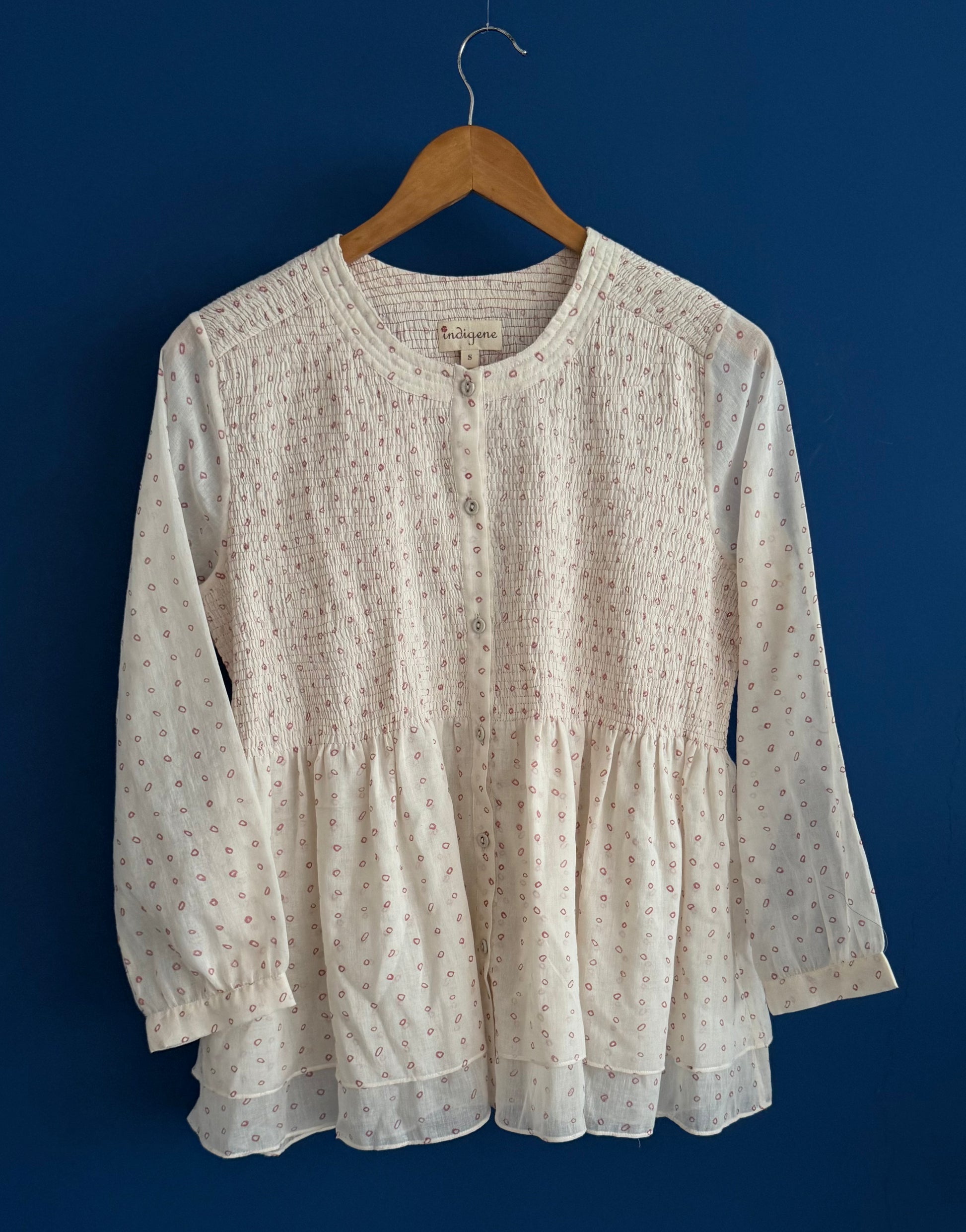 The Ursula fine printed mulmul, layered top is subtle yet dressy. Made in the softest cotton voile with fine smocking detail front and back bodice, this detailed top is luxe. Perfect for a summer evenings or a day out, team up with easy linen pants, or shorts to complete that fun look.