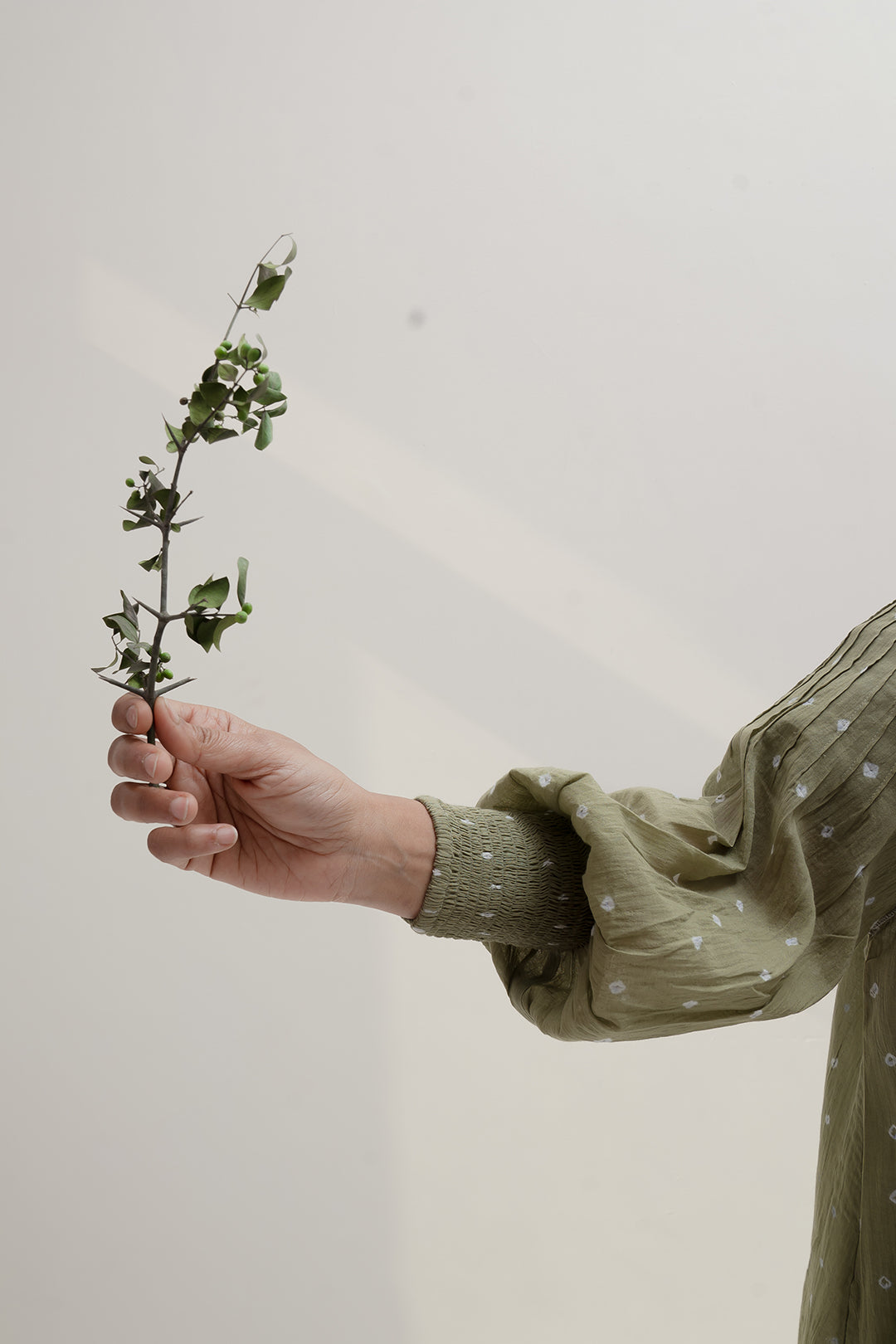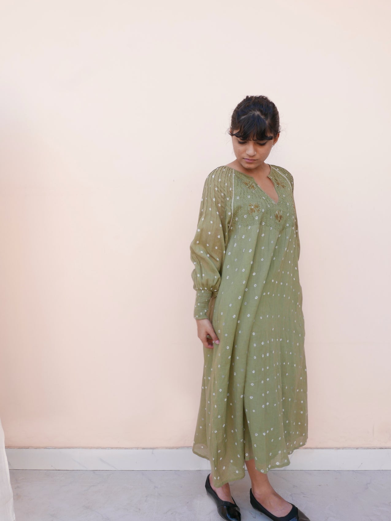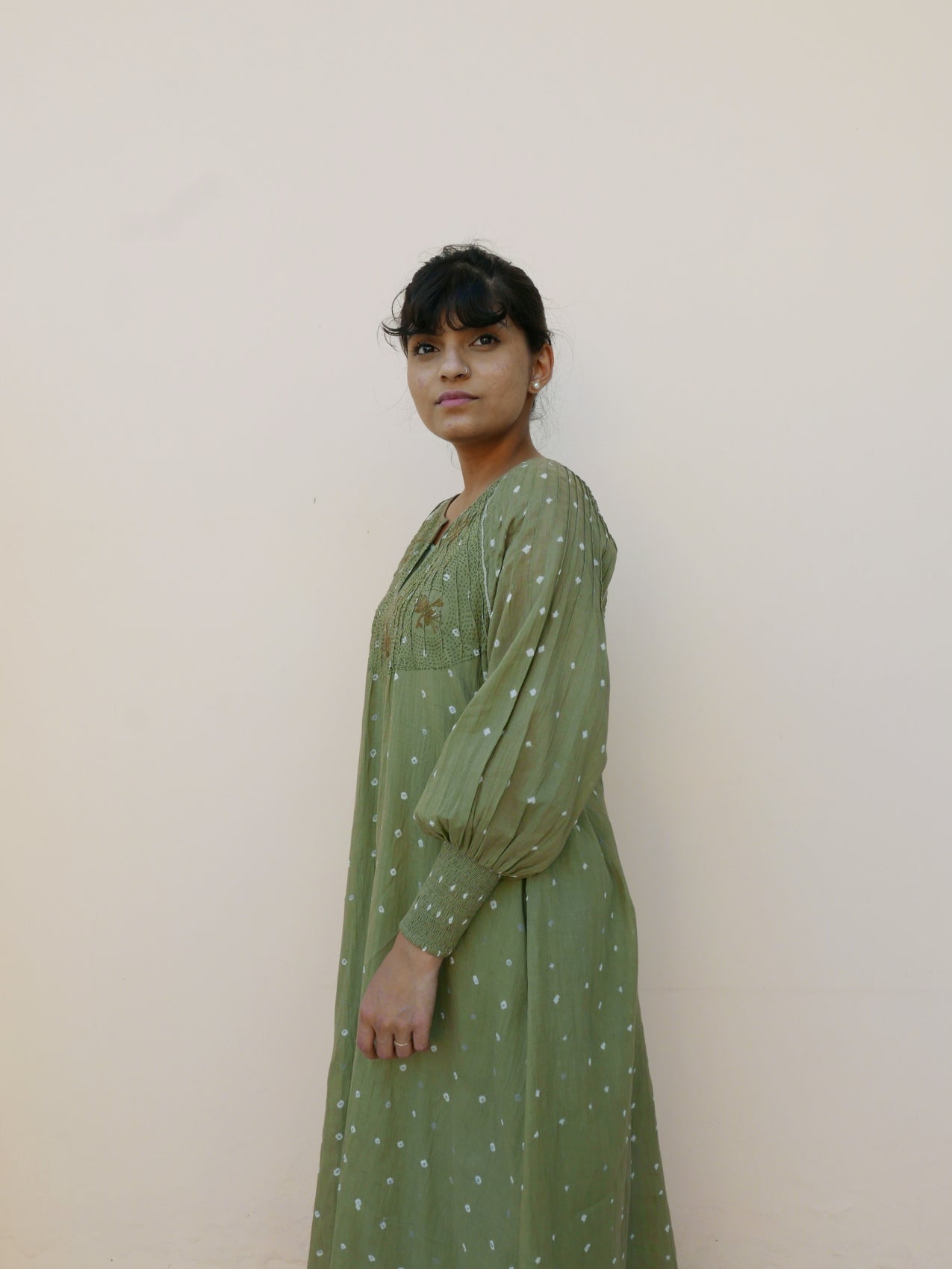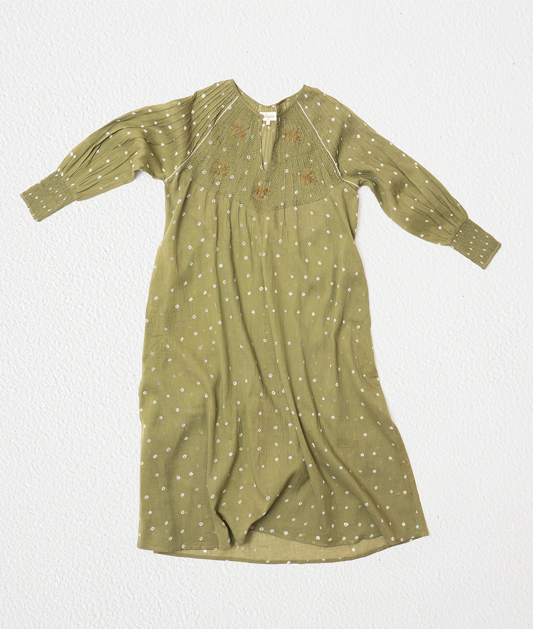 The Jane radiating pin-tuck dress with smocked wrist edges, has a Victorian feel to it. The pin-tuck enhances the silhouette and the smocked wrist adds interest to the sleeves. Seam pockets for utility and the embroidered yoke with a native floral pattern (kair - native to the Aravalli region) . The tie-dyed textile and the hand embroidered details make is a labour of love, and a special garment to have. The airiness and weightlessness will remain with you through the sultry summer months. Experience the comfort and ease in this all day dress.