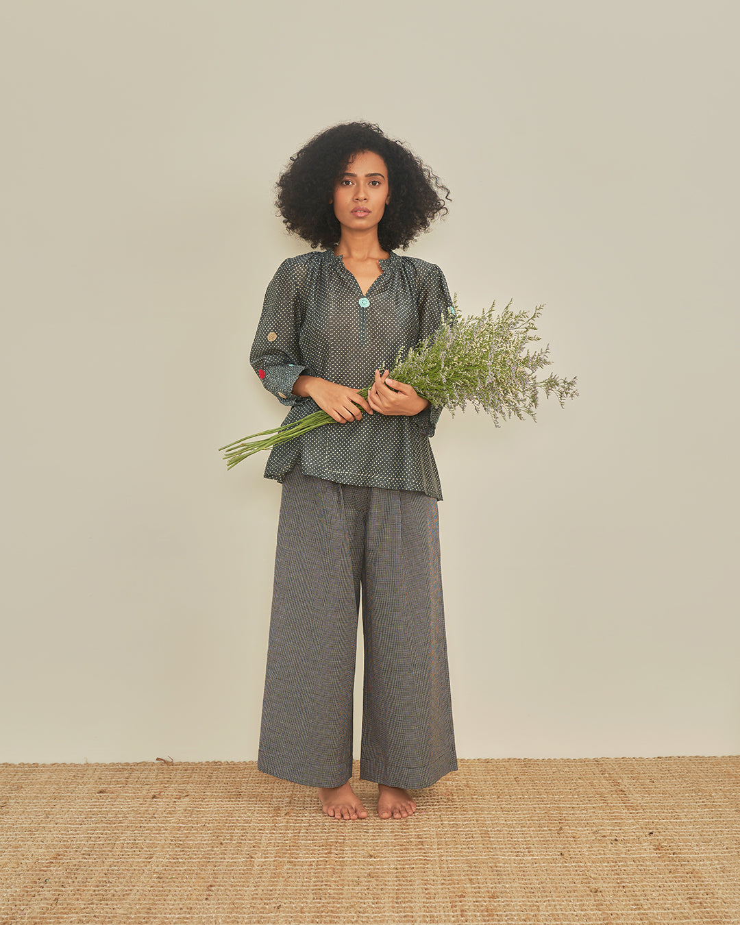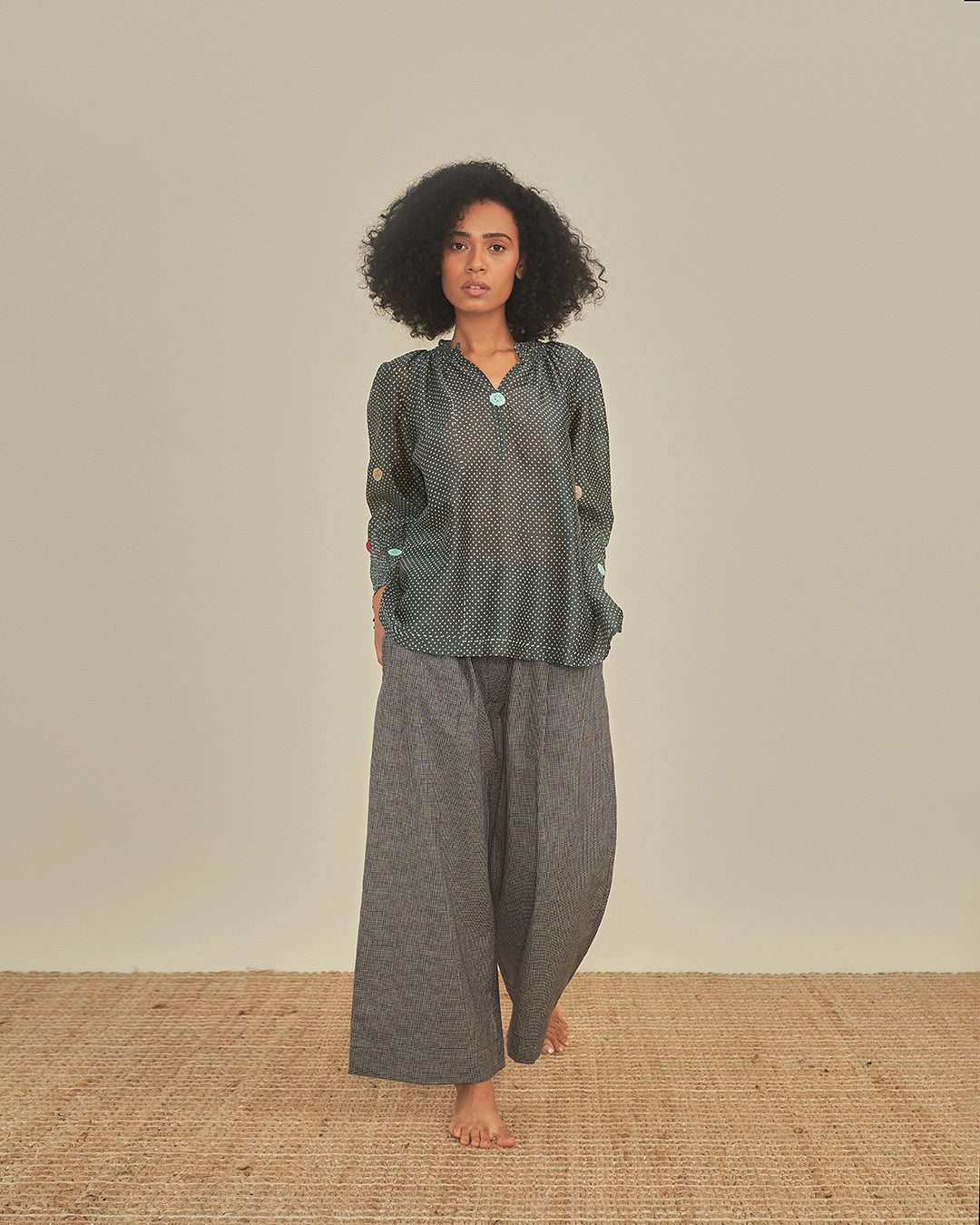 Our Mallorca silk cotton top in polka dots is hand printed and natural dyed. A delicate ruffle neck and smocked detailing on the sleeves adds character to this classic summer top. Easily teams up with a pair of jeans, trousers or a pair or shorts. Perfect as you go strolling by the sea, or just sipping coffee and relaxing. The deep teal colour adds elegance to this top.