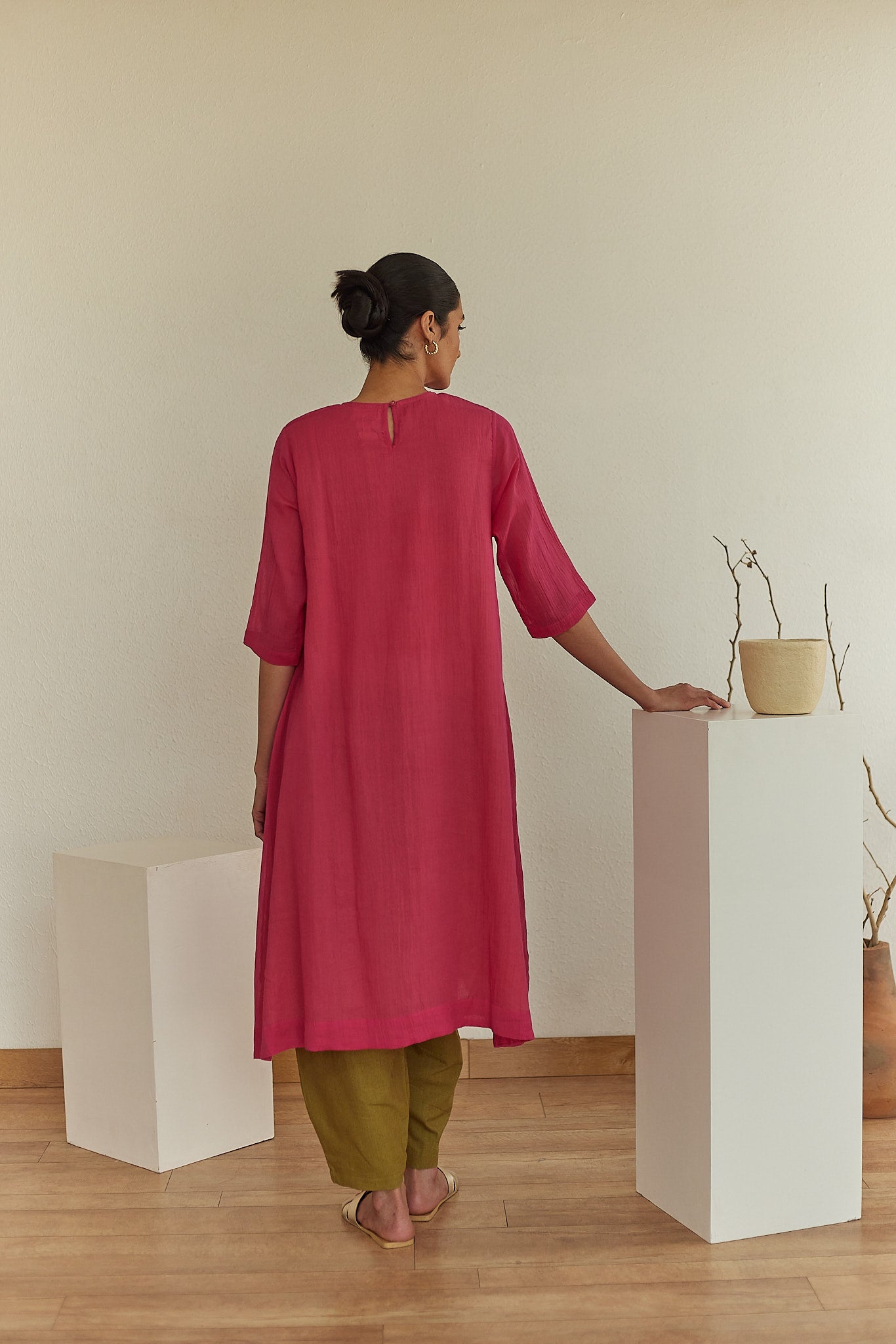 Our Murus kurta in delectable in the softest cotton mulmul, ornate with detailed and textured with our signature sujni embroidery. The kurta has an interesting kerchief hemline. Supple and soft, the fabric is beautiful against your skin. Best teamed up with pants or a traditional churidar this is a must have in your wardrobe for that special evening affair, even if it is at home. Dress up with your favorite accessory or a scarf to complete the look.