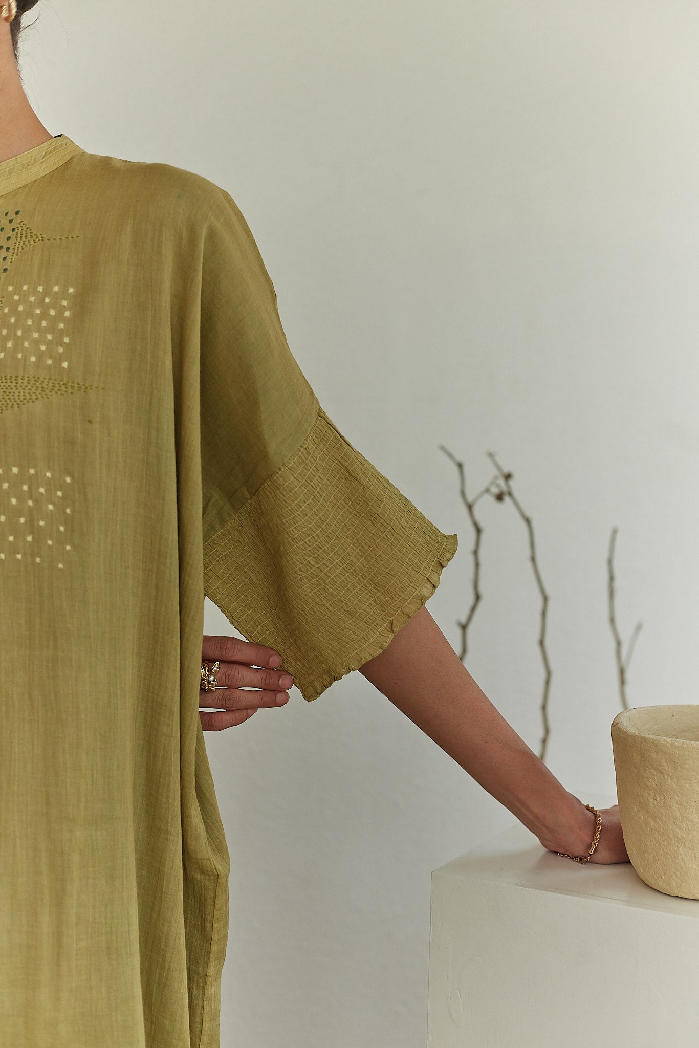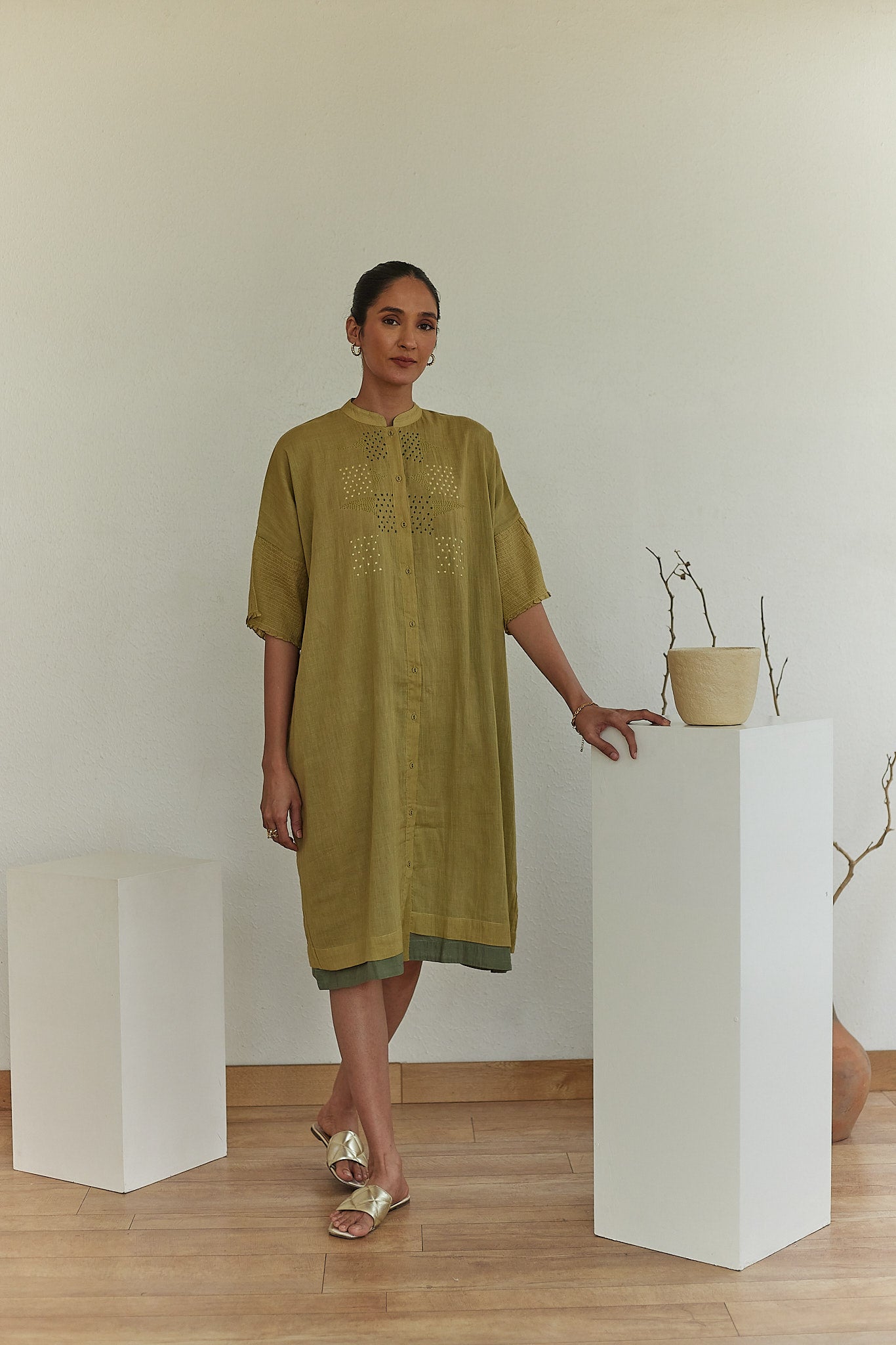 Our Nimbus chonga dress with hand embroidered details is inspired by the easy to wear garments of the traveling / singing nomads, "the "Bauls". This no frill garment is comfortable,  versatile and multipurpose all at the same time, with smocking detail on the sleeves, it makes for a must have this season. Roam around the house or in your garden in our chonga and with a carefree spirit.