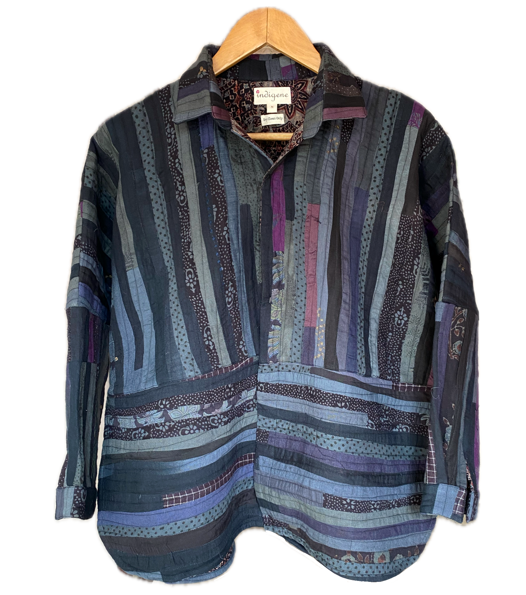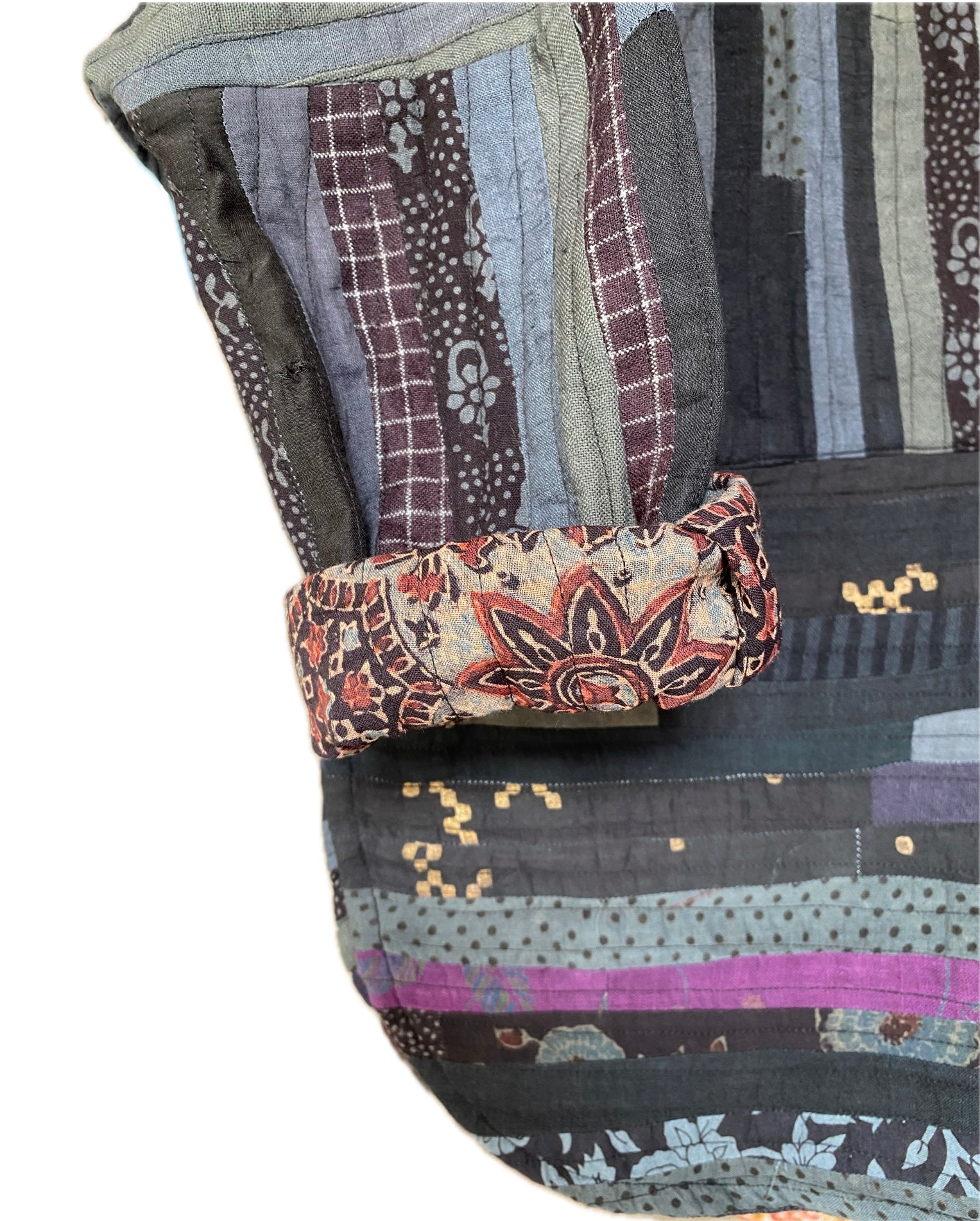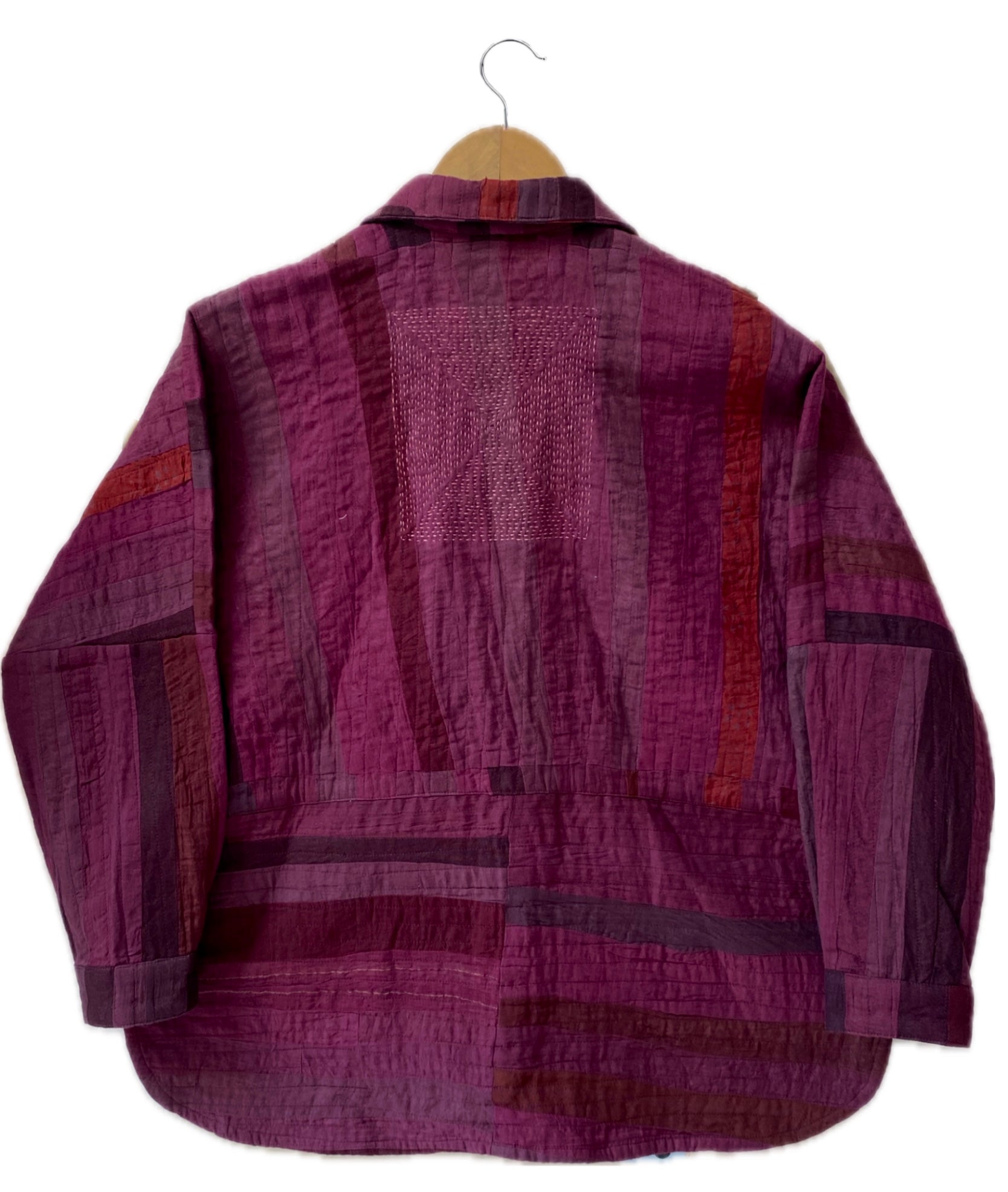 Sustainable by design, this patch-worked over-sized shacket made from recycled fabric is a classic. Kimono sleeves and a quilted layer makes it a comfortable wear, with cuff and button. The subtle hand embroidered detail on the back adds more effect to the garment. Leave the buttons open and wear it as a jacket or button up for a smart shirt with denims or casual trousers.