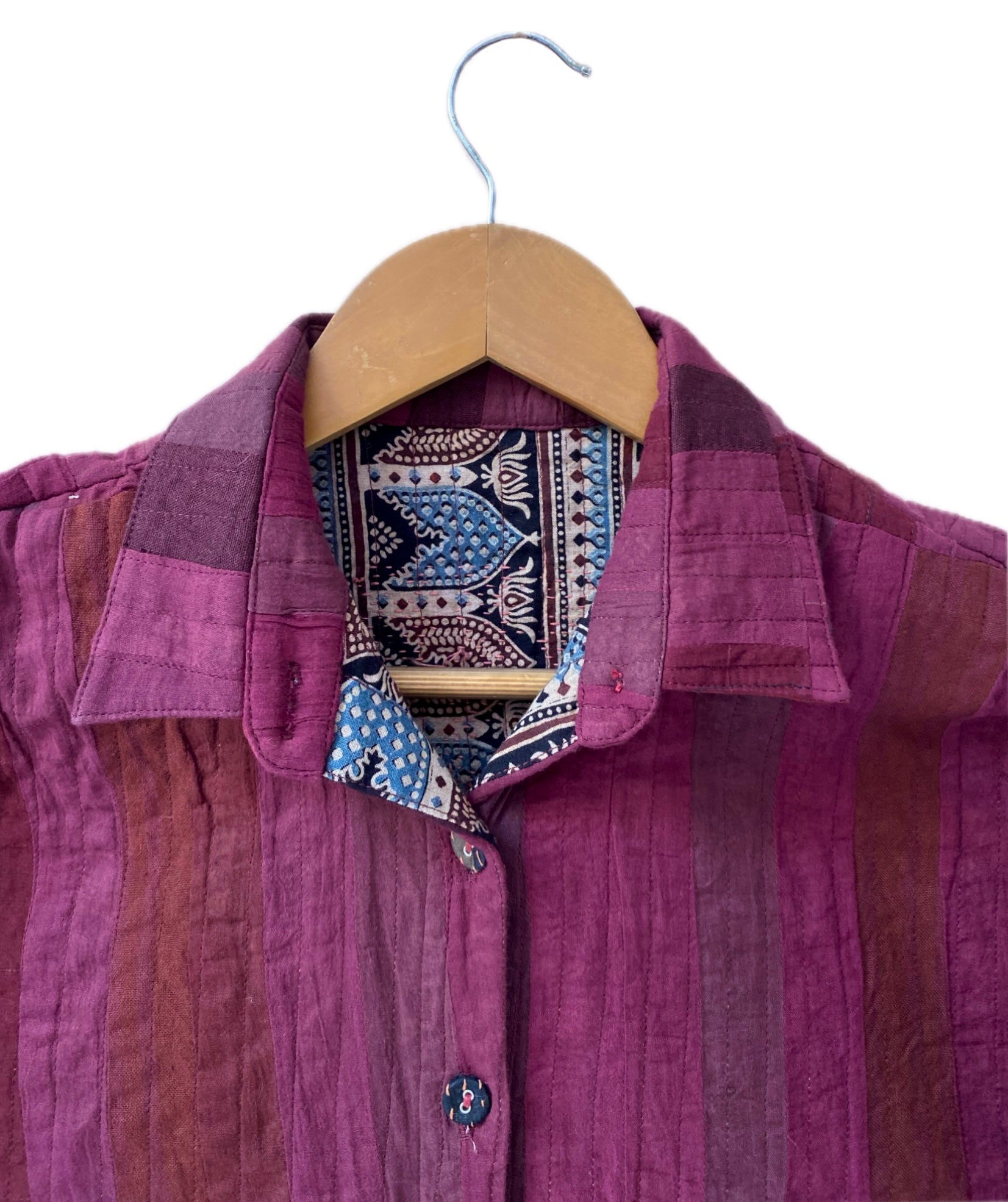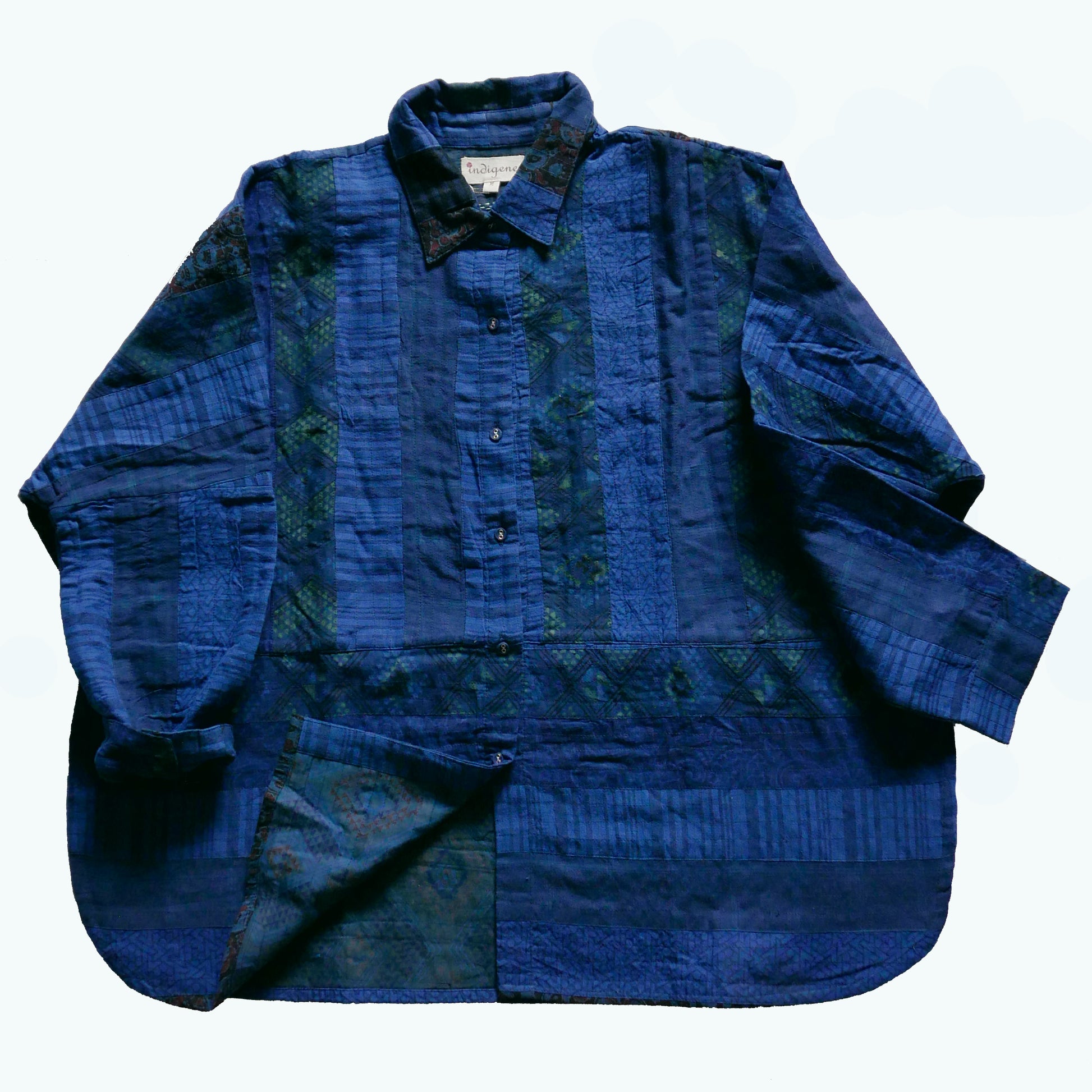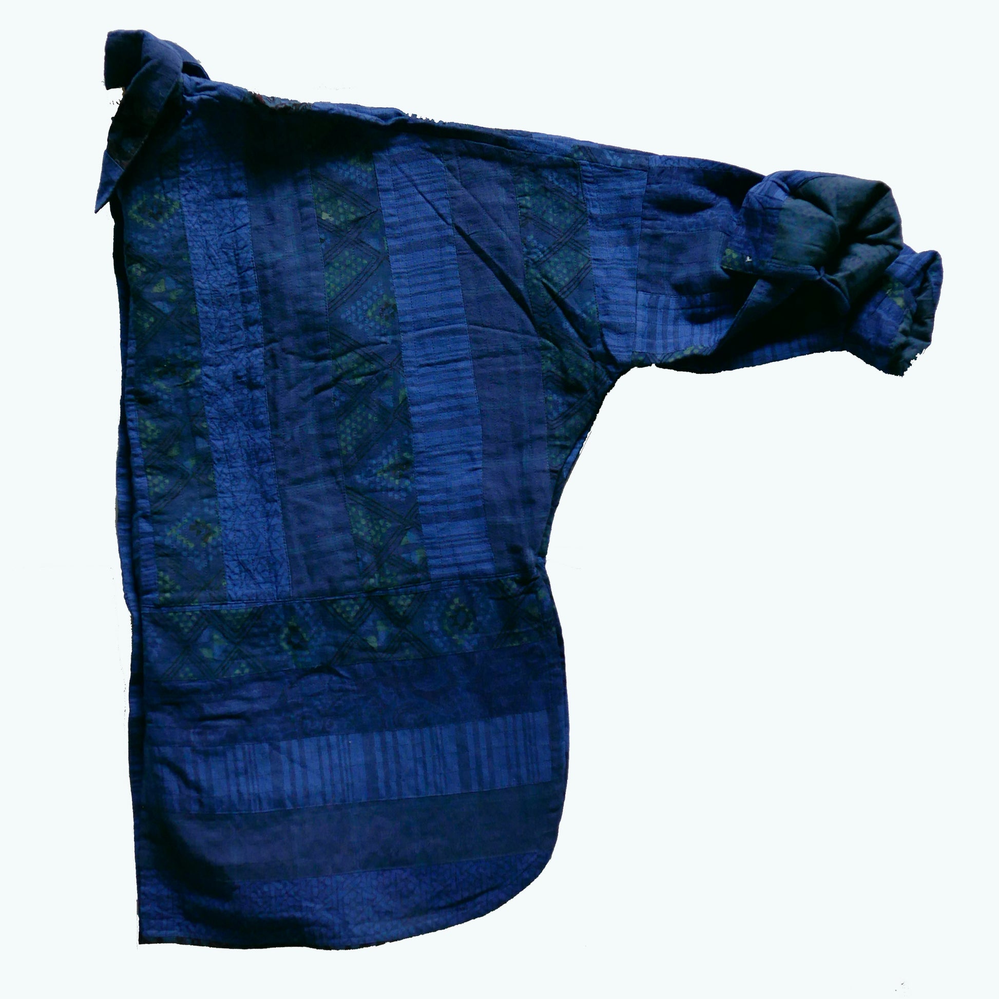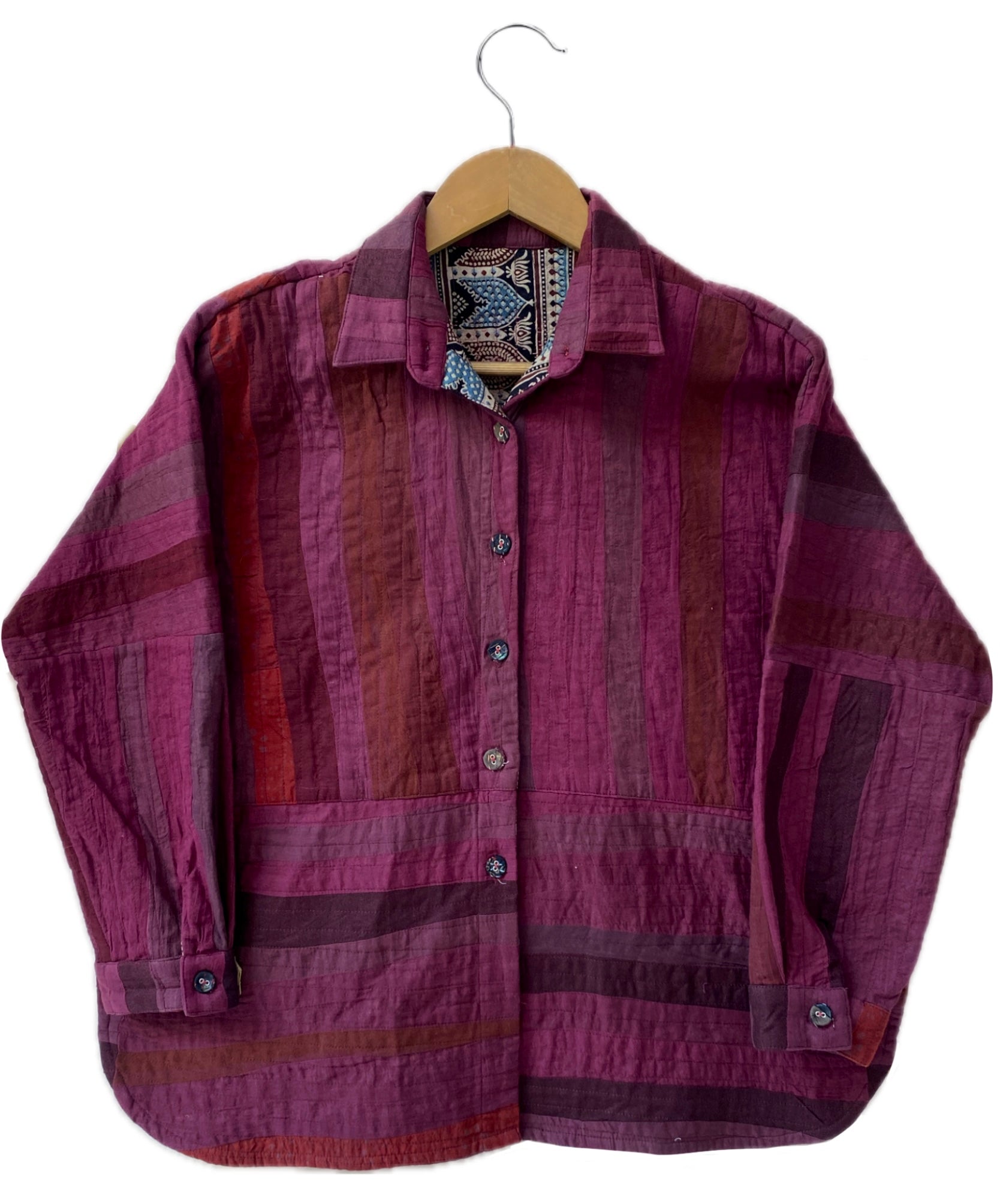Sustainable by design, this patch-worked over-sized shacket made from recycled fabric is a classic. Kimono sleeves and a quilted layer makes it a comfortable wear, with cuff and button. The subtle hand embroidered detail on the back adds more effect to the garment. Leave the buttons open and wear it as a jacket or button up for a smart shirt with denims or casual trousers.