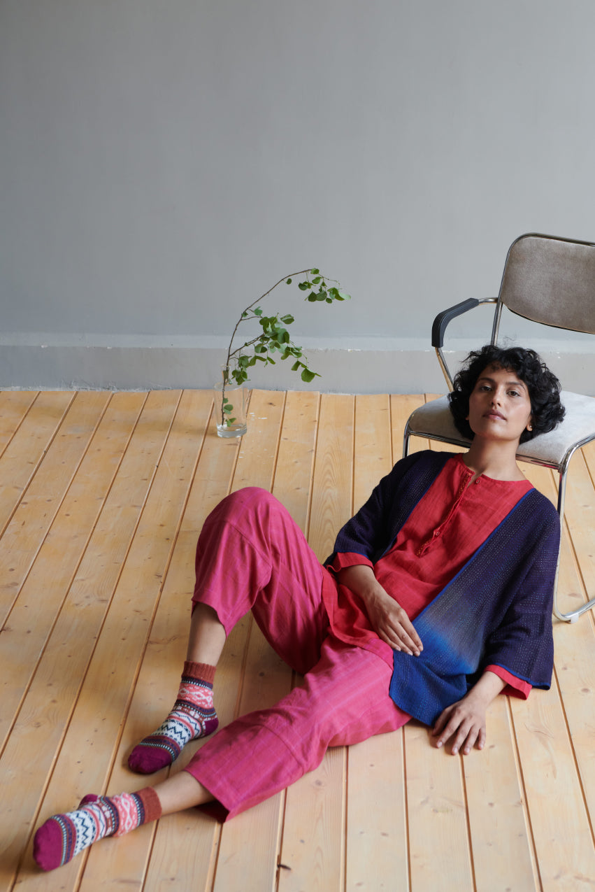 Light weigh and versatile, our Perry wool overlay is a great over garment to have. Ease, comfort and functionality are key to Indigene style and the ruby overlay fits right in the philosophy. Spice up a simple inner garment with this exquisitely handcrafted merino jacket. Double tones, embroidered detail and silk trims add more nuance to this simple garment.