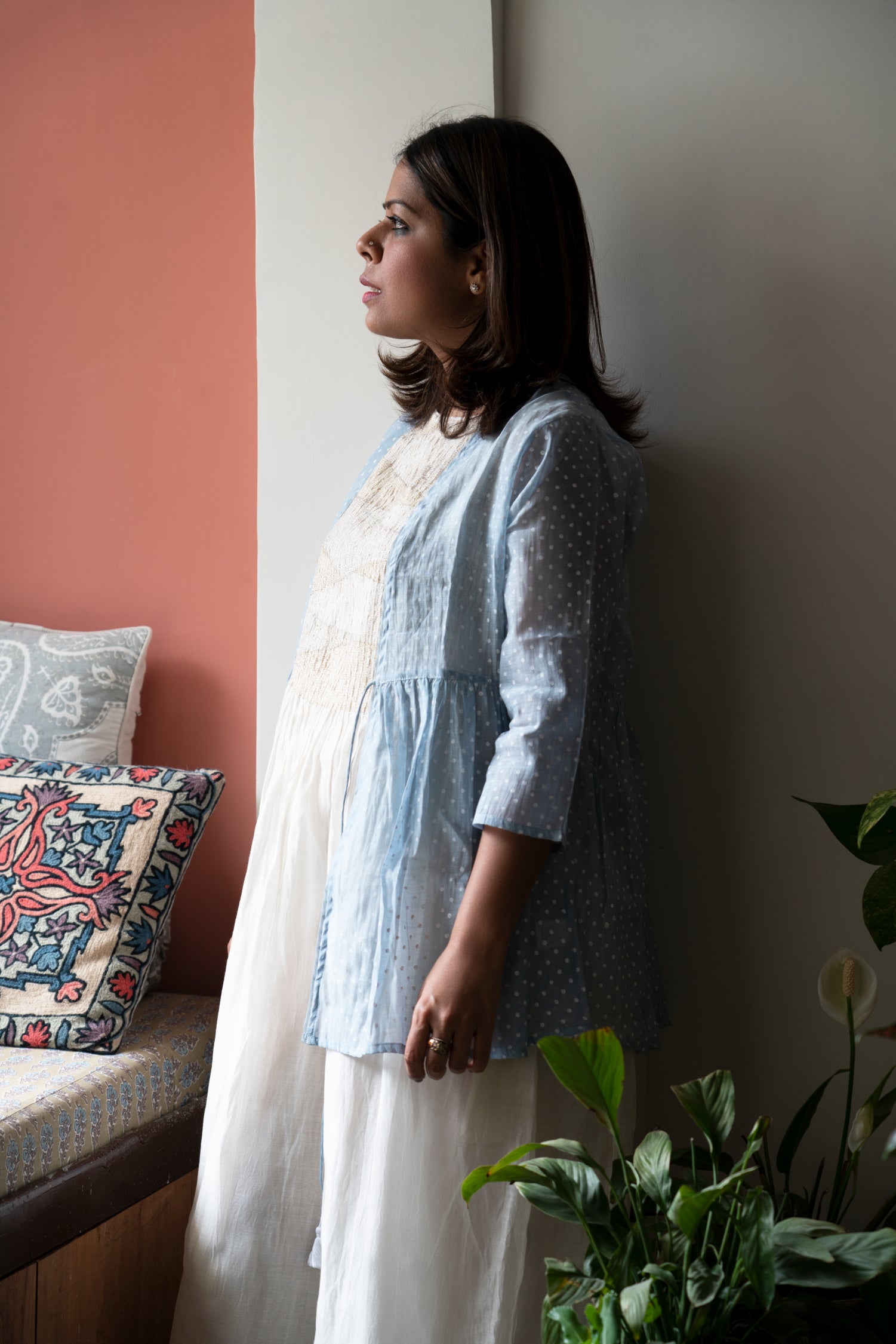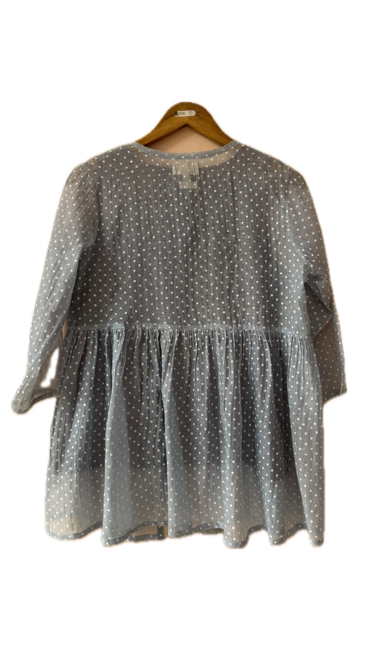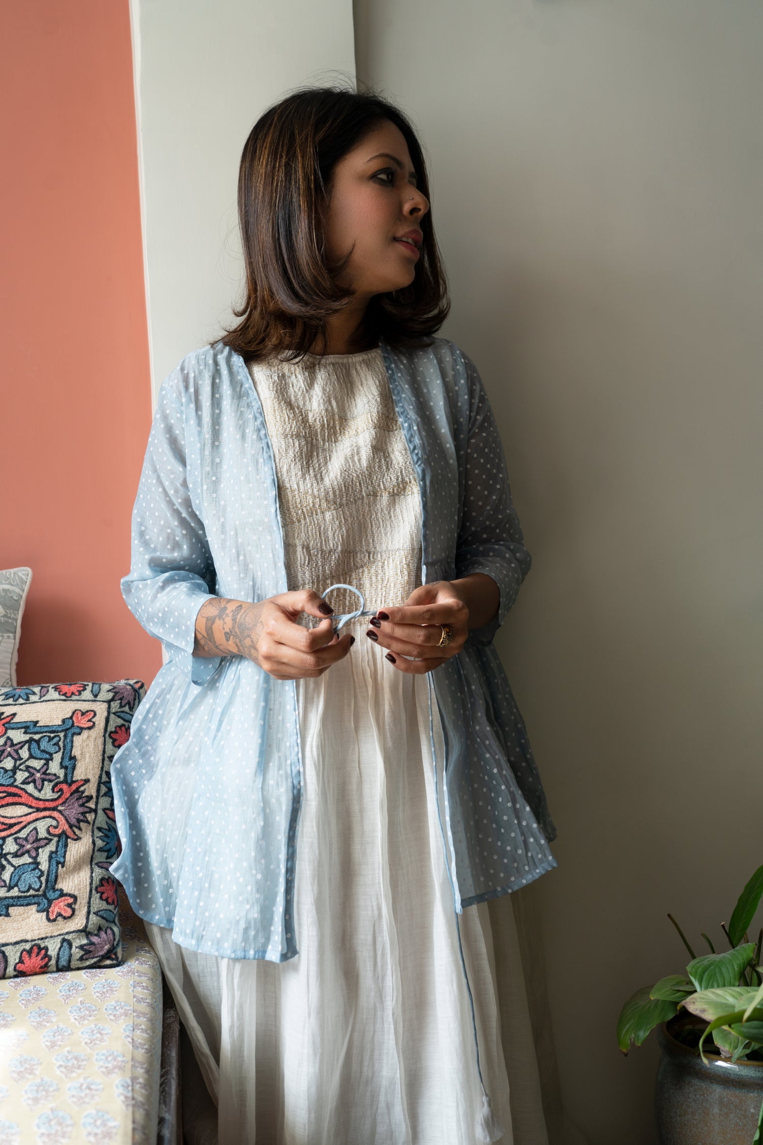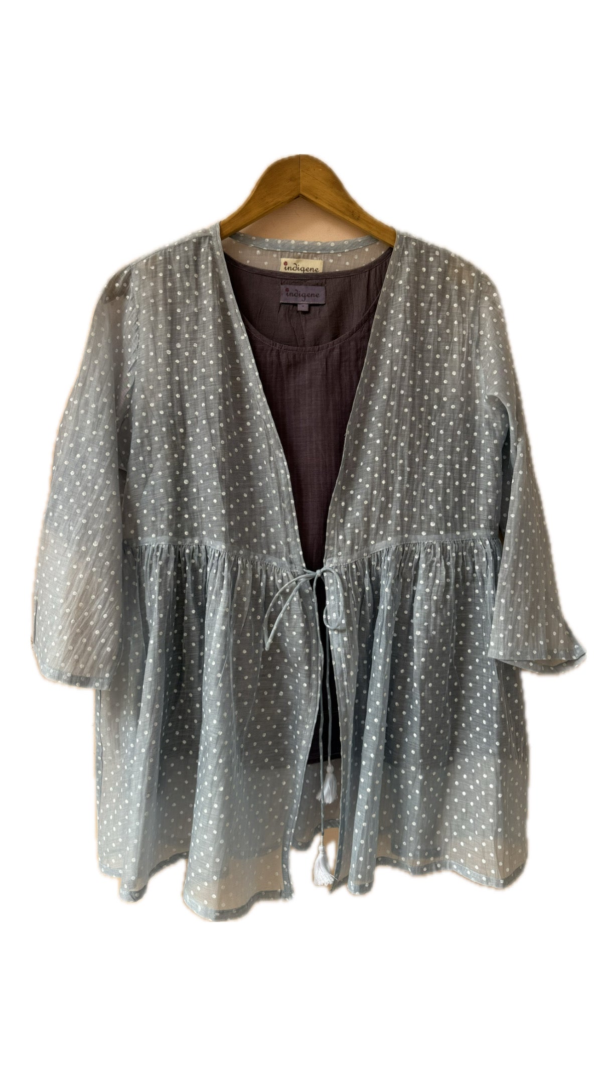 The Polka printed silk cotton overlay proves to be a super versatile companion this season. Light as a feather, easy to pack and multi optional. Wear it as a cover up, dress up that camisole and get ready for a zoom meeting, or wear it to your little trip to the market. Makes even a simple tee look gorgeous. Perfect anytime of the day.