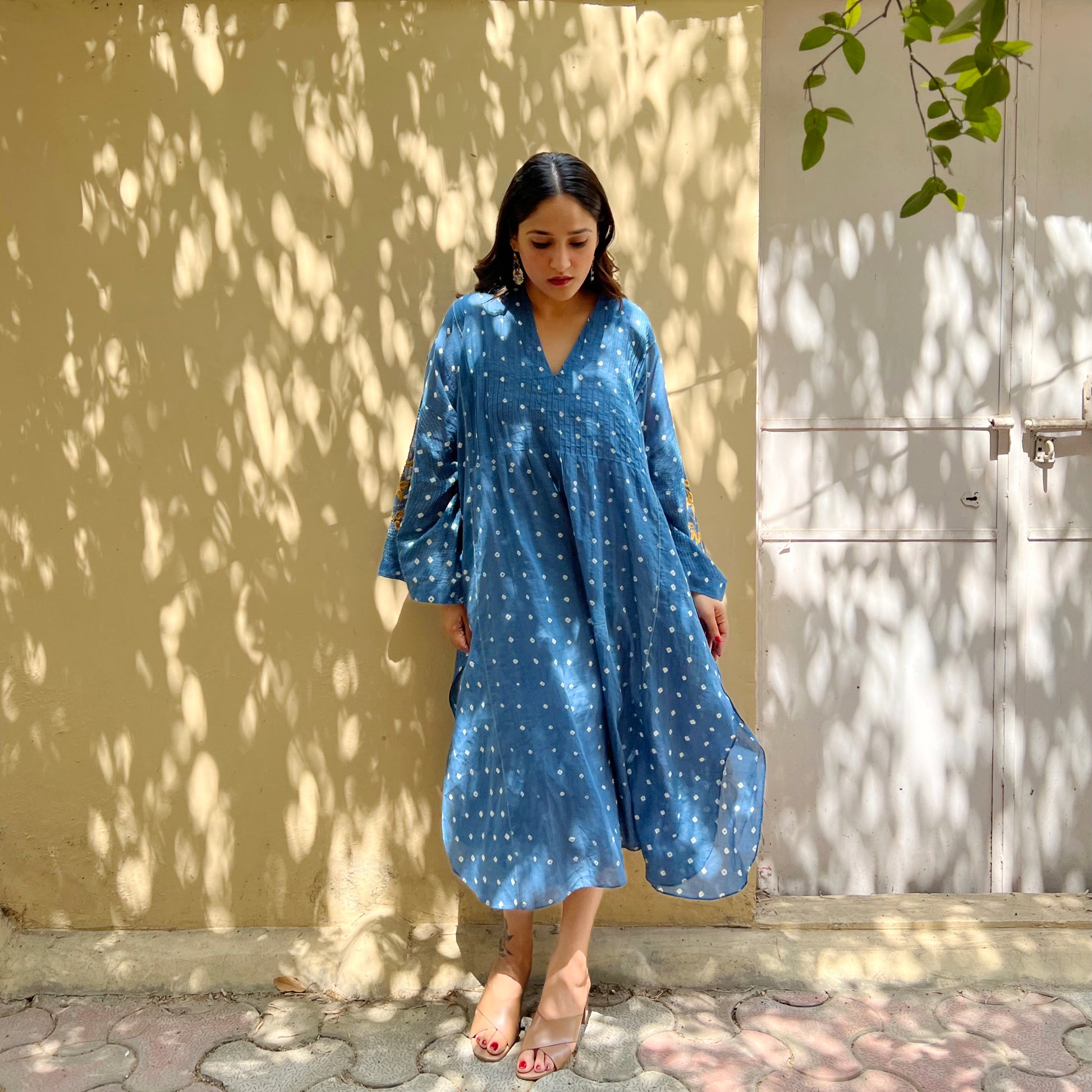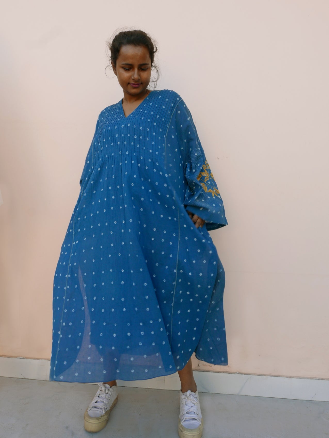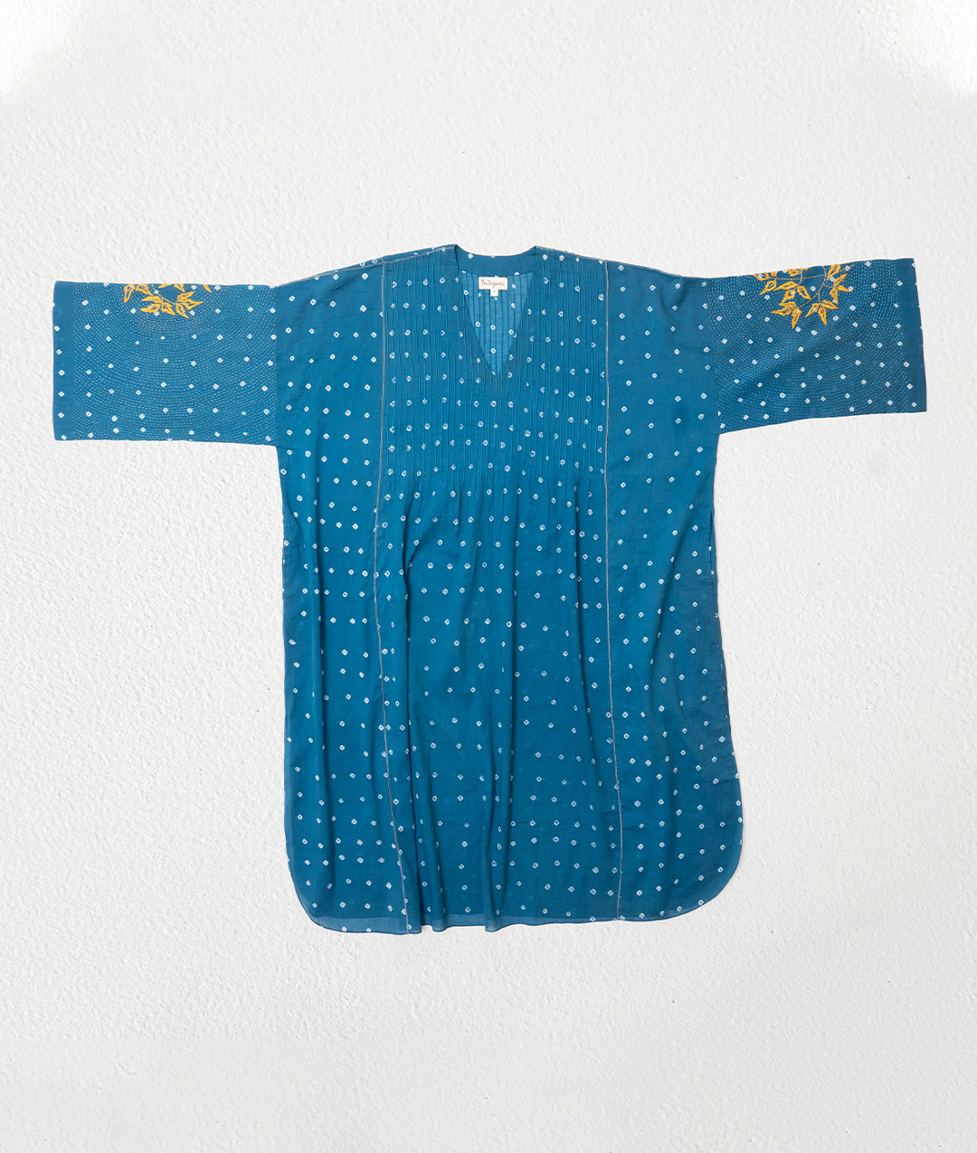 The Rania kaftan is the most comfortable garment you will get in this summer. The lightness of it's being is perfect to ward off hot days, cool off at a beach or just by your window at home in this most comfy outfit. Stay in all day, that is what kaftans are for. The tie-dyed textile and the hand embroidered details all over the dress make is a labour of love, and is a special garment to have.