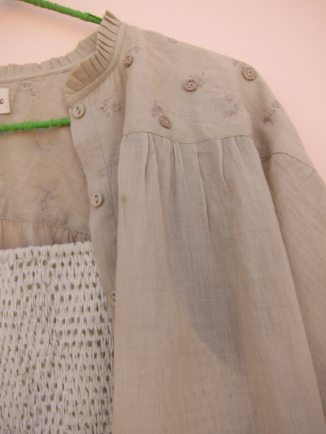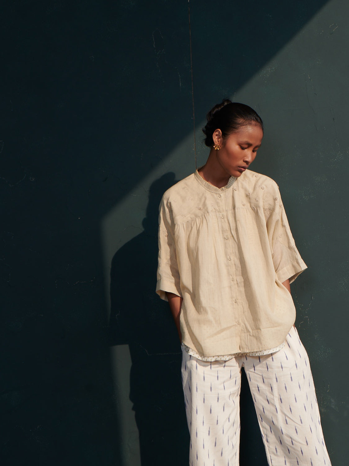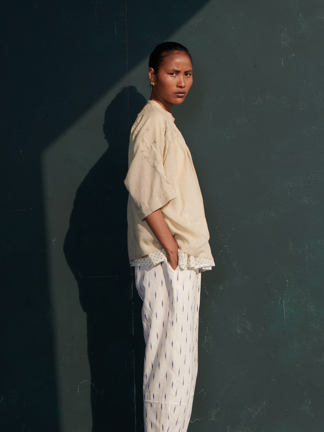 The Rue raglan top with hand embroidered and crocheted details is a great coordinate. Team them up together or individually for the perfect match to your trousers or shorts this summer. Dress up or dress down in this fun combination garment. A must have this season, enjoy the lightness and ease through the day.