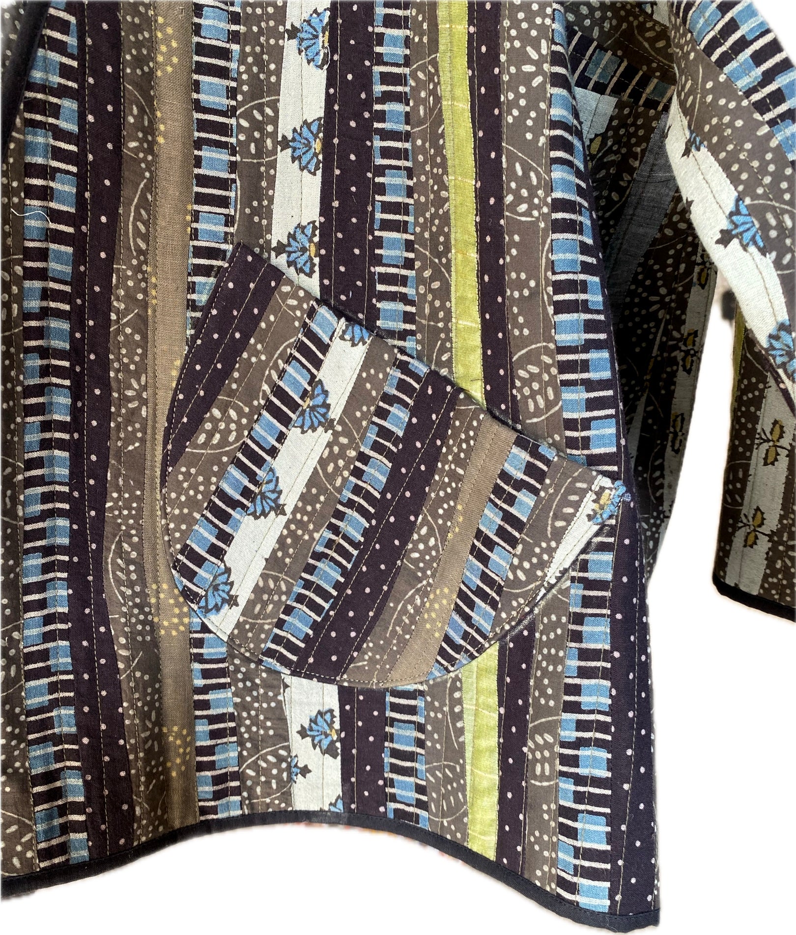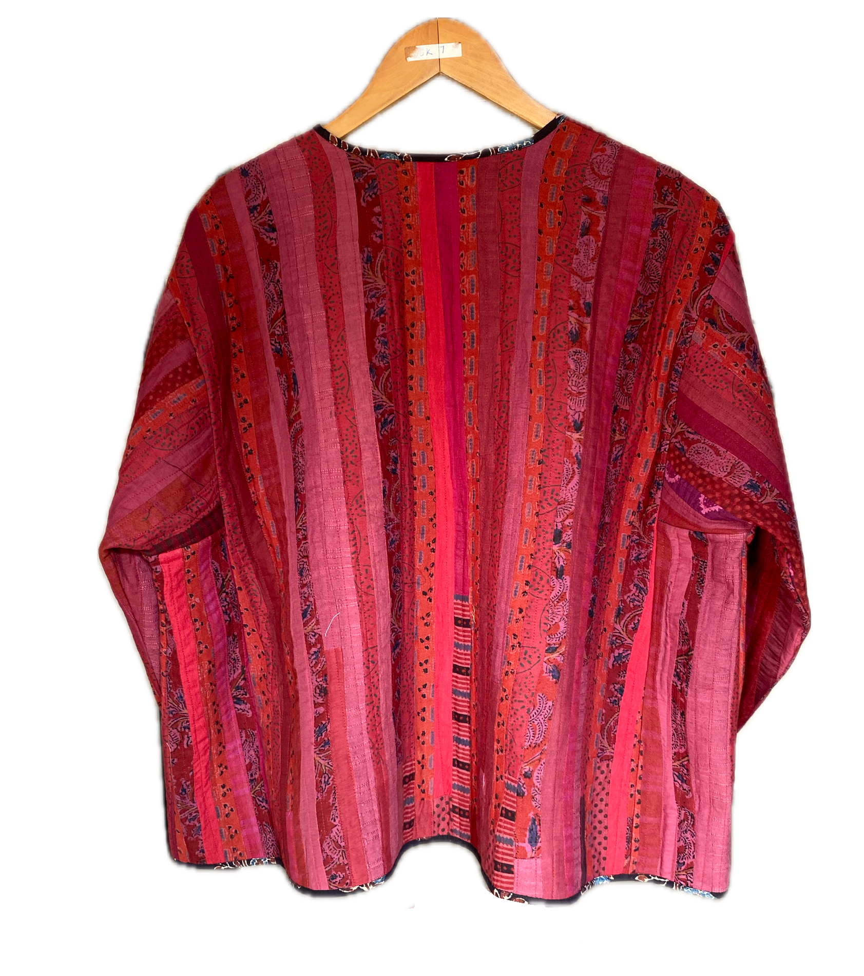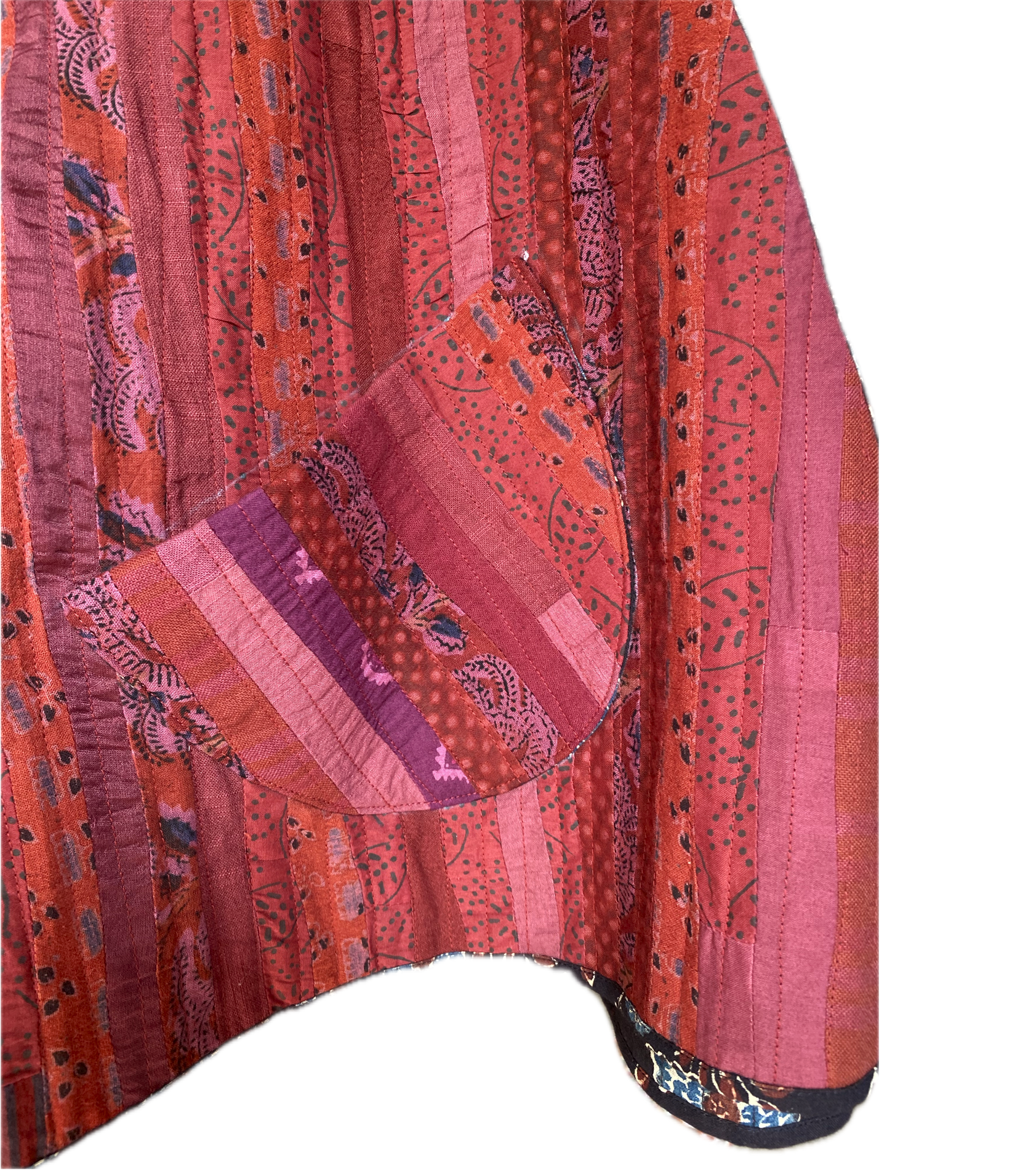 Jackets have always been a versatile piece of clothing. Born around the early nineteenth century, it was introduced as an over garment for the working folk in fields and factories, later this rugged garment went on to become a more formal and refined version. Our exquisitely crafted re-purposed Sora jacket featured with overlap front and patched half moon pockets. The detailed patchwork and embroidered accents add to this zero waste, must have jacket, A perfect layering option. Wear to work, pleasure or travels as cooler weather approaches.