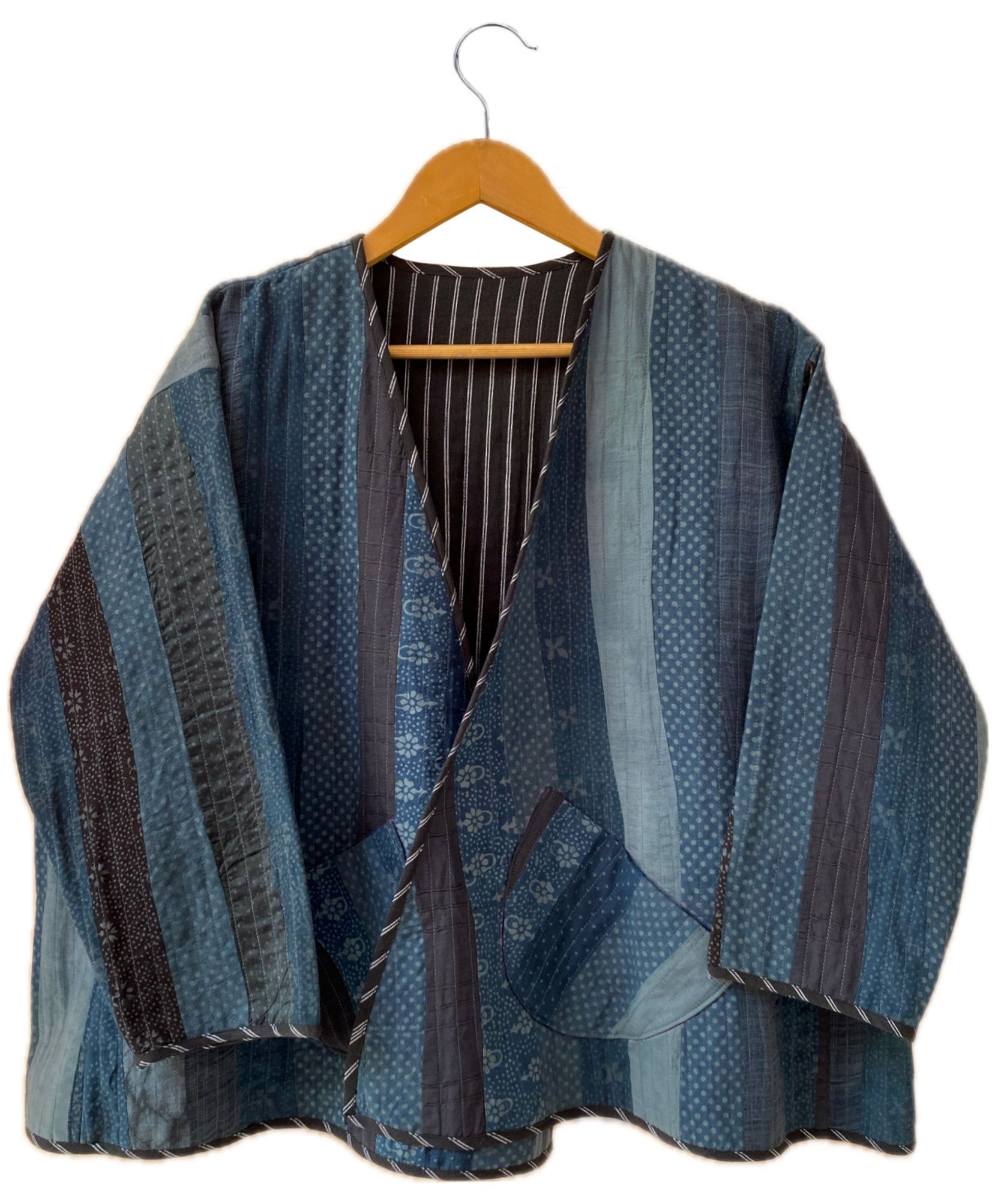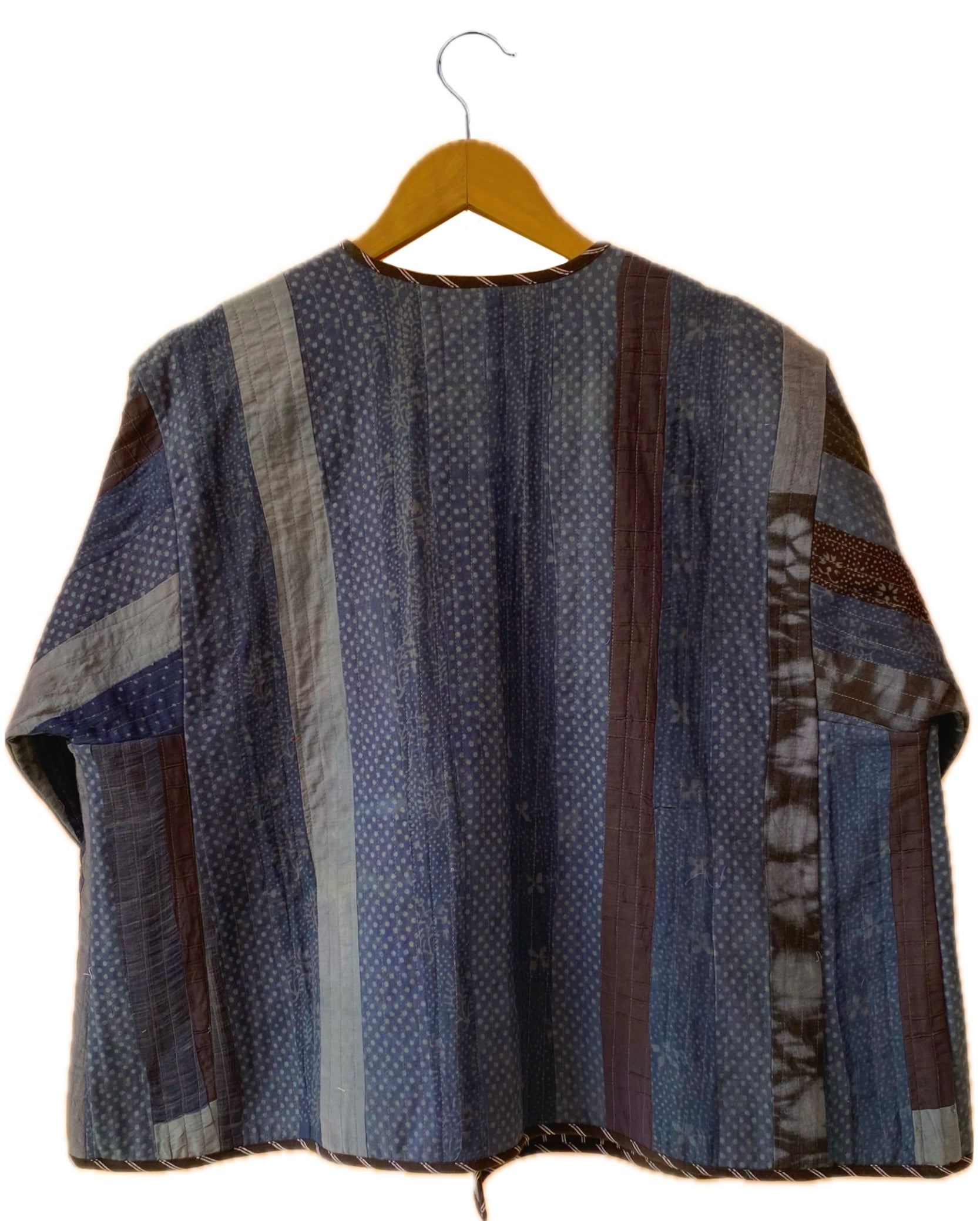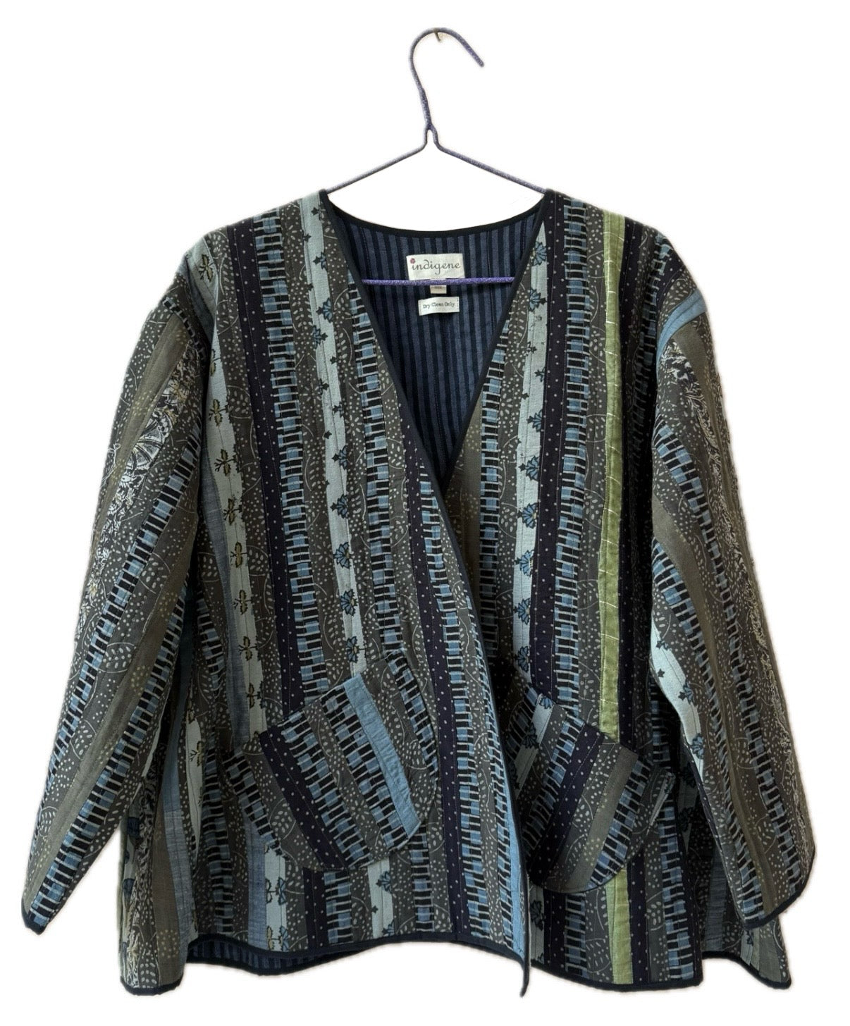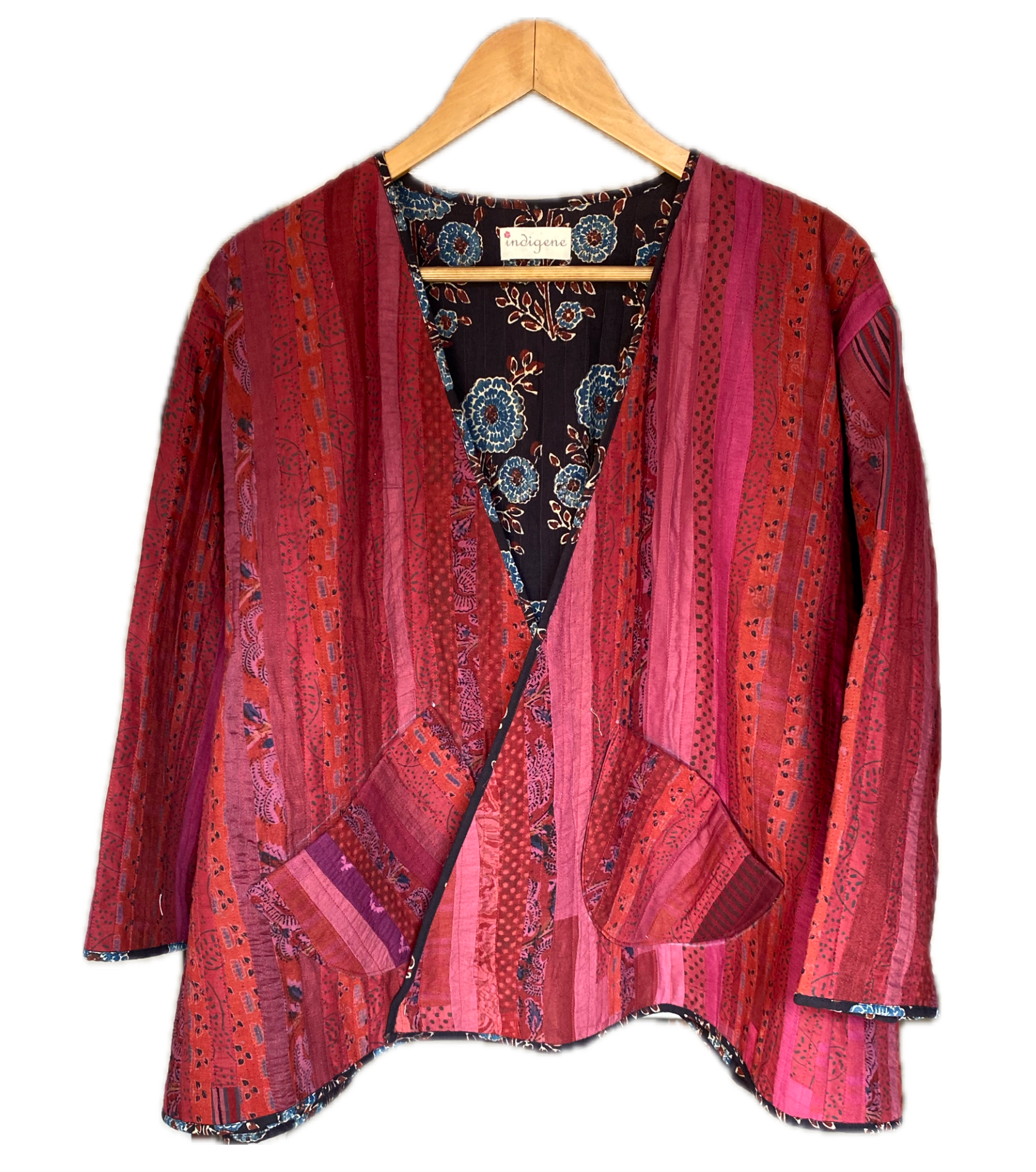 Jackets have always been a versatile piece of clothing. Born around the early nineteenth century, it was introduced as an over garment for the working folk in fields and factories, later this rugged garment went on to become a more formal and refined version. Our exquisitely crafted re-purposed Sora jacket featured with overlap front and patched half moon pockets. The detailed patchwork and embroidered accents add to this zero waste, must have jacket, A perfect layering option. Wear to work, pleasure or travels as cooler weather approaches.