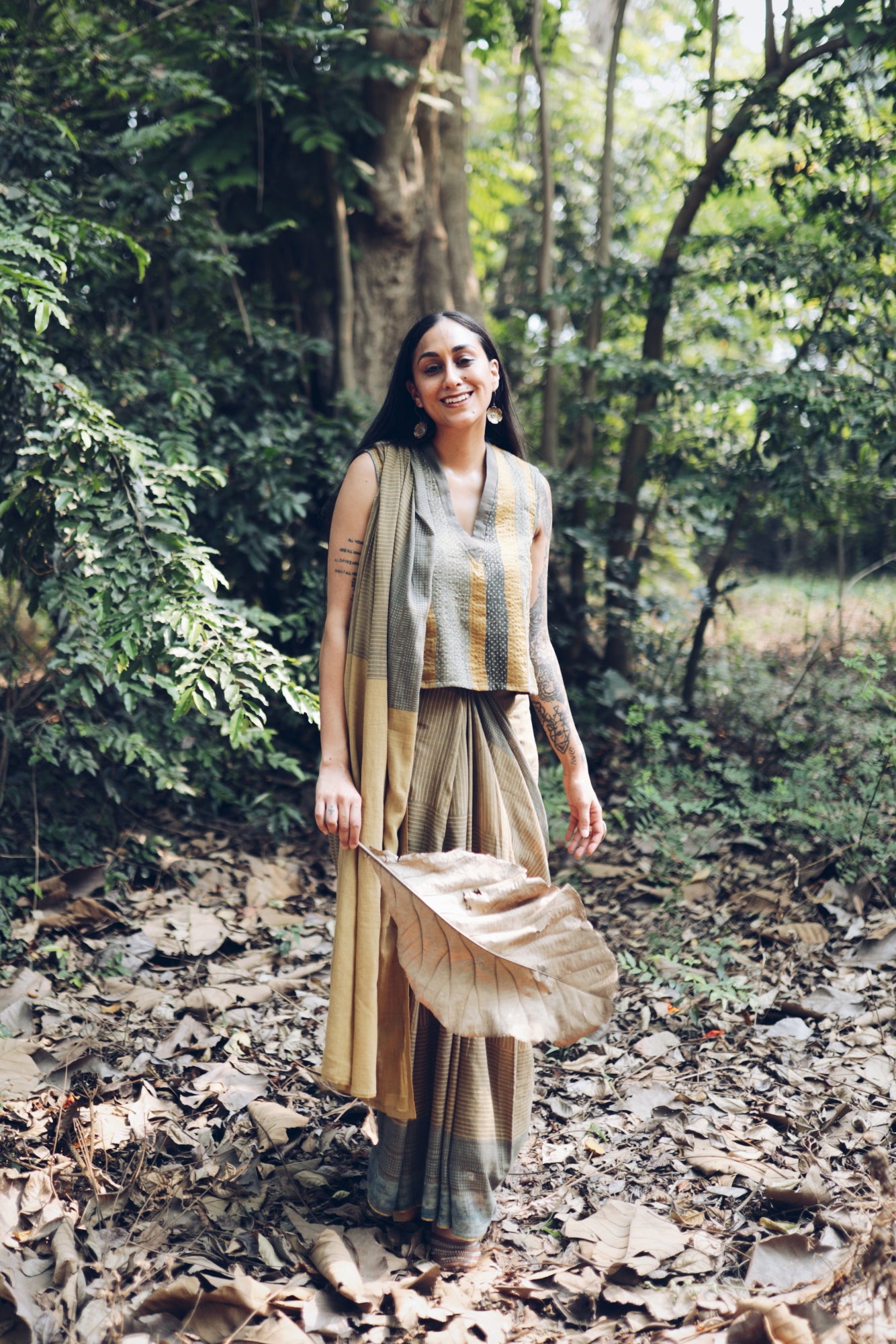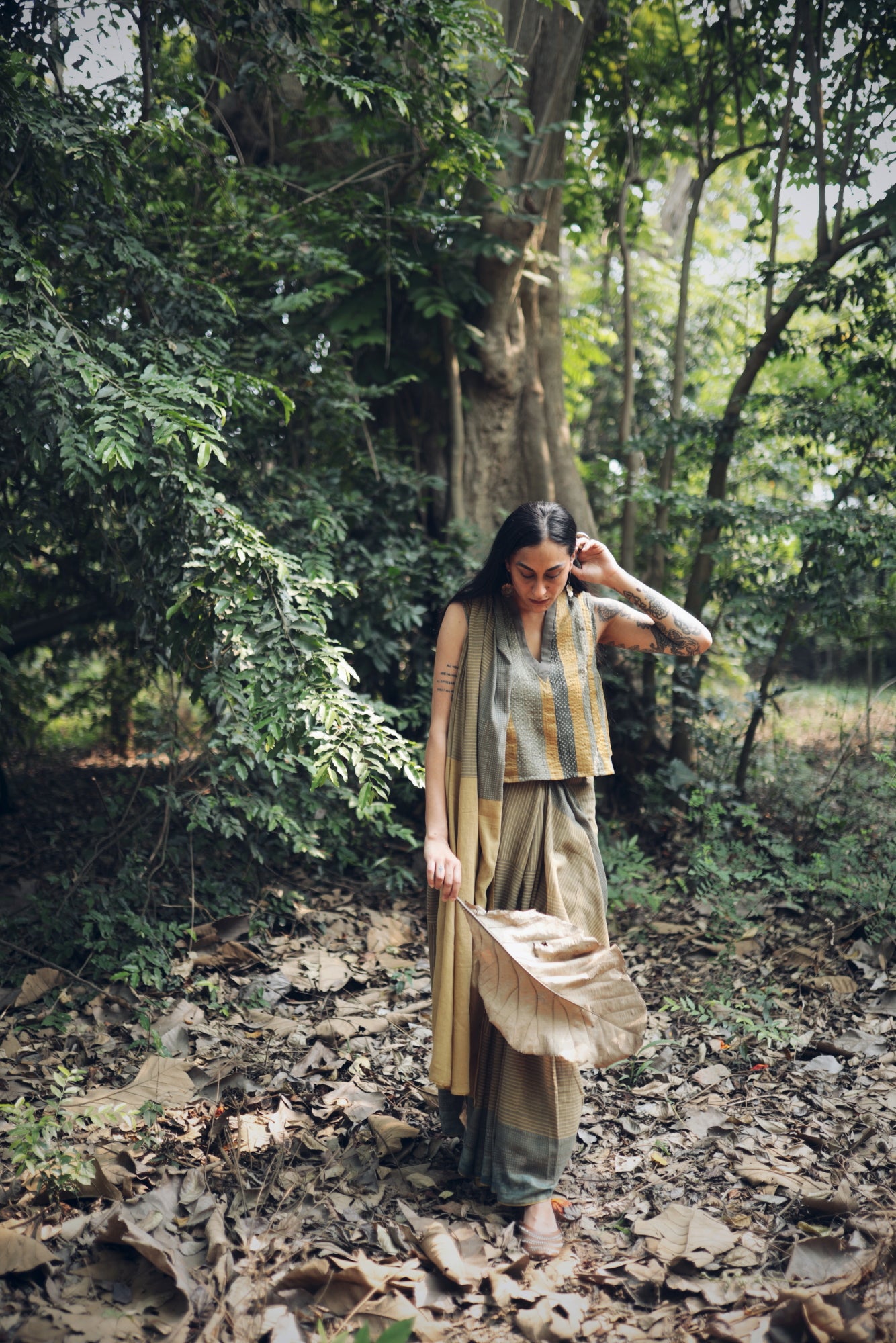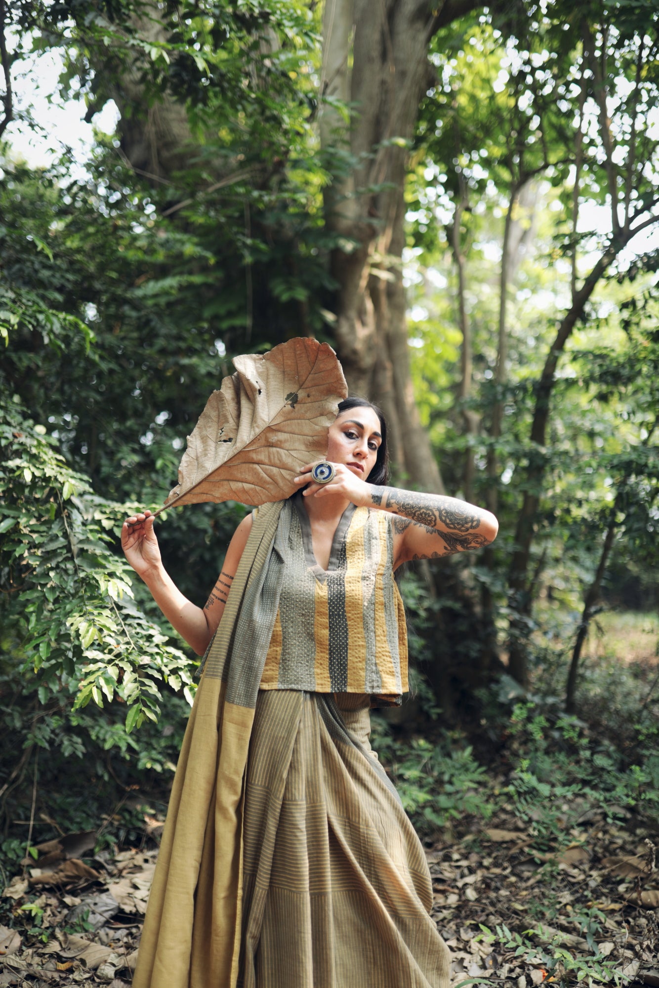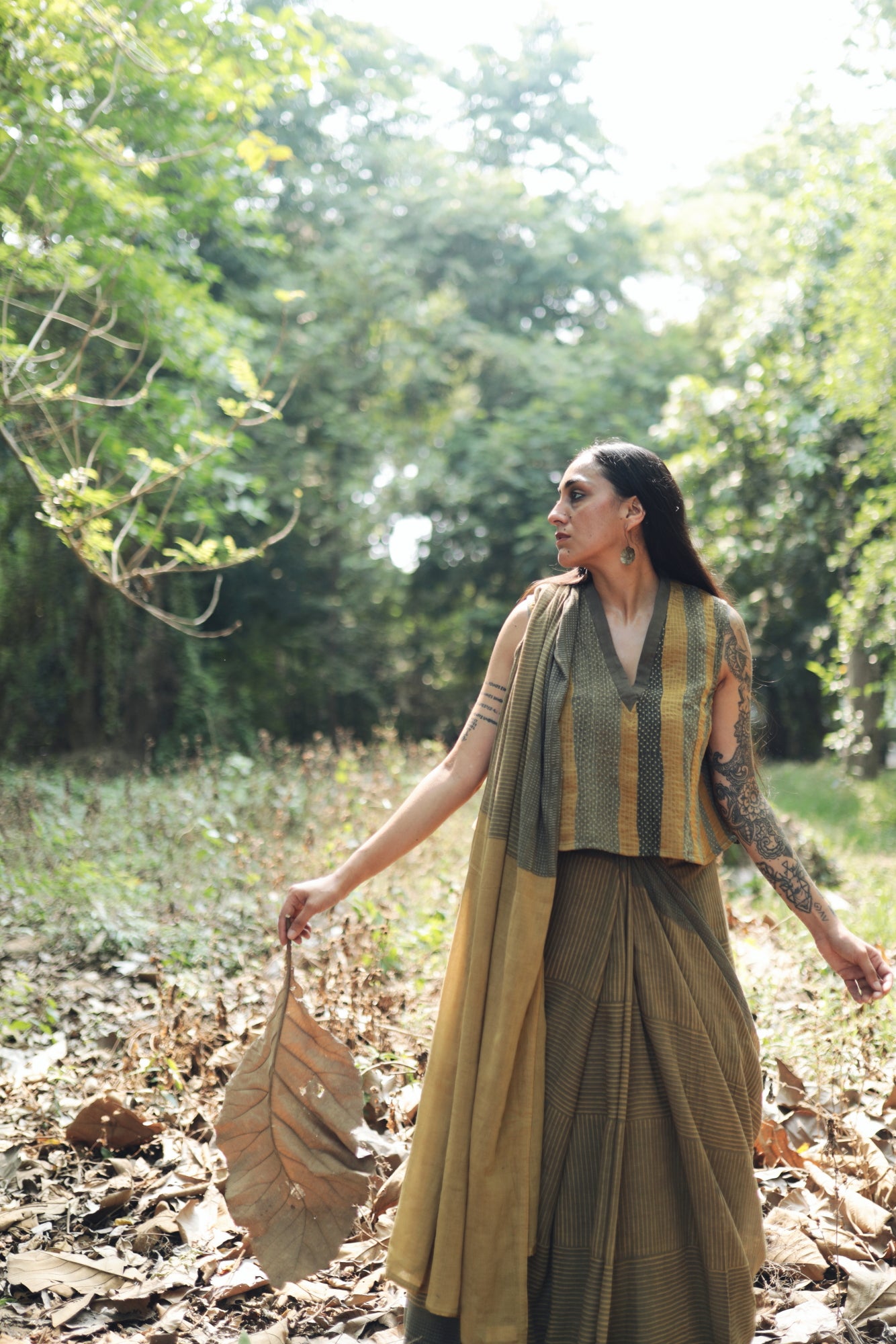 Colour overlap, dye sprinkles and a few spot imperfections here and there are inherent to these saris. The painting technique includes 8-12 steps of printing, painting, dyeing and washing. Leaving the fabric ephemeral and supple.