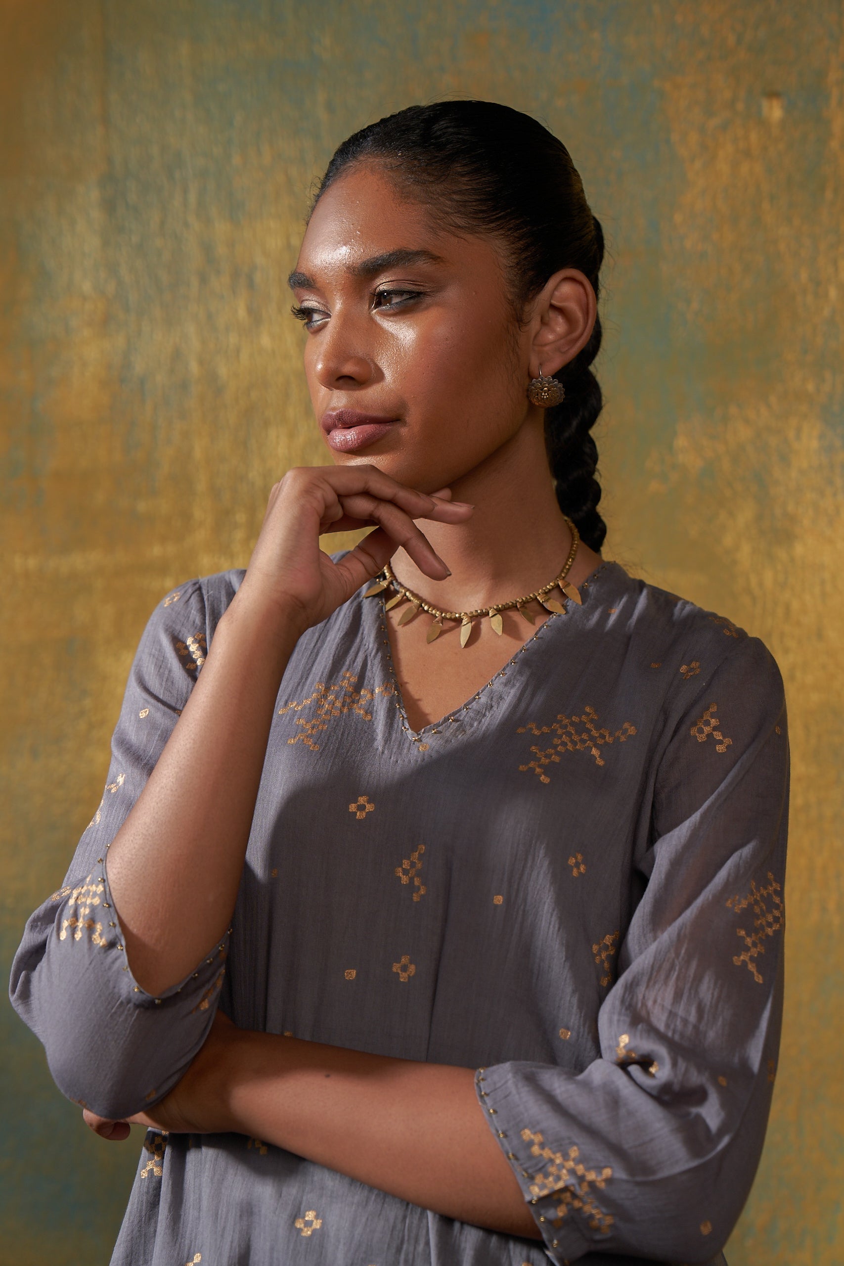 Make a style statement with our Surmayi gold printed V neck Kurta. Its chic, clean design and subtle hints of gold make it the perfect evening wear for a special occasion. The luxuriously soft mulmul fabric and timeless silhouette will ensure you look timeless, the delicate bead work on the neck and sleeves is elegant, and adds sophistication.
