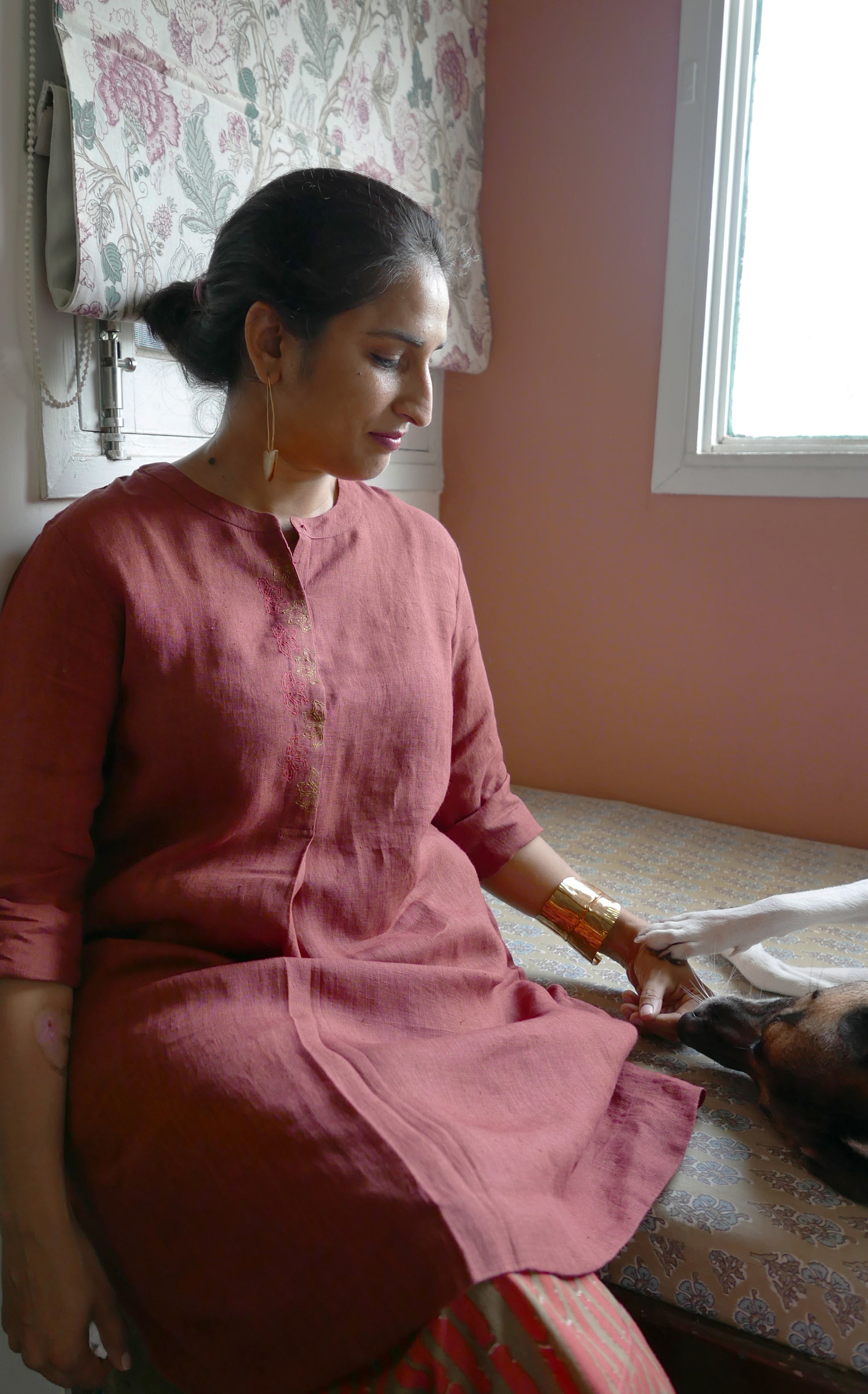 Classic and comfortable, the Ume linen tunic with hand embroidered placket details, buttoned cuff, pleat and pocket details makes for a wardrobe must have. Classic and elegant easy to team up with. Best coordinated with our relaxed elasticated waist printed pants.