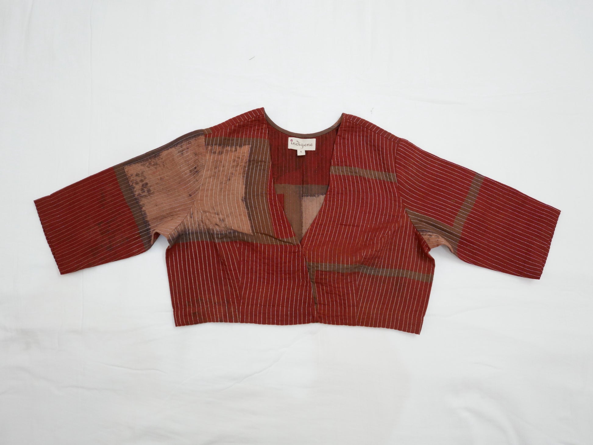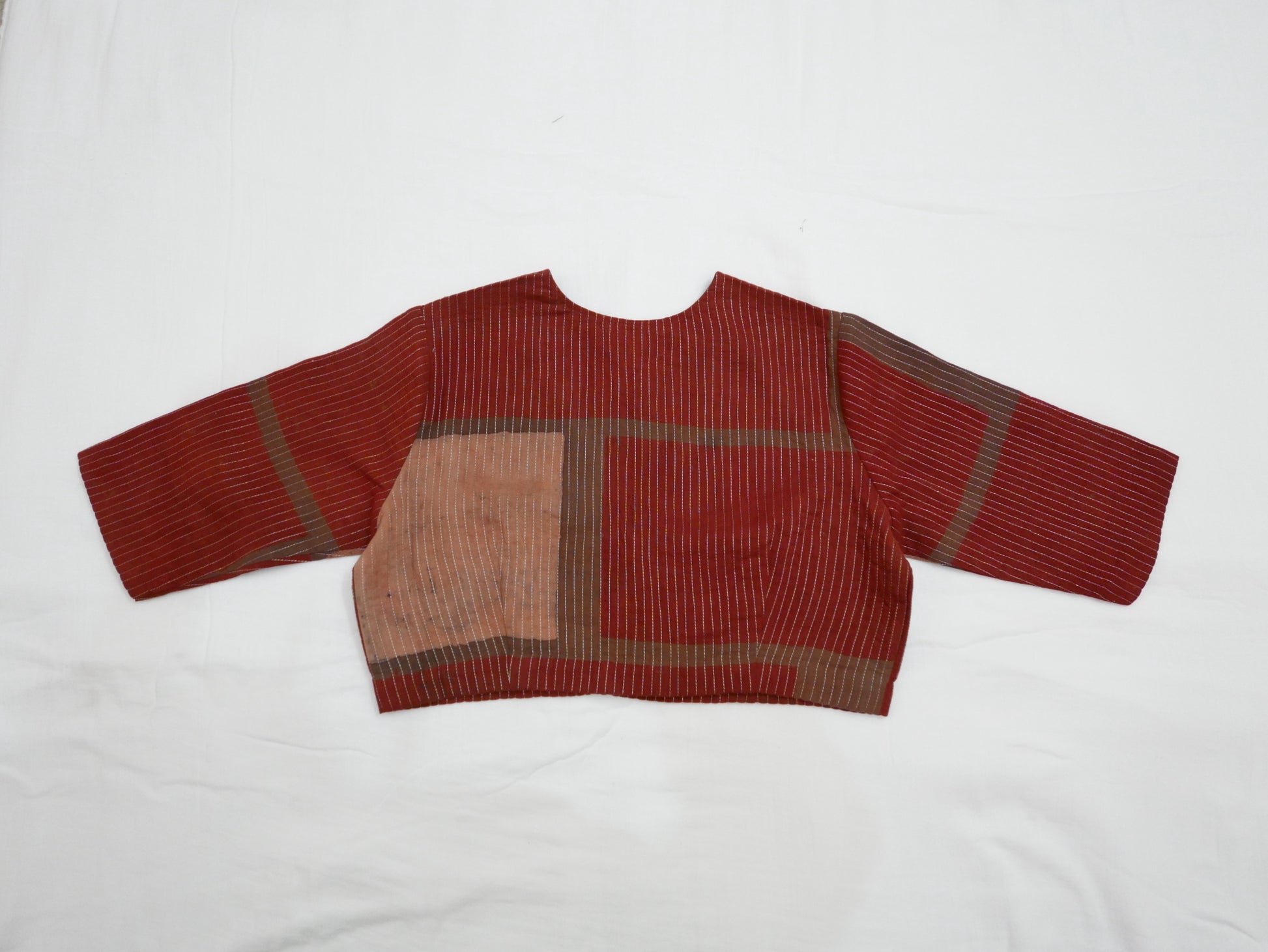 This blouse features a luxurious quilted design with a unique blend of beige and red print in Ajrakh technique. Hand-printed and painted on handwoven cotton, it is elegantly quilted with zari thread for a gorgeous look. Crafted with care and detail, this blouse is a stunning addition to any wardrobe.