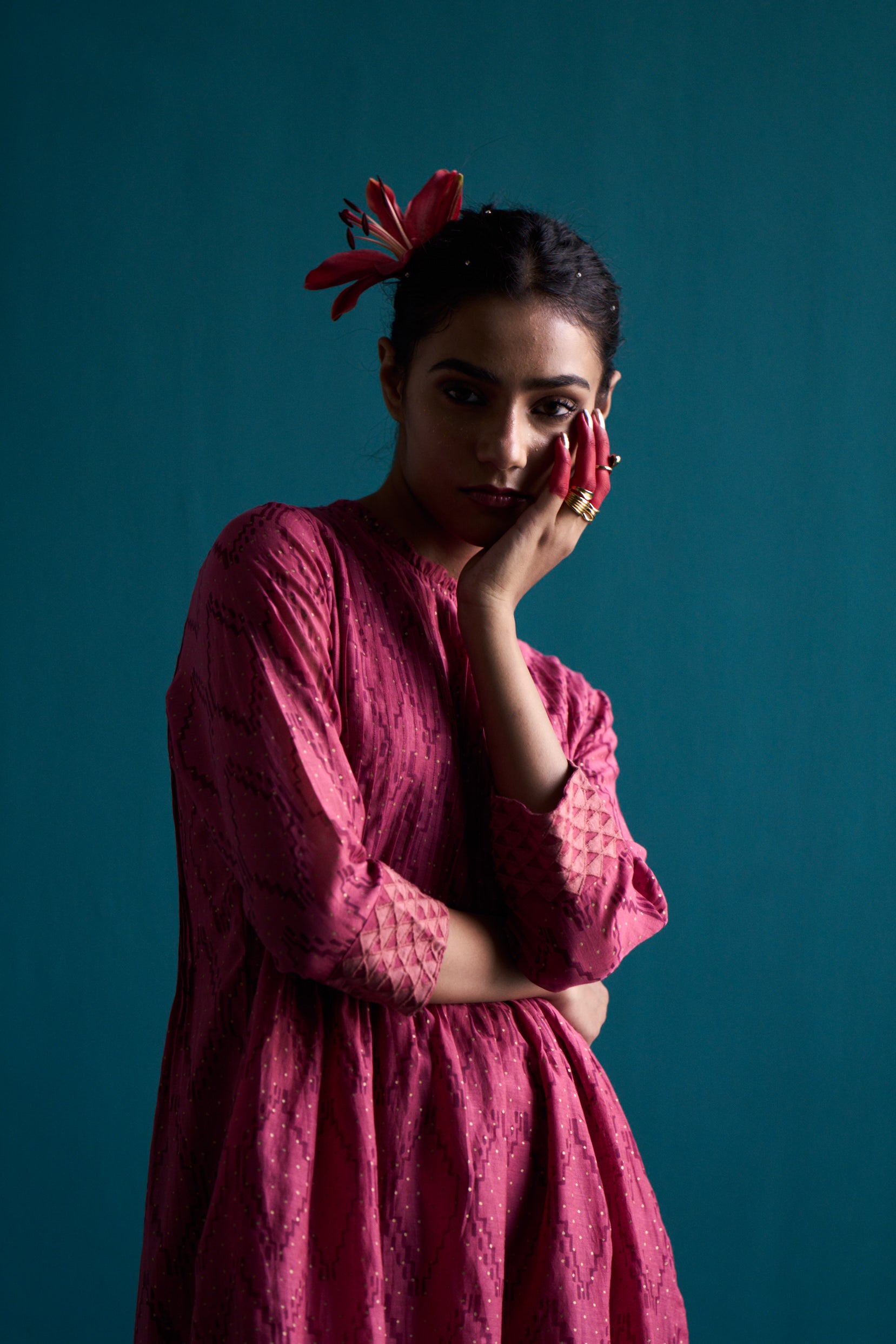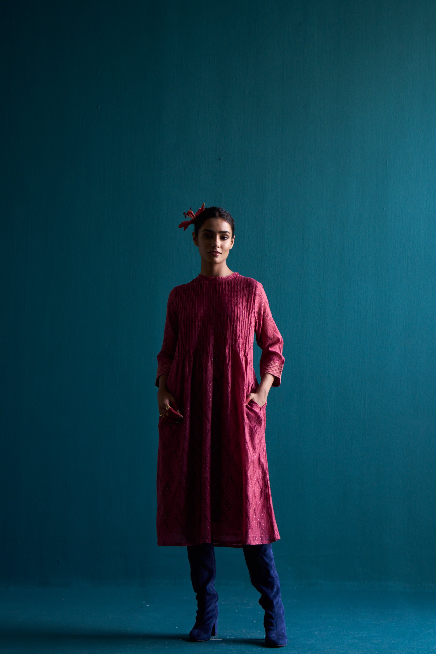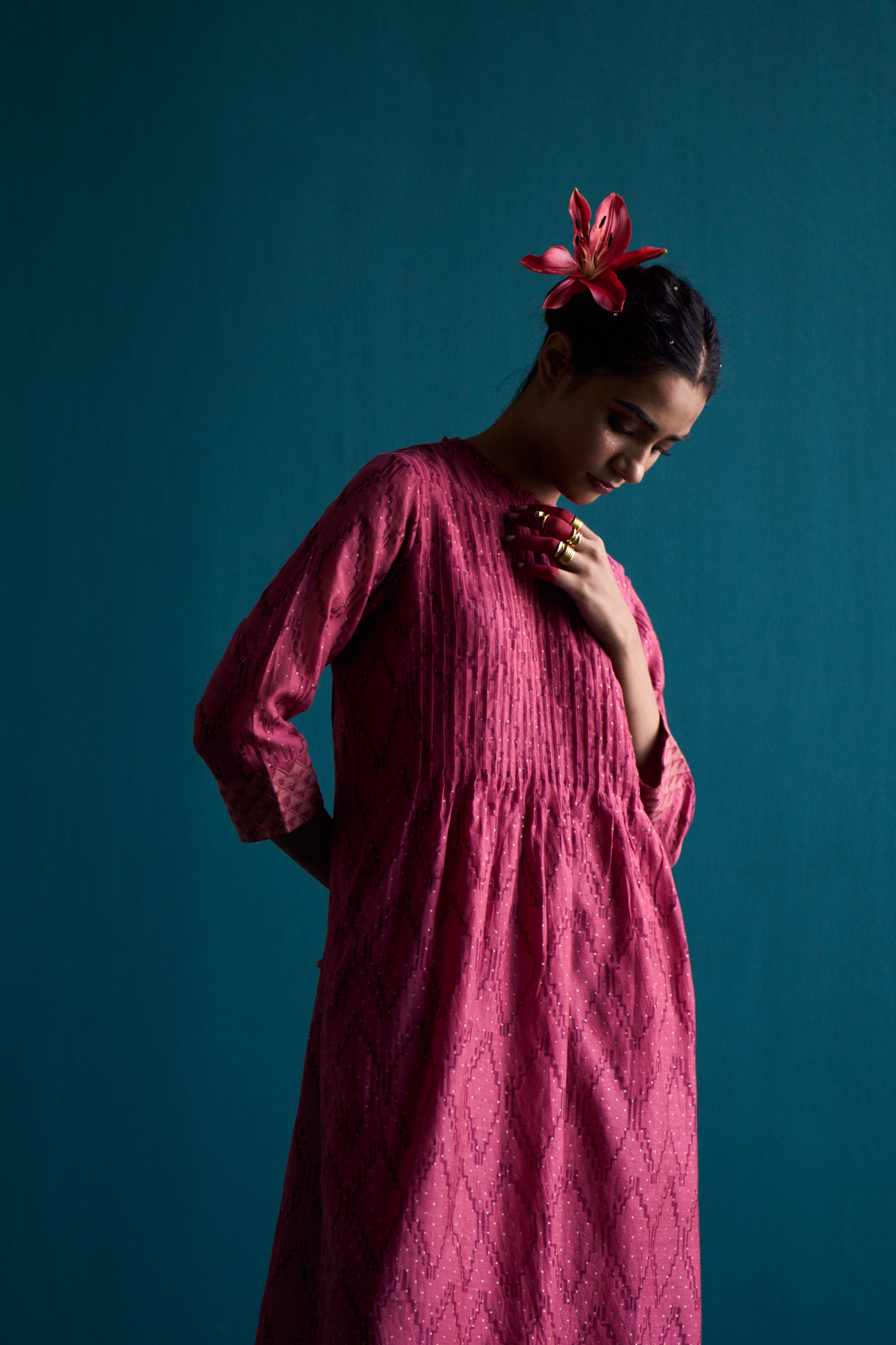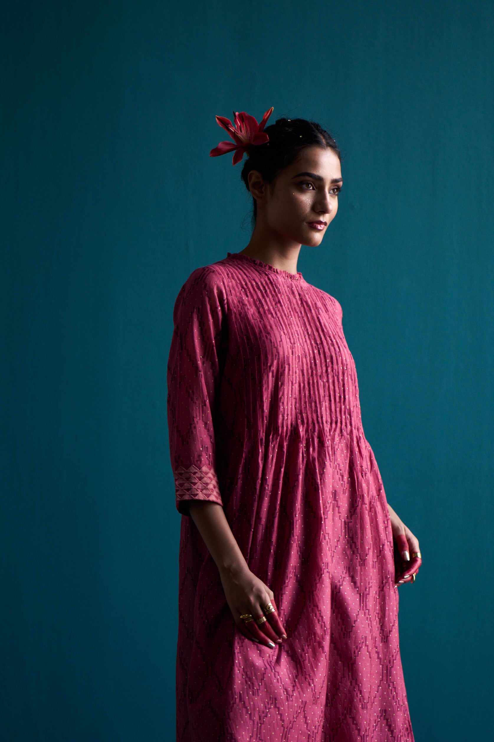 Introducing our Welkin classic pintuck dress. Made with hand block printed silk cotton with applique details on sleeve, this dress exudes a timeless elegance. The neck ruffle detail adds a touch of femininity, making it a versatile piece for any occasion. Elevate your style with our classic pintuck dress.