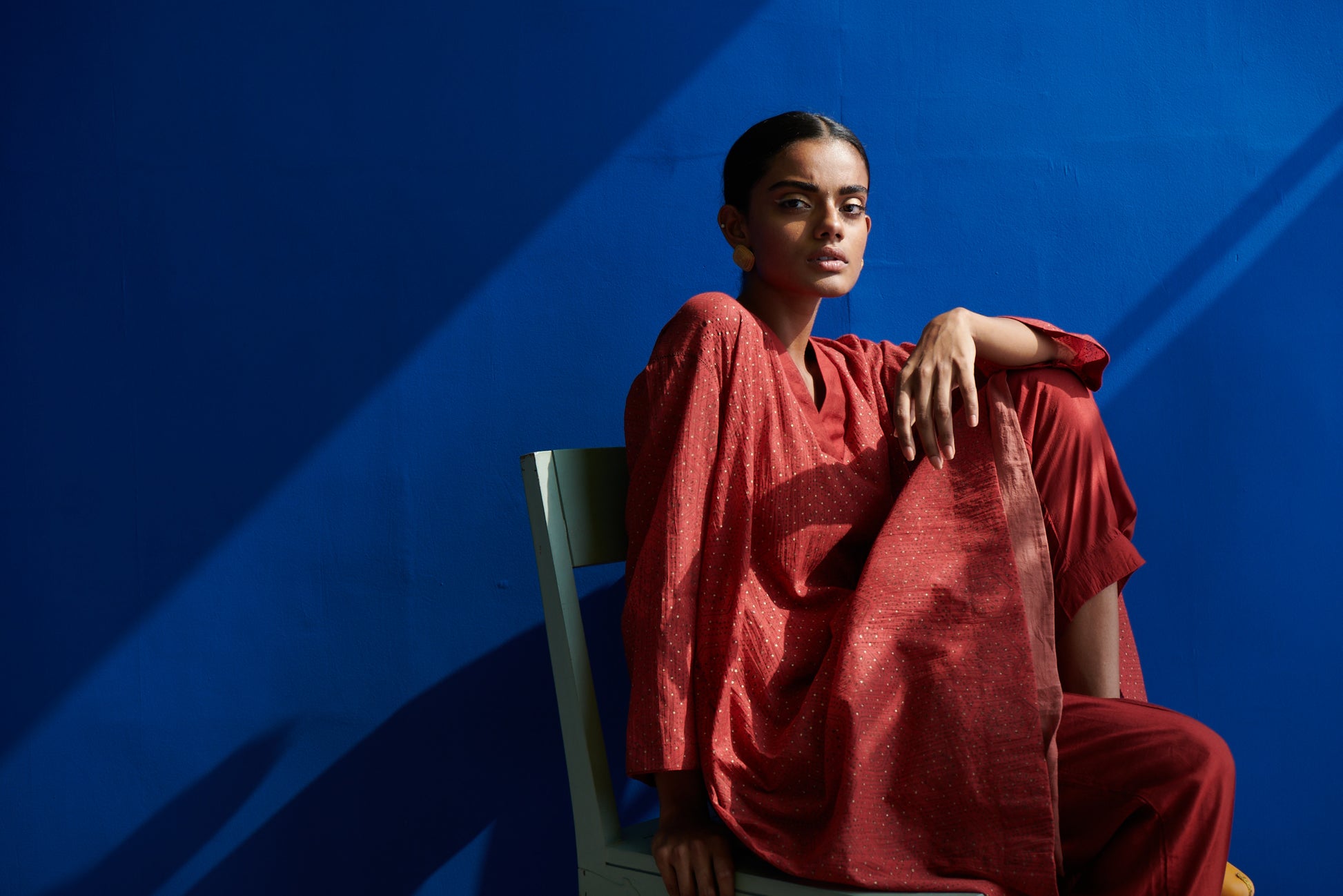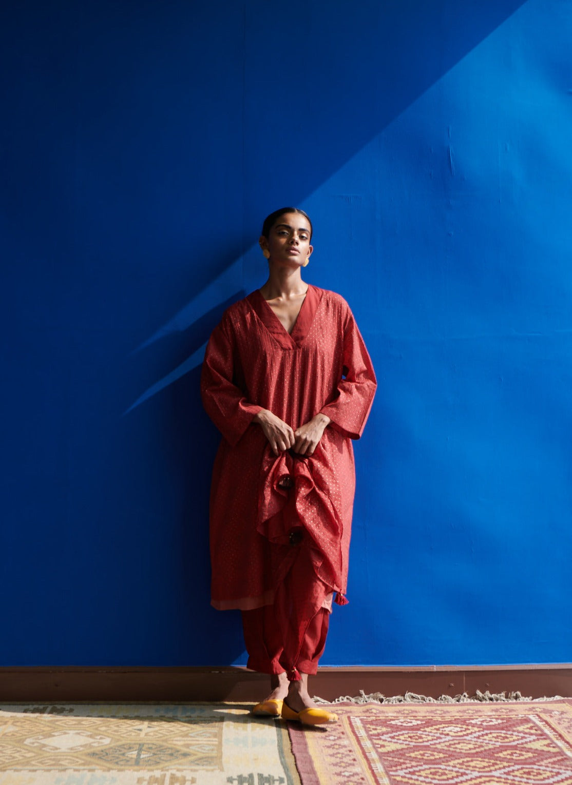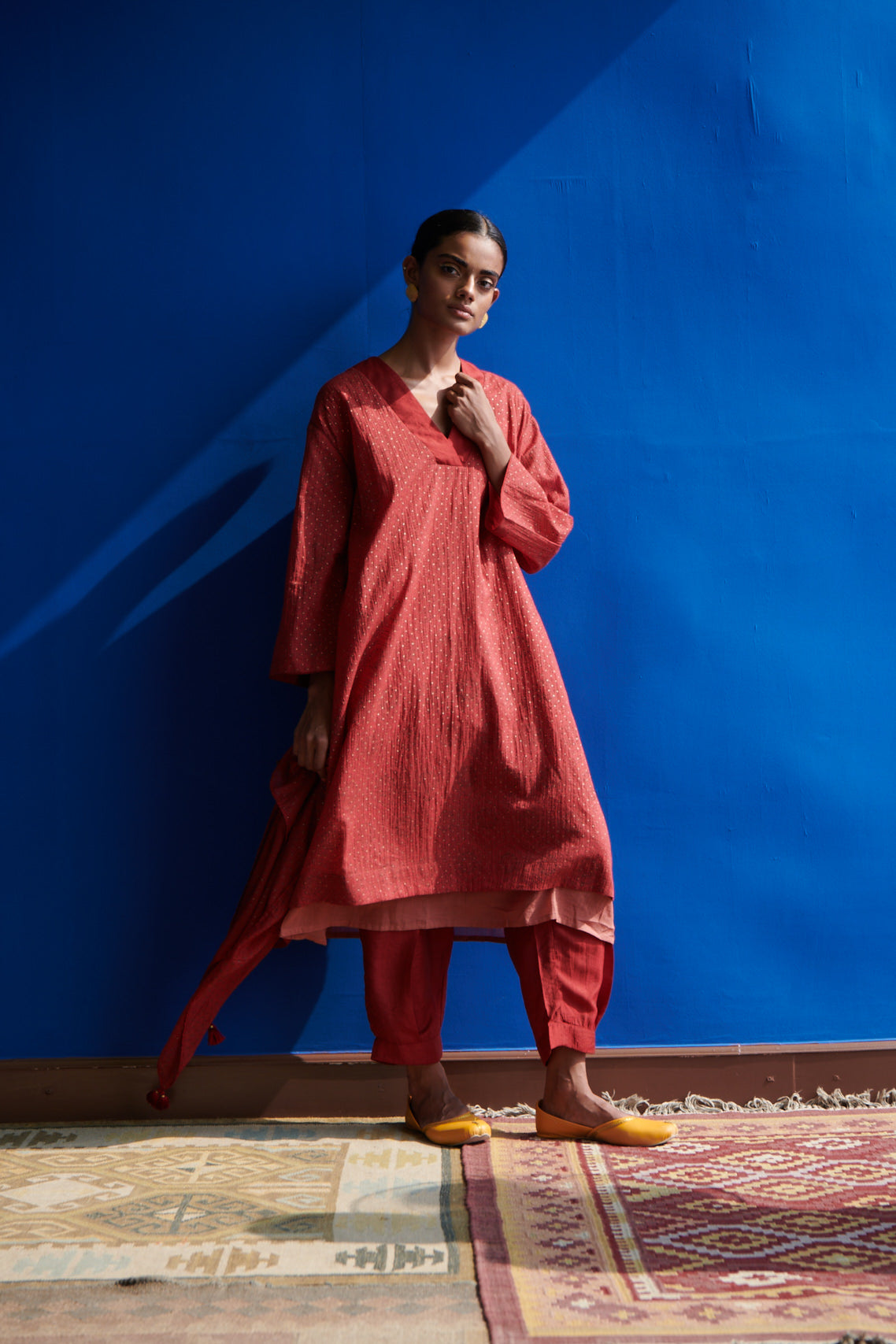 The Yucatan kurta in fine mulmul with beautiful gold hand block print and fine stitching details is diaphanous and light. The bold V neck band and slightly easy fit drop shoulders, add to the style quotient and rephrases the modern kurta. Feel luxe, light and almost weightless in this hand crafted garment made with love and care.